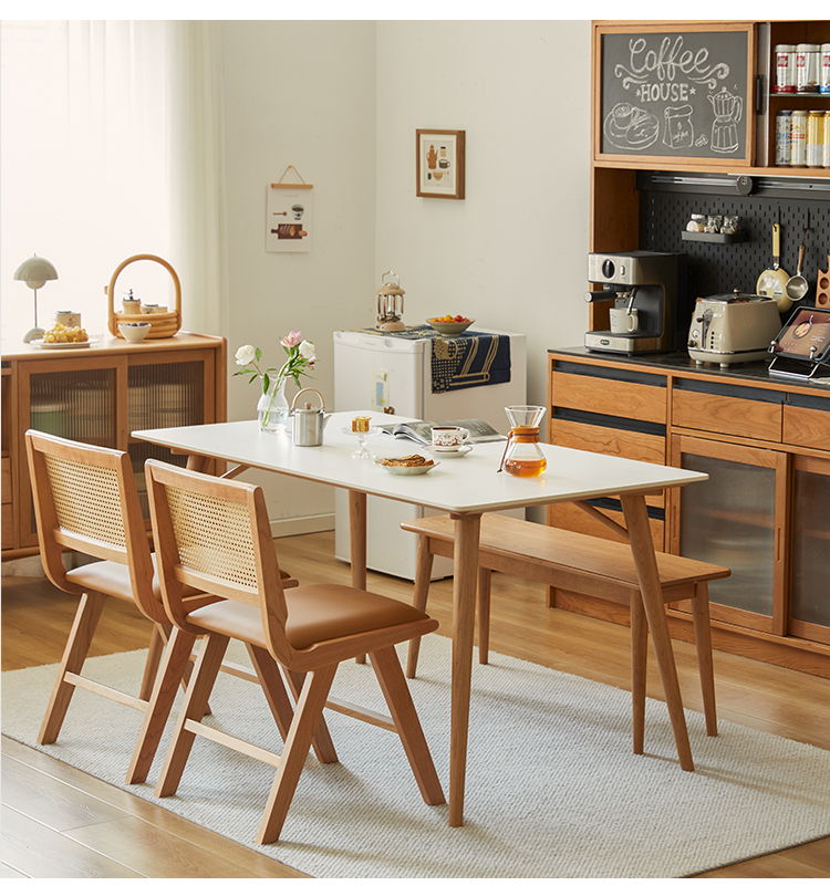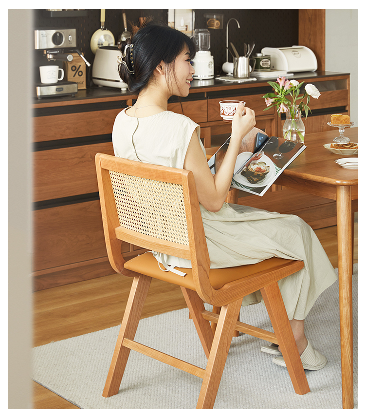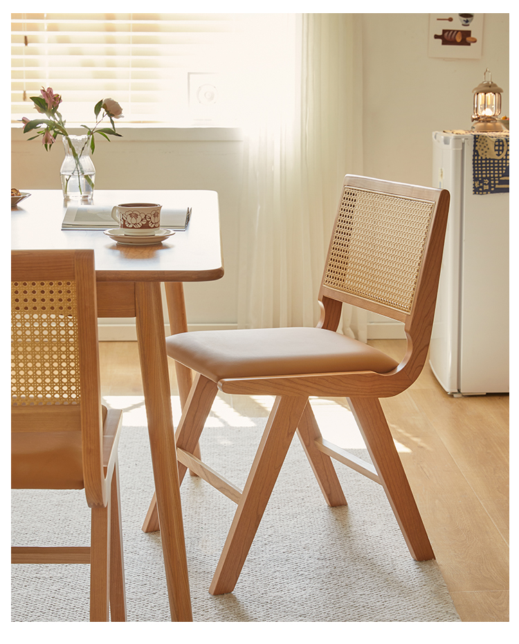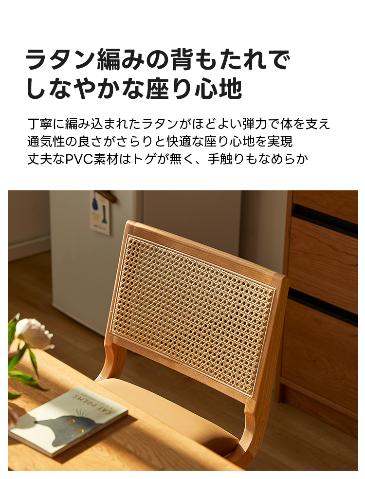 - 【異素材の組み合わせで高級感】ラタンと合皮を巧みに組み合わせたデザインが特徴のダイニングチェア。自然な通気性と快適な座り心地を提供し、どんなインテリアにも調和します。