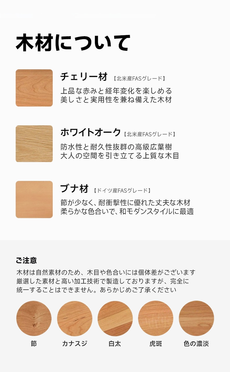 - 【自然な風合いと色合い】チェリー材とホワイトオーク材の自然な風合いが、お部屋にナチュラルな雰囲気をプラスします。木材の個体差により、唯一無二の表情を楽しむことができます。