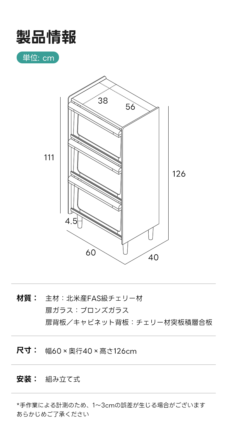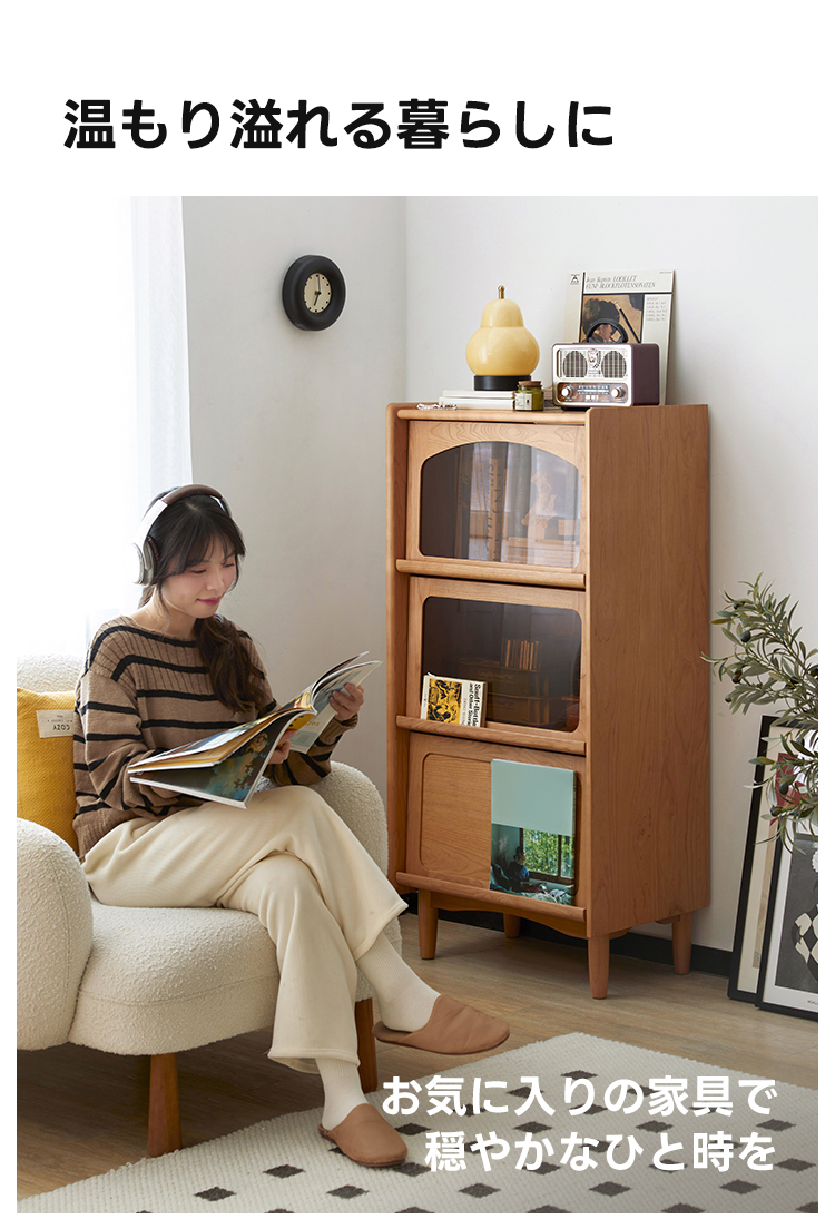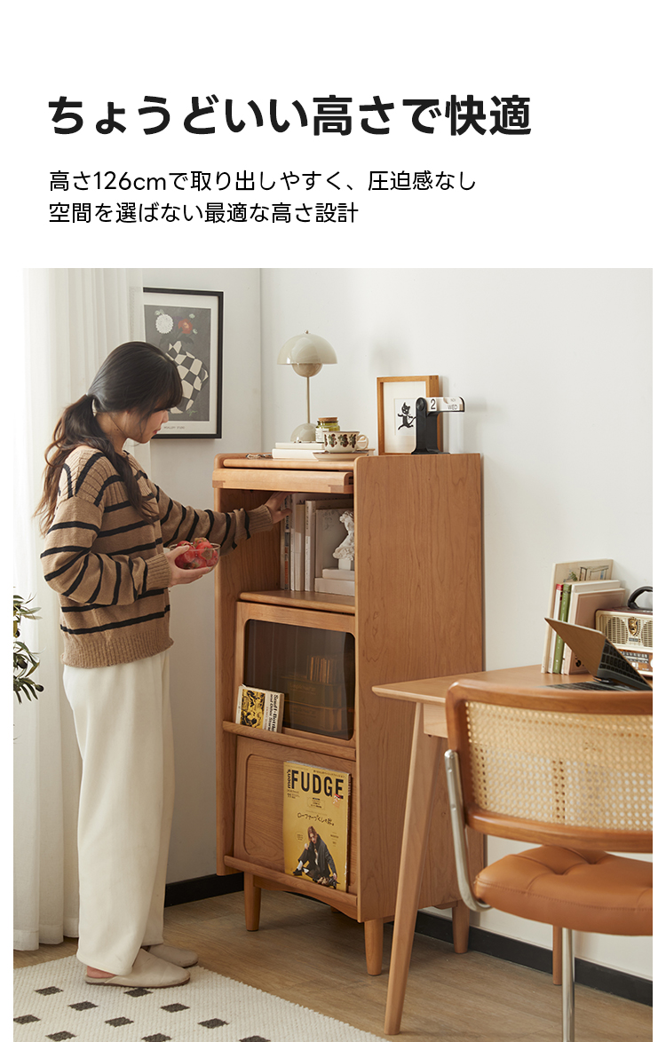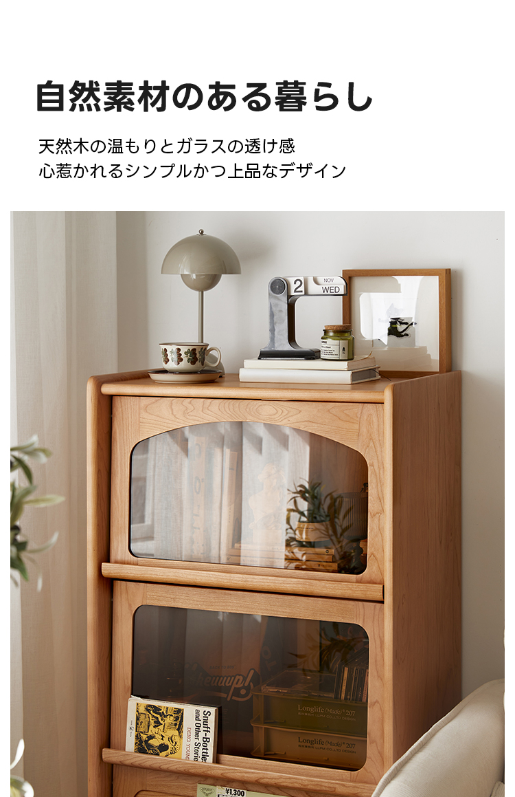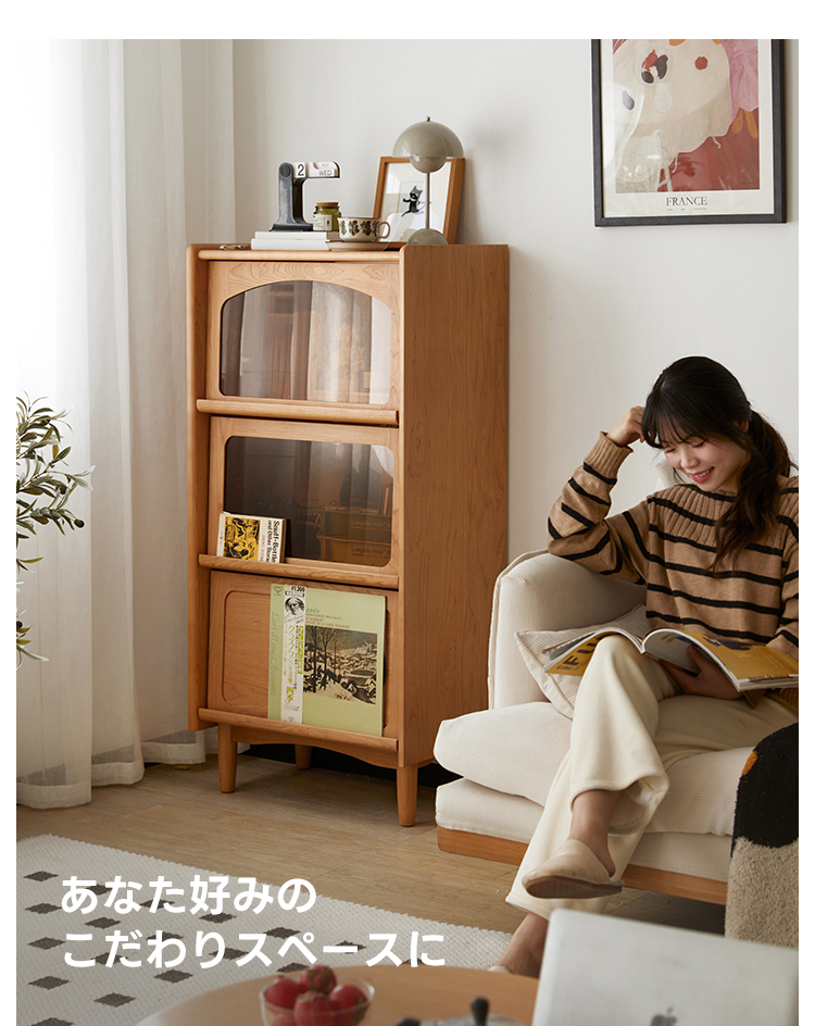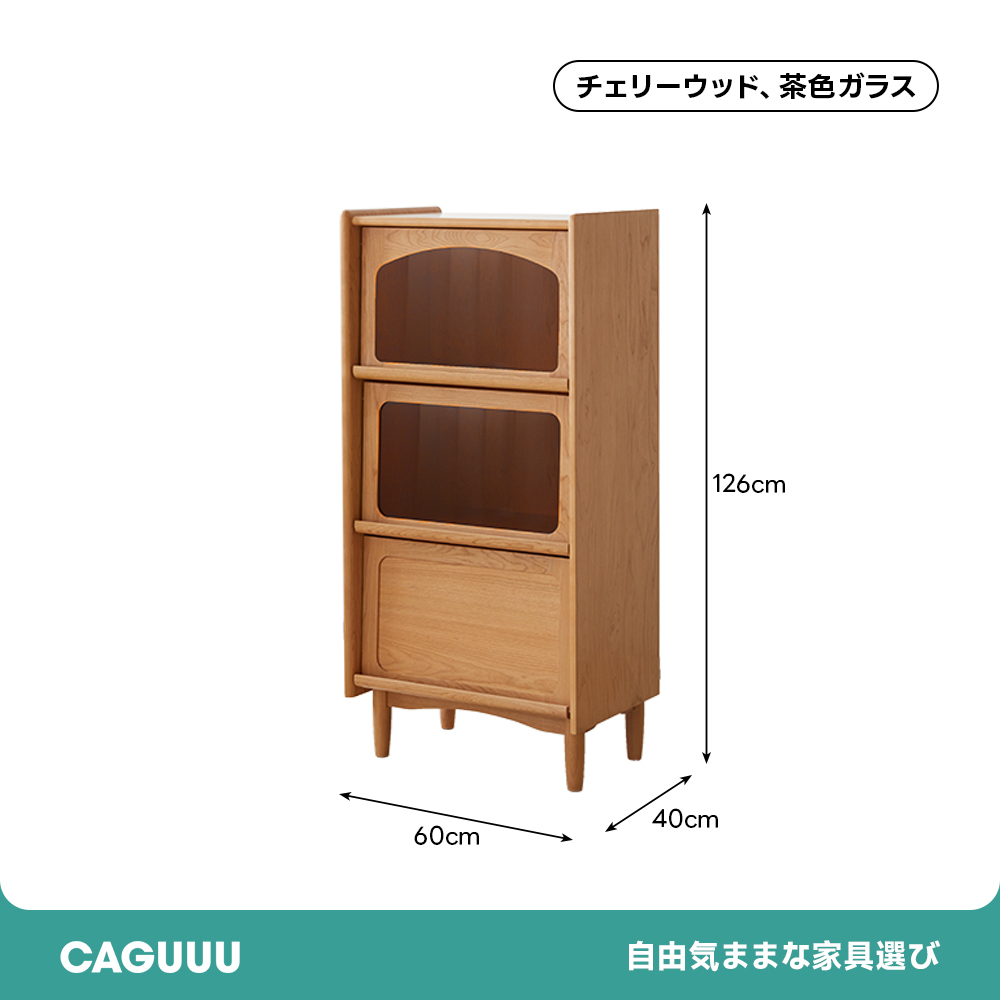 - 【優れた収納力とデザイン性】:チェリー材 ナチュラル3段キャビネットは、幅60cm、奥行40cm、高さ126cmのコンパクトなサイズながら、3段の収納スペースを提供。スライドイン扉とブロンズガラスを採用し、インテリアとしても美しく、収納物を魅力的に見せます。
