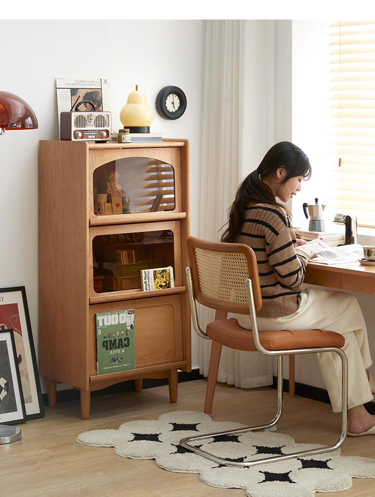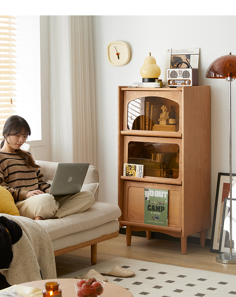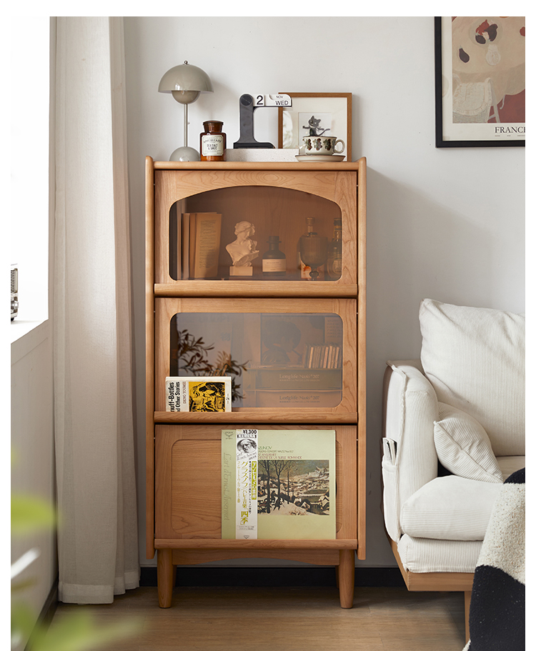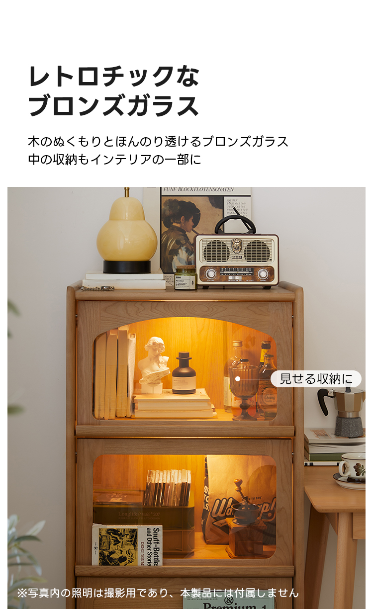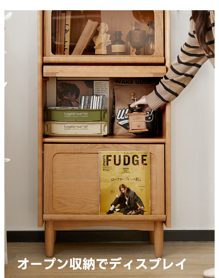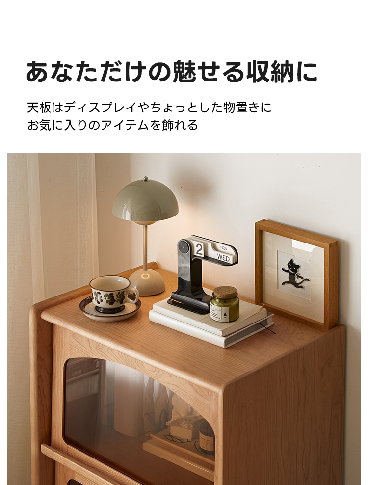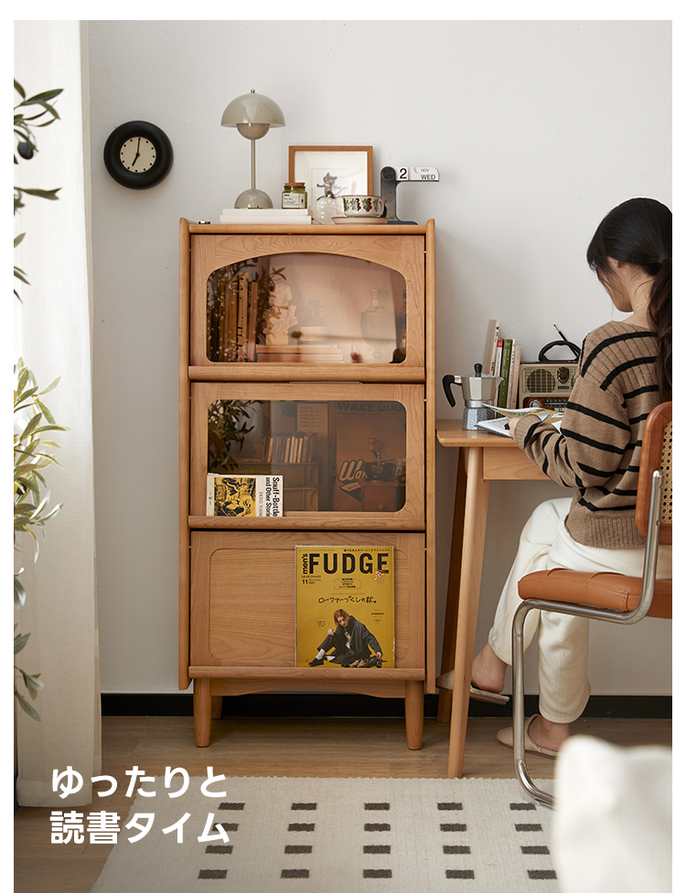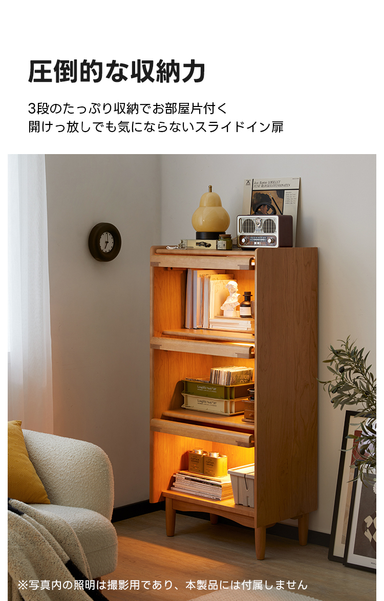 - 【優れた収納力とデザイン性】:チェリー材 ナチュラル3段キャビネットは、幅60cm、奥行40cm、高さ126cmのコンパクトなサイズながら、3段の収納スペースを提供。スライドイン扉とブロンズガラスを採用し、インテリアとしても美しく、収納物を魅力的に見せます。