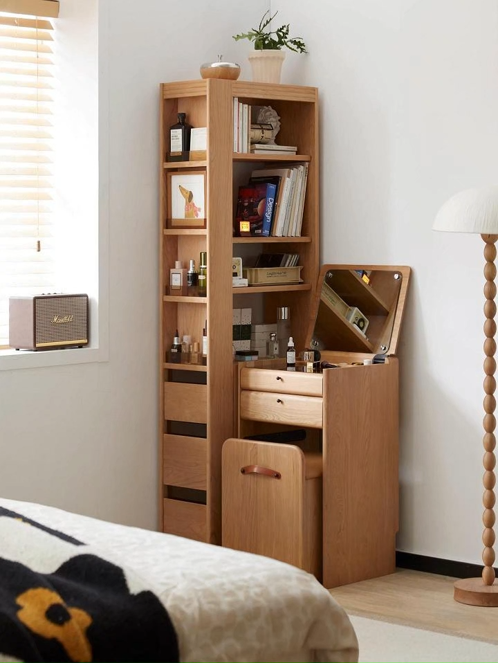 - 【多機能収納で整理整頓が簡単】チェリー材スリムサイズシェルフは、上部に4段のオープン収納、下部に3段の引き出しを備えています。棚板の高さは調整可能で、お気に入りの本やアイテムをディスプレイするのに最適です。狭いスペースでも有効に活用できるコンパクトなデザインが特徴です。