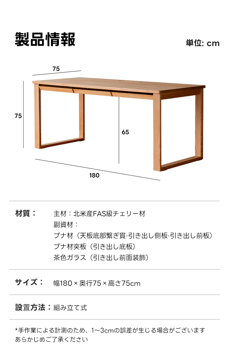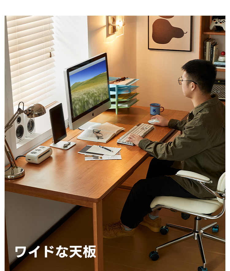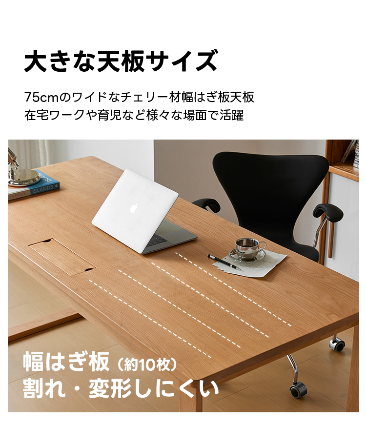 - 【広々とした天板で快適作業】:チェリー材 ナチュラルワイドデスクは、幅180cm、奥行75cmの広々とした天板を備え、パソコンや書類を広げても余裕があります。仕事や勉強に最適で、快適な作業環境を提供します。