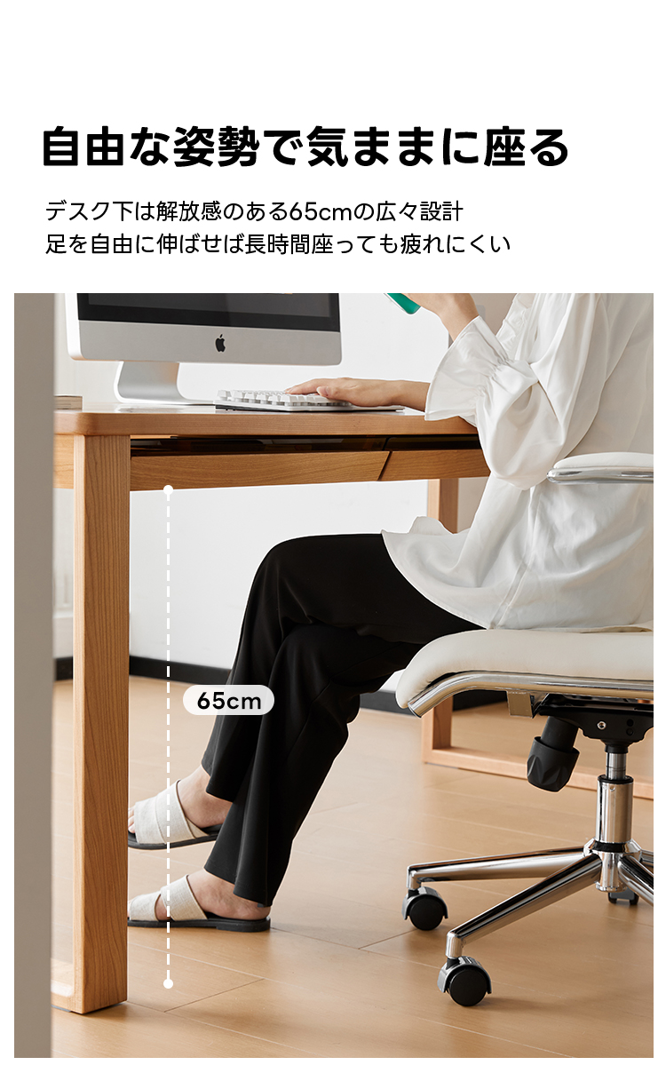 - 【快適な座り心地と収納力】:デスク下は65cmの広さがあり、足を自由に伸ばせるため、長時間の作業でも疲れにくい設計です。3つの引き出しで文具や小物をスッキリ整理整頓できます。