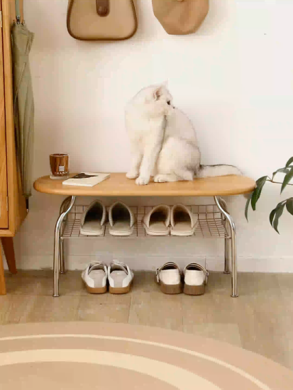 - 【高級感あふれる素材とデザイン】このシューズベンチは、北米産FAS級チェリー材を使用し、滑らかな木目が高級感を演出します。ステンレス製の脚部は美しさと耐久性を兼ね備え、長く愛用できるデザインです。