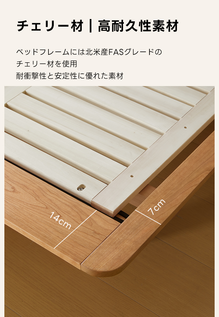 - 【シンプルで高機能なデザイン】シンプルフラットベッドは、ナチュラルなデザインと高機能性を兼ね備えたベッドです。北米産FAS級チェリー材を使用し、耐衝撃性と安定性に優れた構造で、長期間にわたって安心してお使いいただけます。
