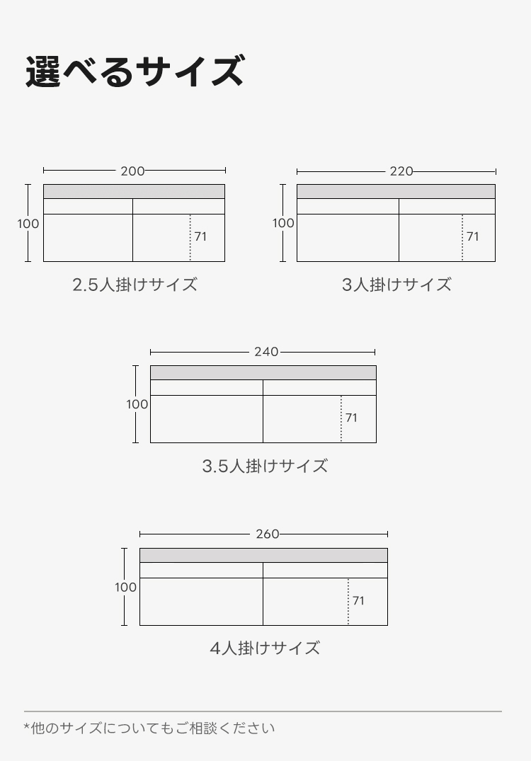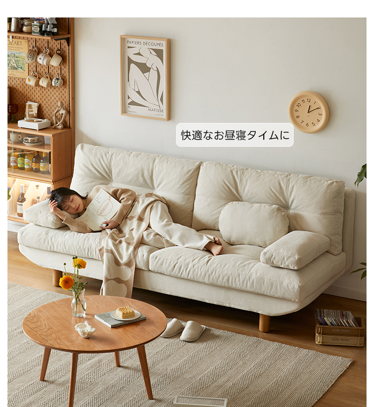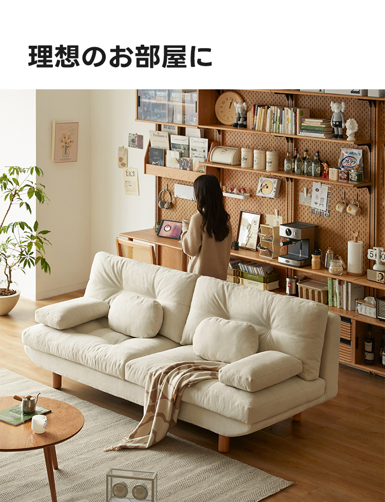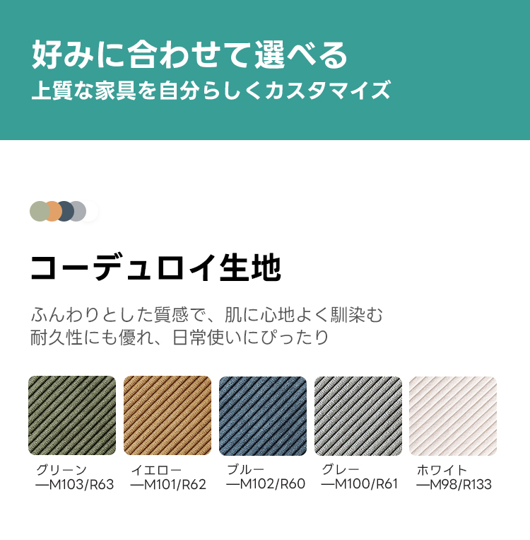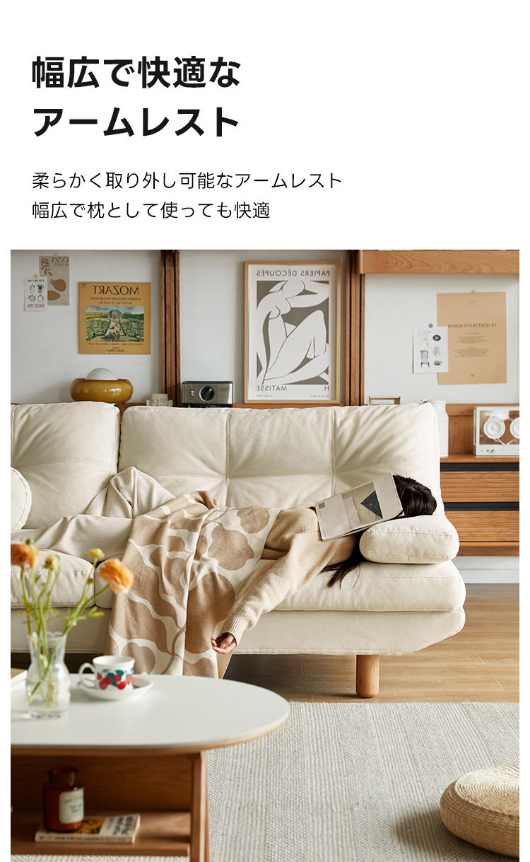 - 【カスタマイズ可能なオプション】:このソファはサイズや素材を自由に選べるカスタマイズオプションを提供しています。2.5人掛けから4人掛けまで選択可能で、コーデュロイ生地や洗いざらしコットン、マイクロファイバーなどの素材も選べます。
