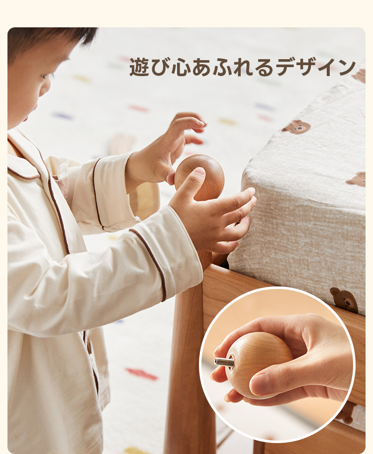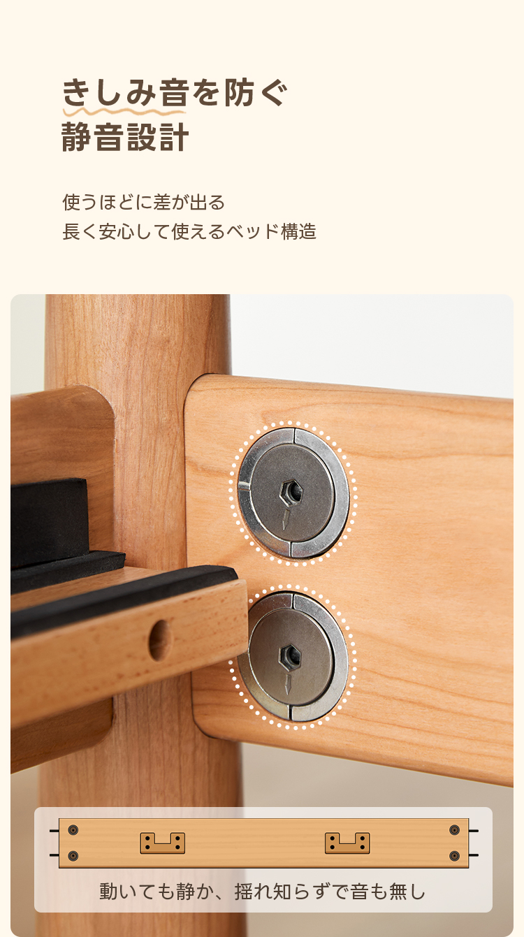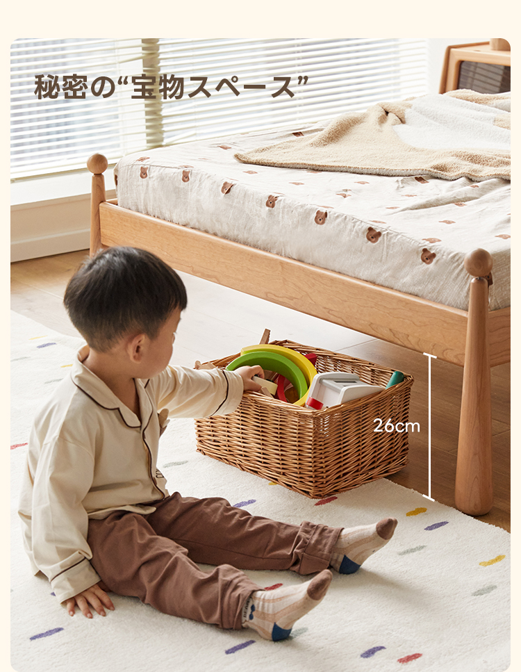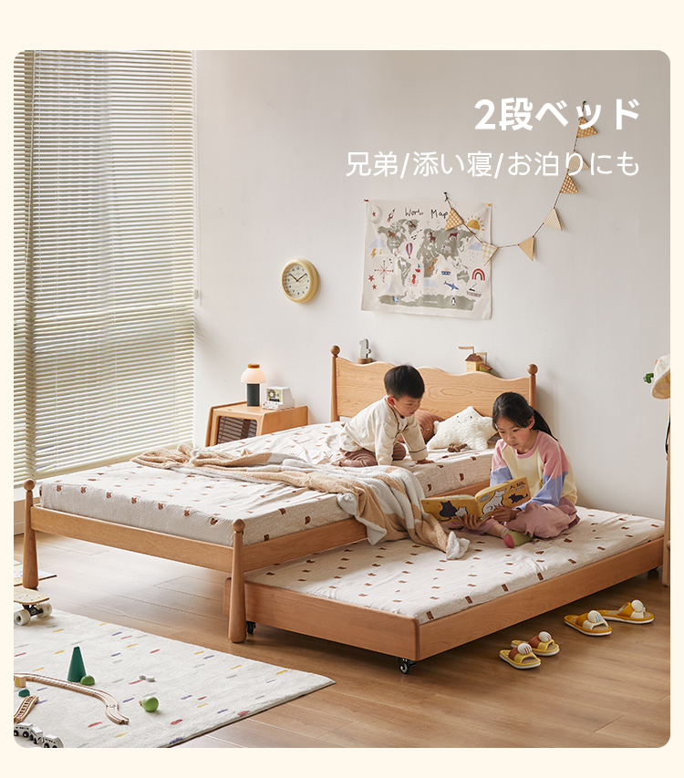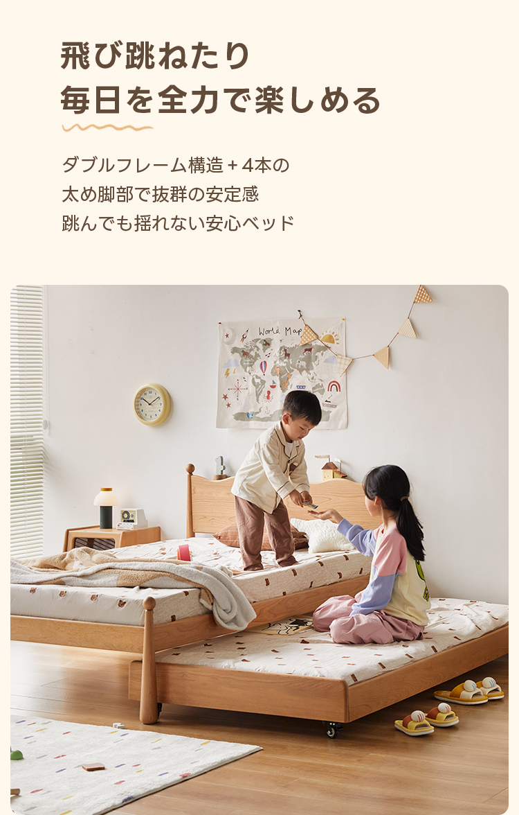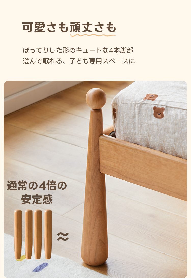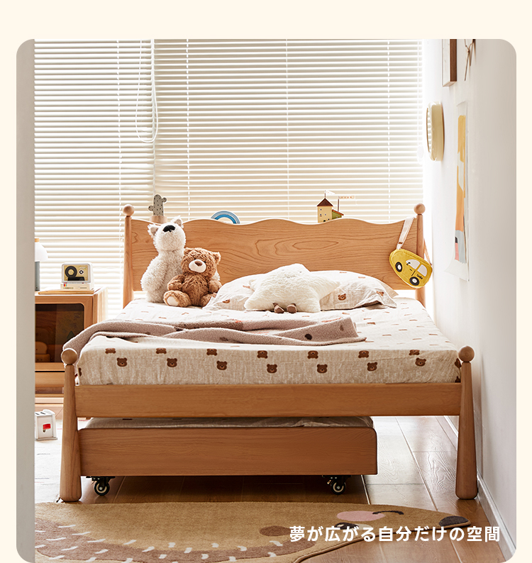- 【高品質な素材とデザイン】北米産のFAS級チェリー材とドイツ産のブナ材を使用し、自然な木目が美しく、どんなインテリアにもマッチします。波型のヘッドボードと丸みのある柱のデザインが特徴で、子どもから大人まで幅広く愛用できます。