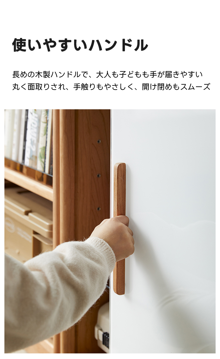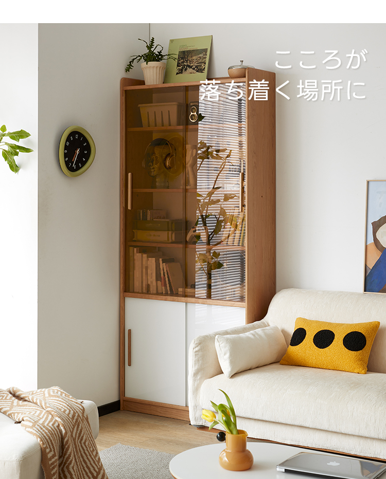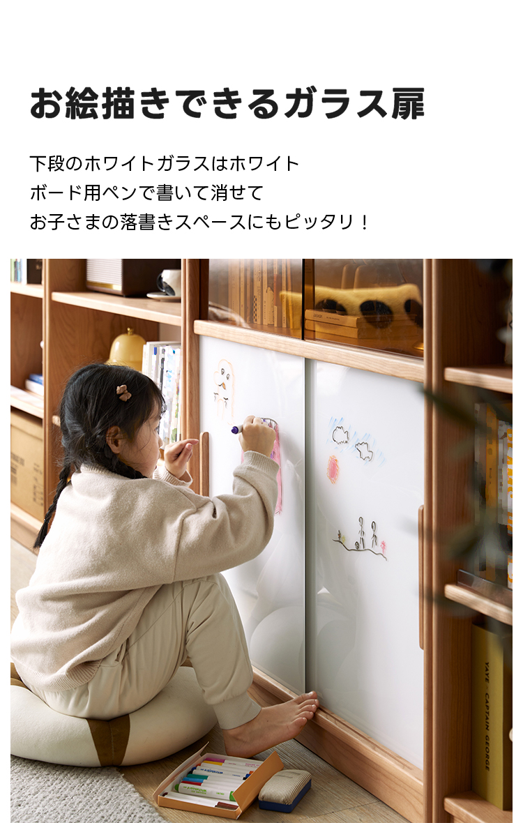 - 【多機能ガラス扉で魅せる収納】チェリー材を使用したガラス扉は、収納物をほこりから守りつつ、見せる収納としても活用できます。ブロンズとホワイトのガラスが調和し、インテリアに高級感をプラスします。下段のホワイトガラスはホワイトボード用ペンで書いて消せるため、お子様の落書きスペースとしても最適です。