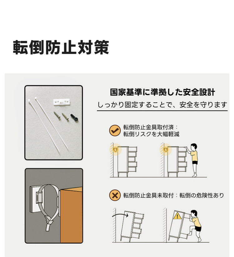 - 【安心の接地設計で安定性抜群】全面が床に接する構造で、接地面が広く安定性が高いため、安心してご使用いただけます。転倒防止金具付きで、国家基準に準拠した安全設計です。しっかり固定することで、安全を守ります。