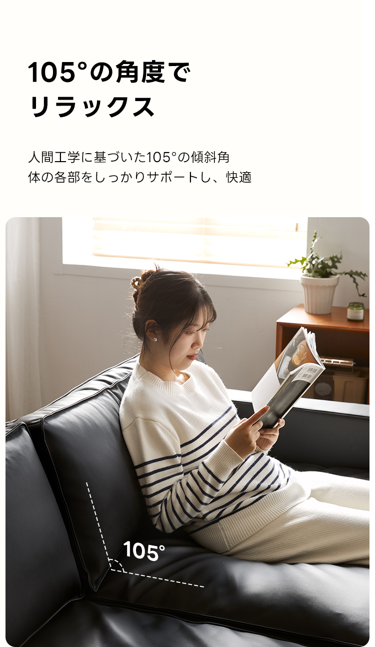 - 【人間工学に基づいた設計】:座面の奥行きは64cmで、背もたれを外すと最大81cmまで広がり、リラックスした姿勢をサポートします。人間工学に基づいた105°の傾斜角が、身体をしっかりと支え、快適な座り心地を提供します。