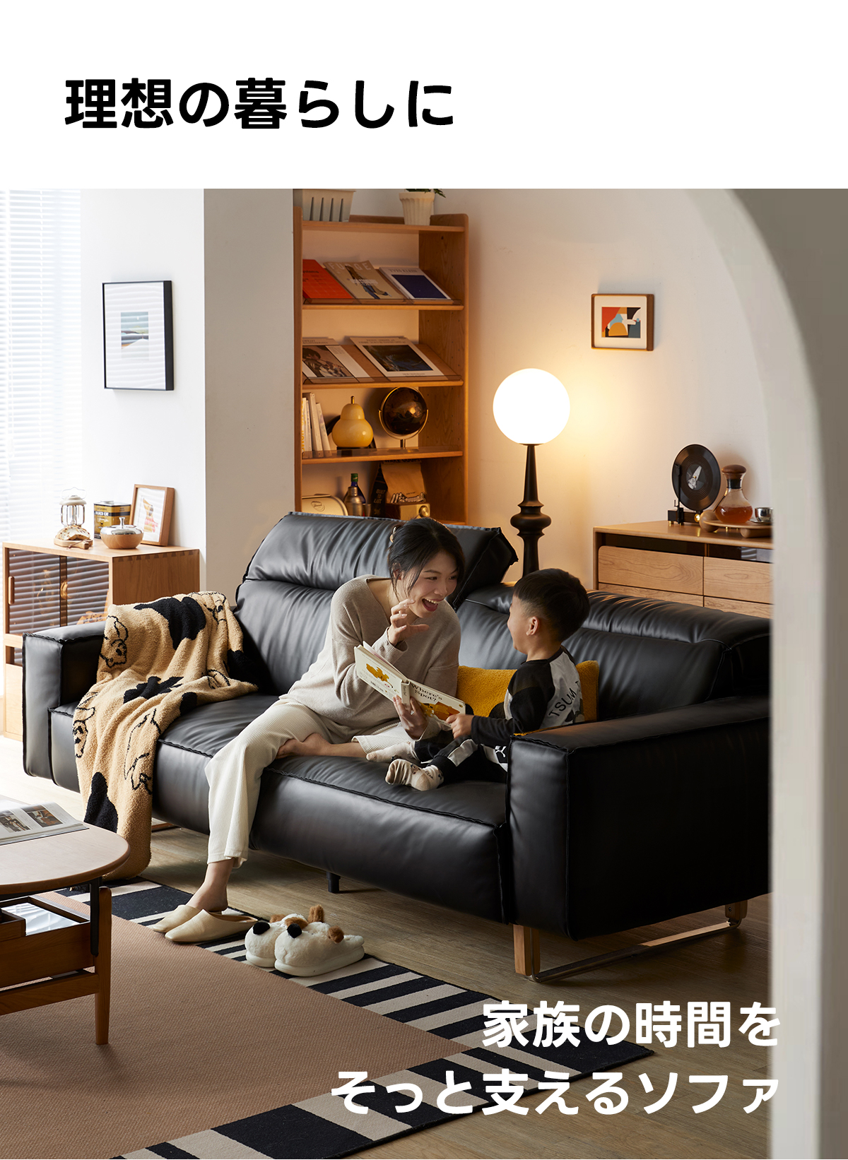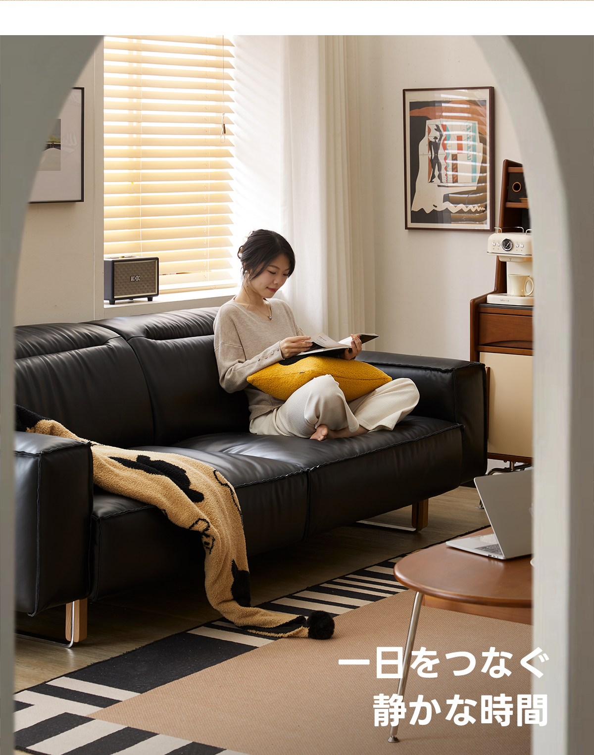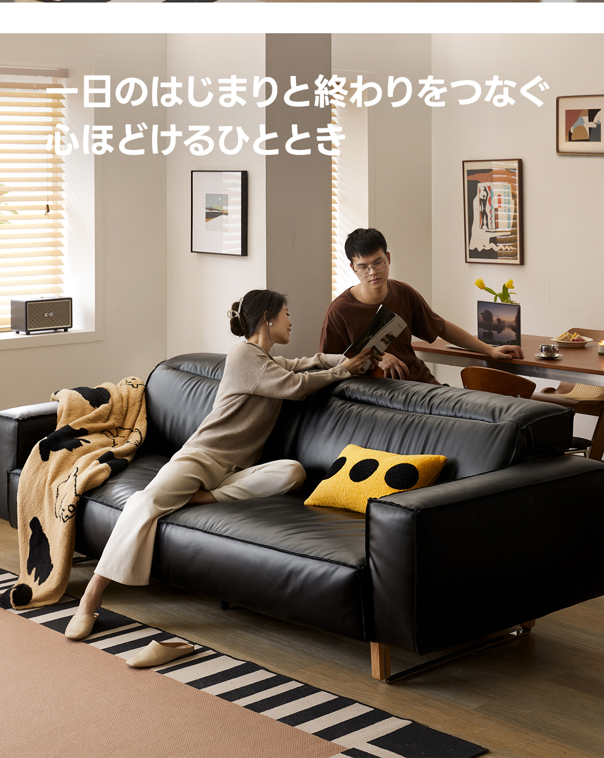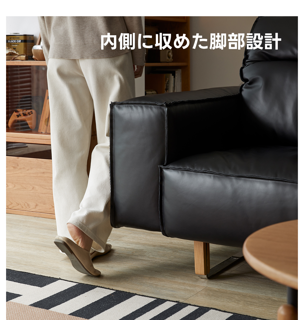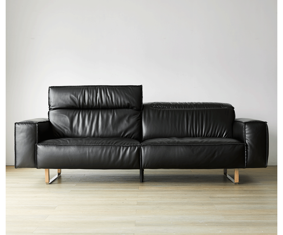 可動式ブラックレザー リビングソファ