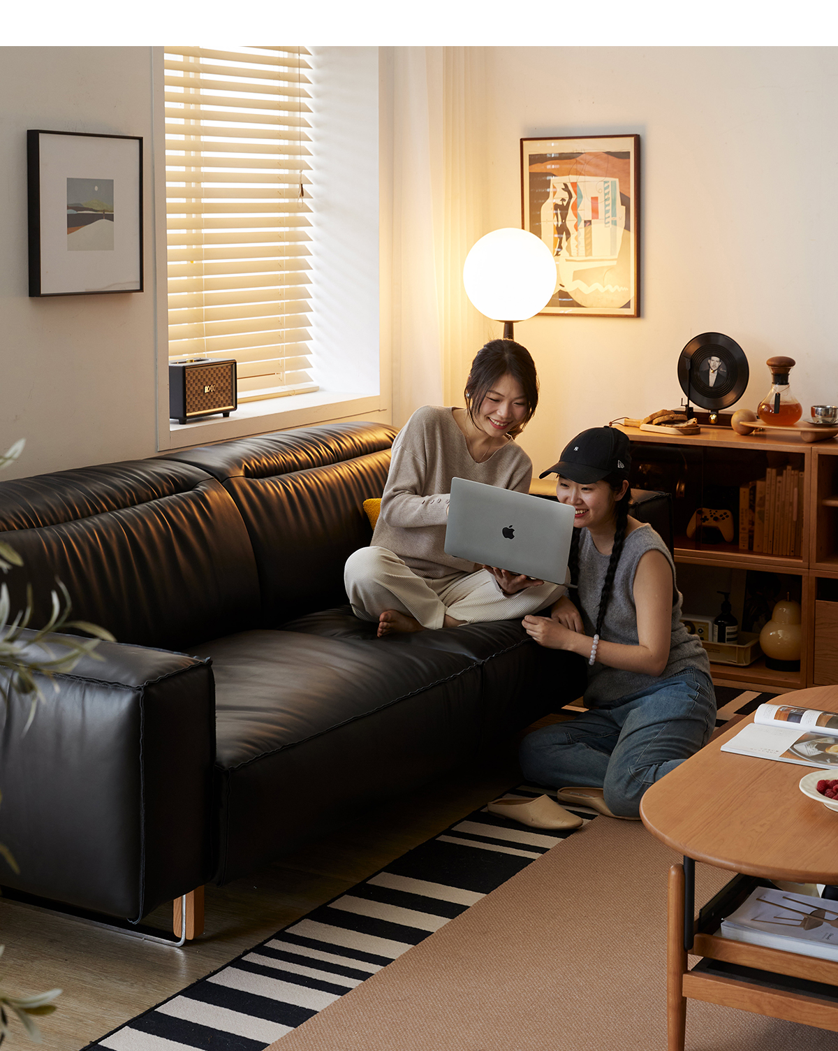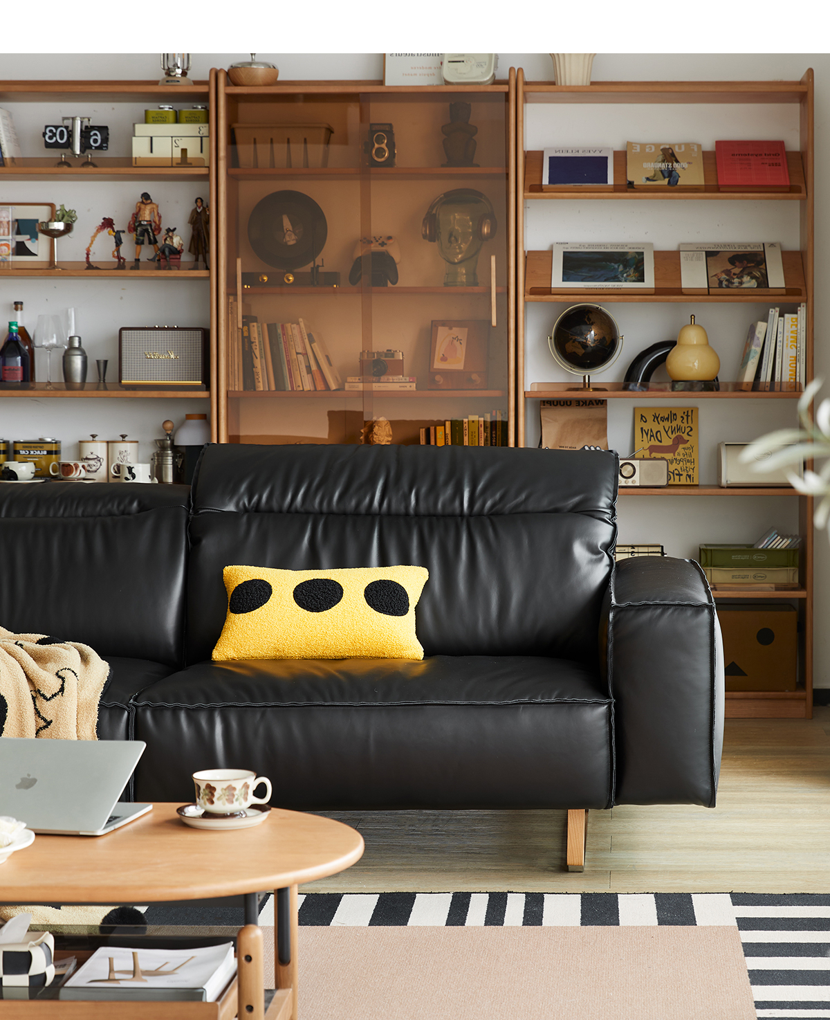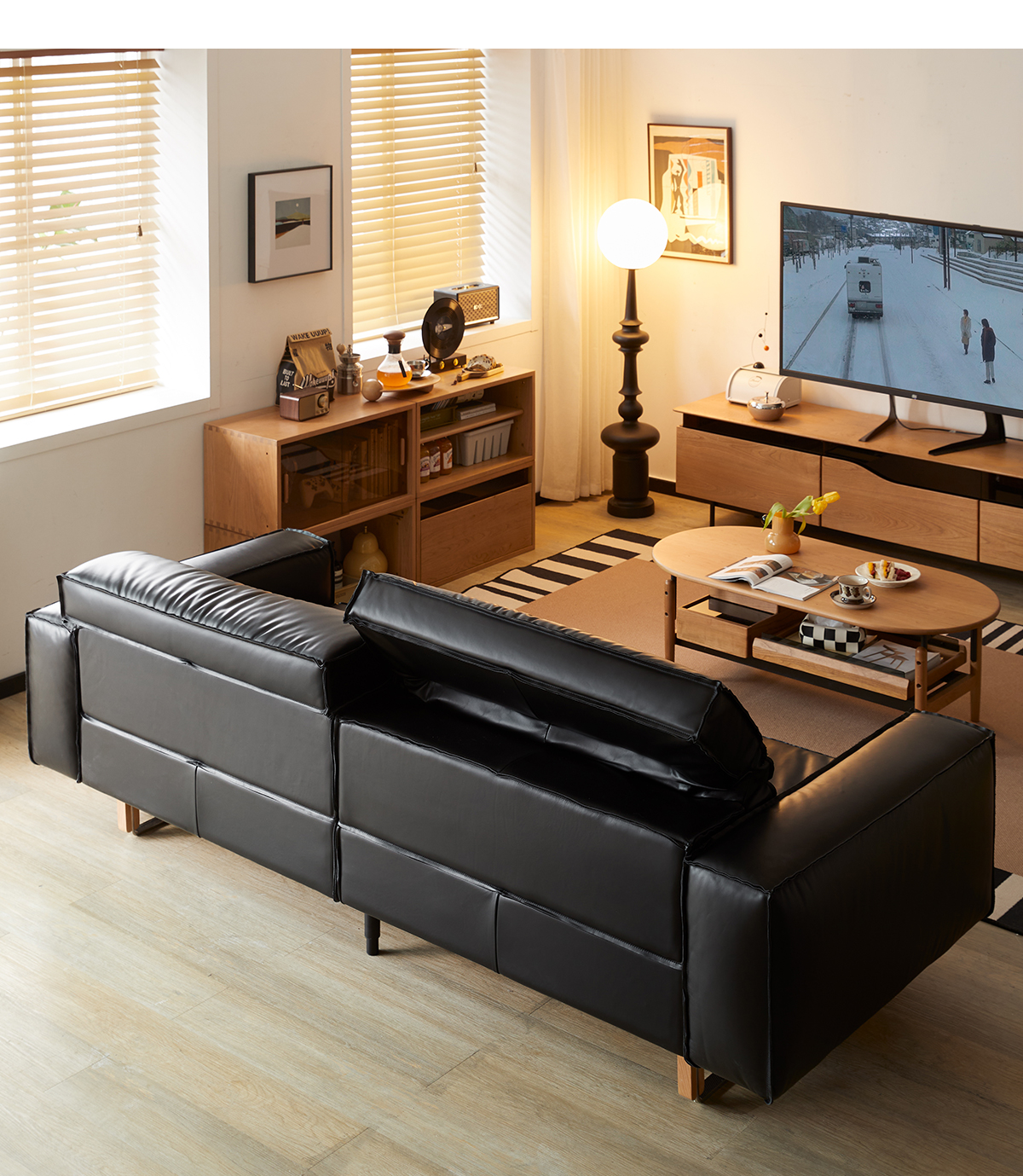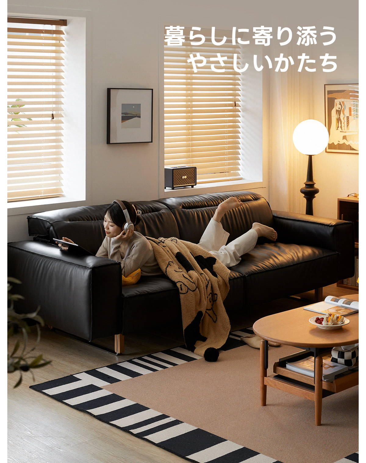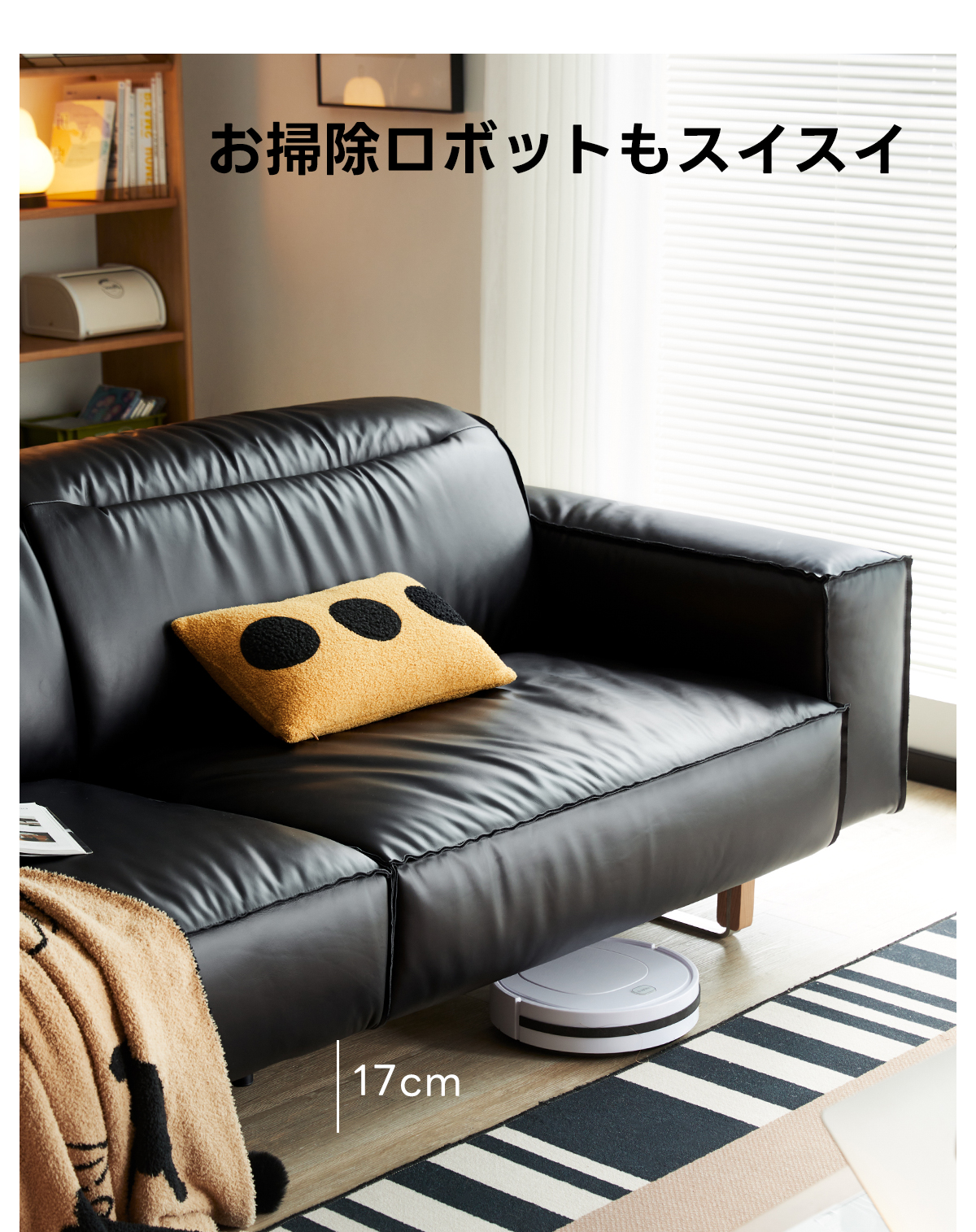 可動式ブラックレザー リビングソファ