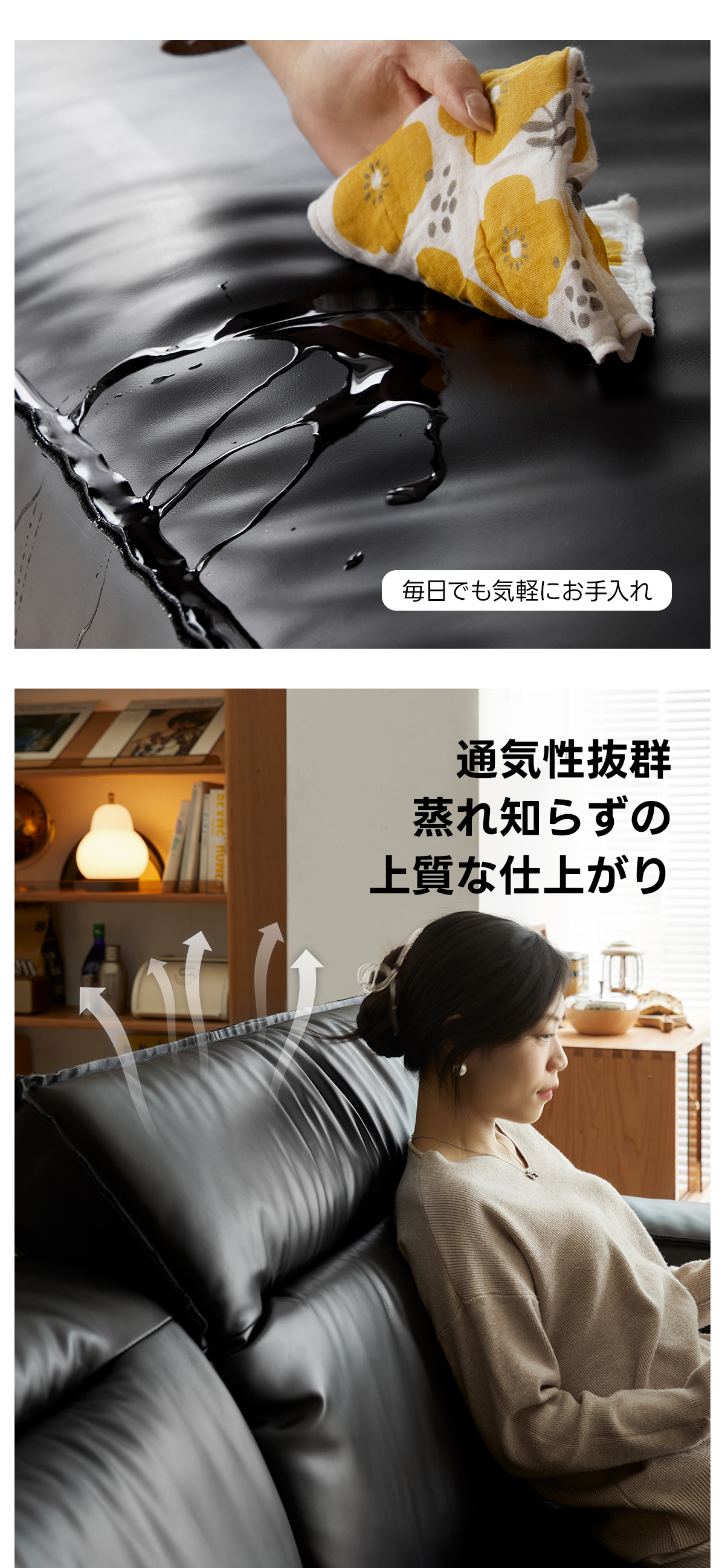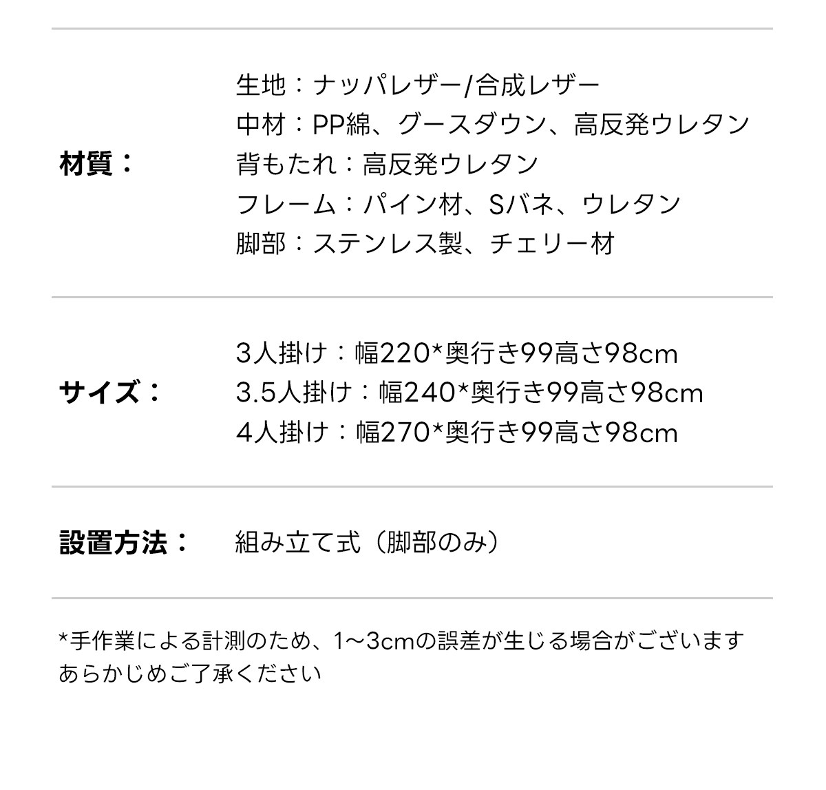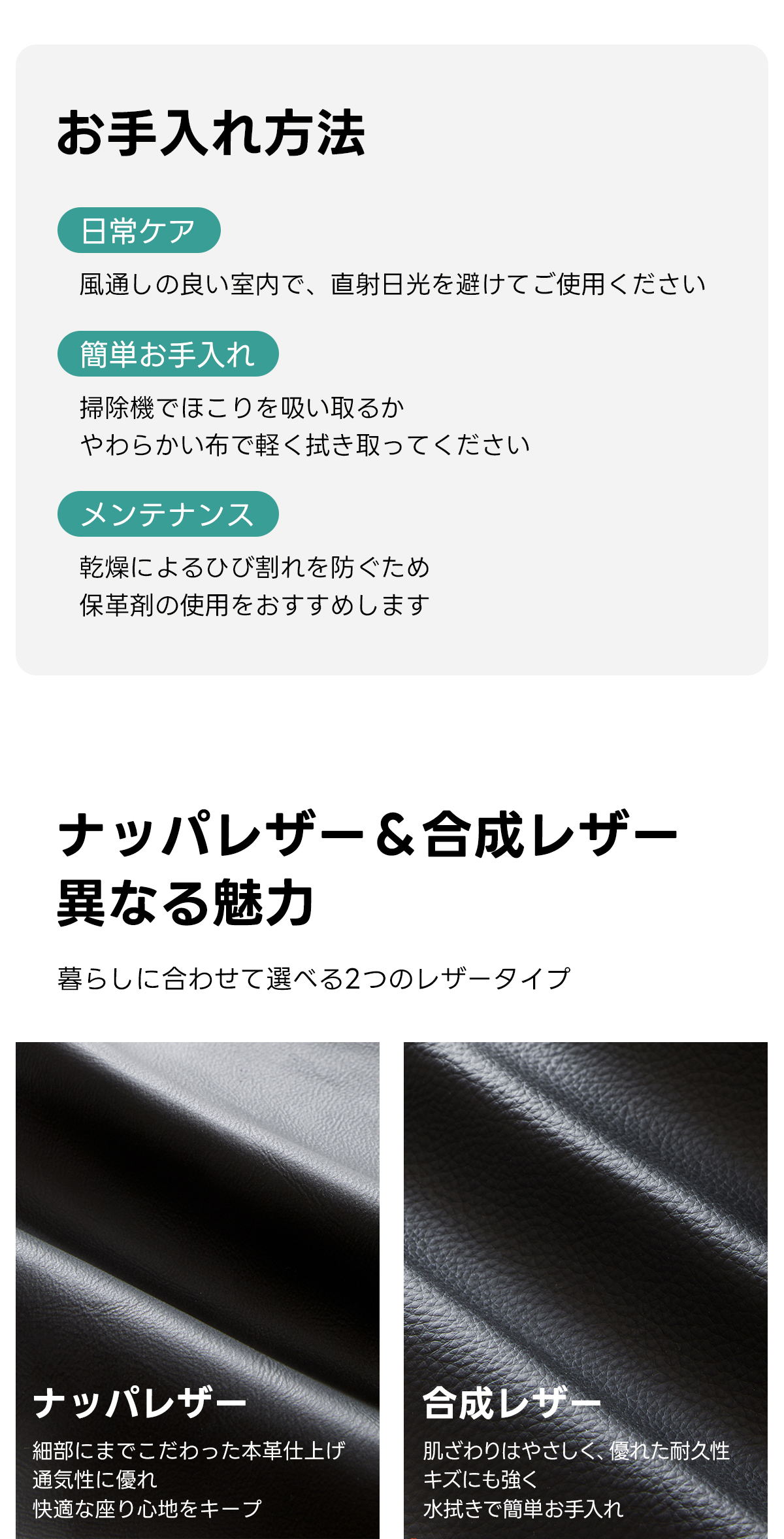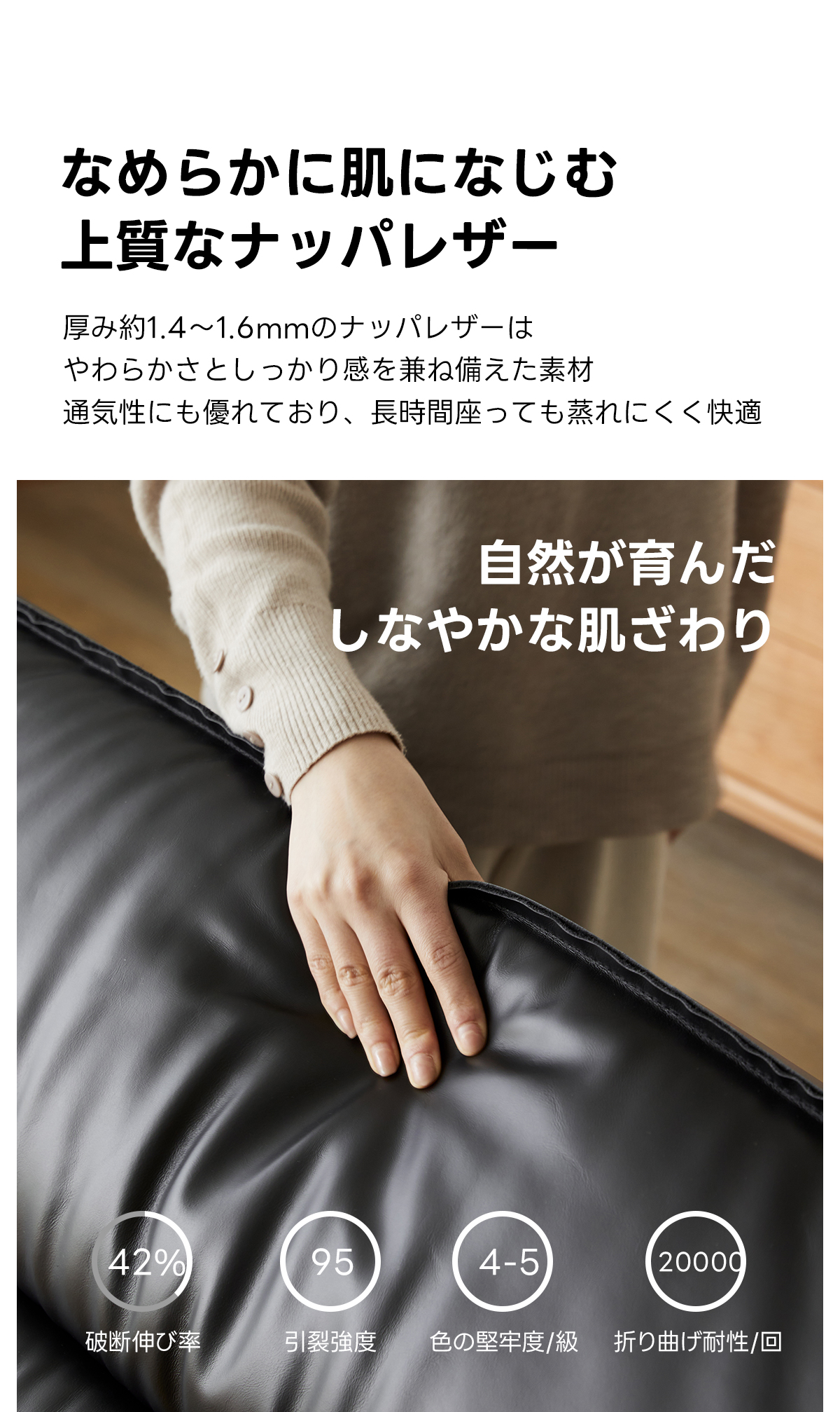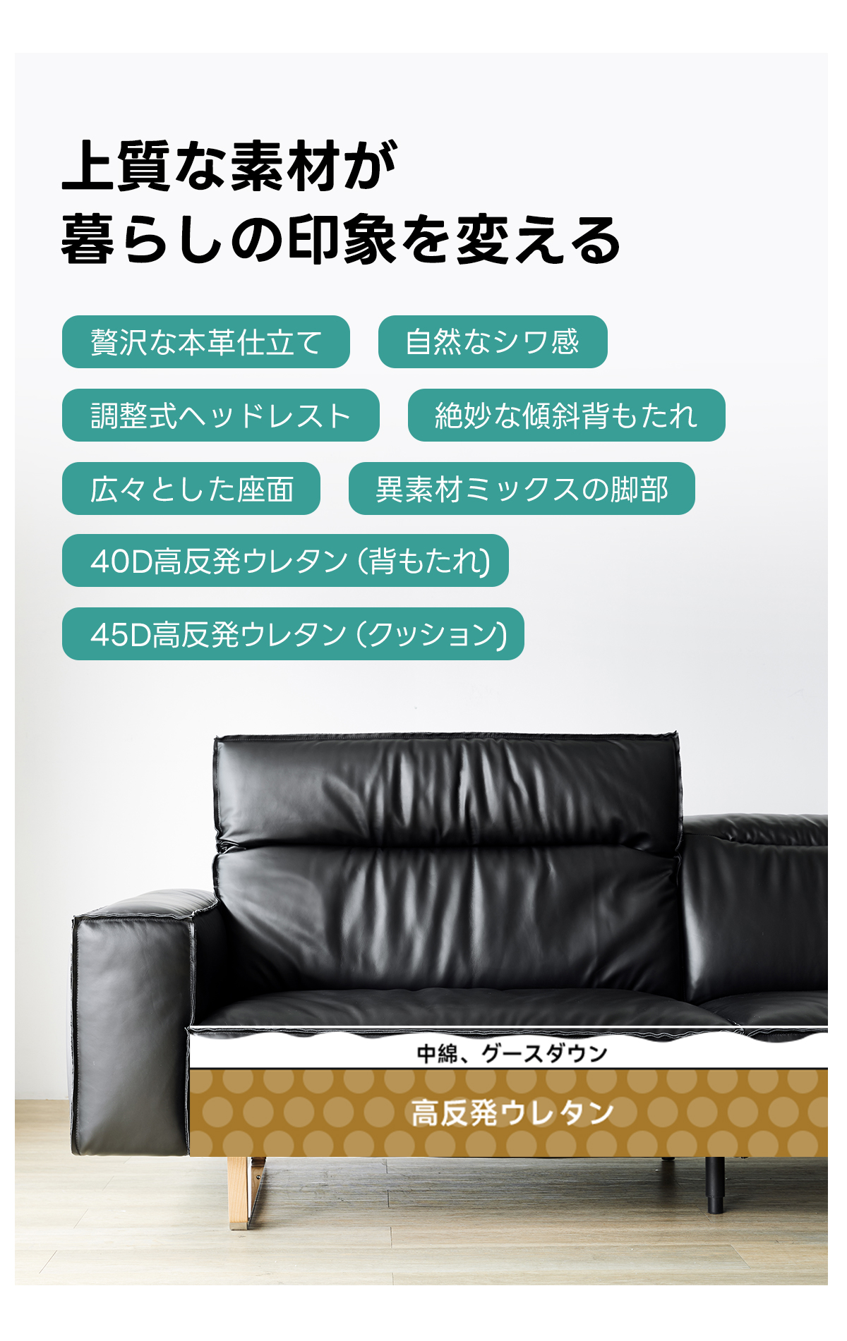 - 【高品質な素材とデザイン】:ナッパレザーと合成レザーの選択肢があり、どちらも高級感あふれる仕上がりです。ロシア産カラマツ材とSバネを使用したフレームは、高い耐久性を誇り、長く使用できます。防水性に優れた素材で、日常のケアも簡単です。