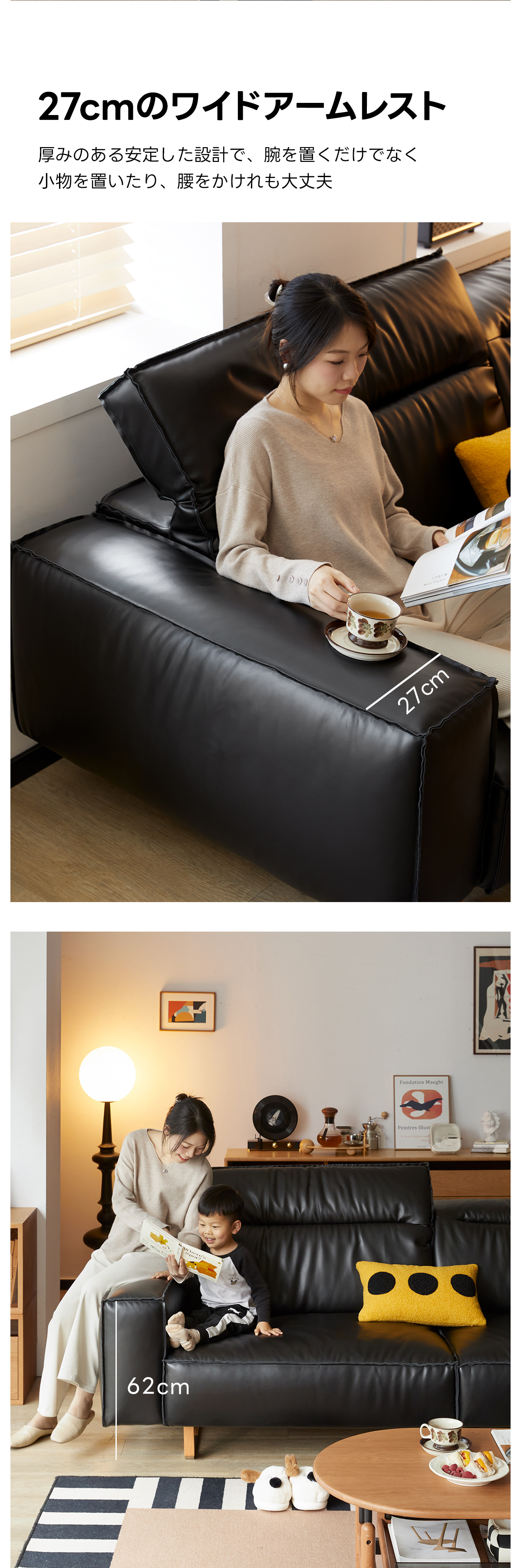 - 【広々とした座面とワイドアームレスト】:座面の奥行きは62cmあり、ゆったりと座ることができます。27cmのワイドアームレストは、腕を置くだけでなく、小物を置くスペースとしても利用可能です。リラックスした時間を提供します。