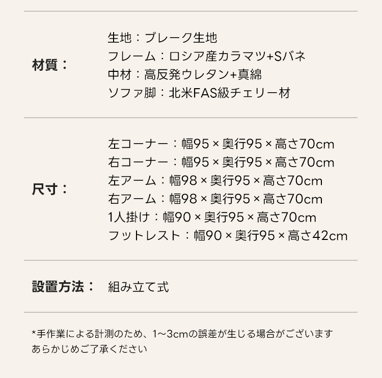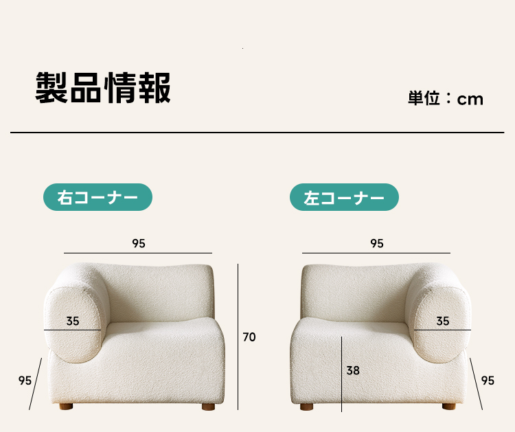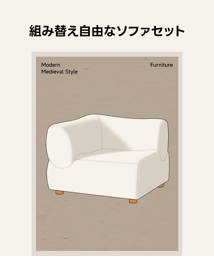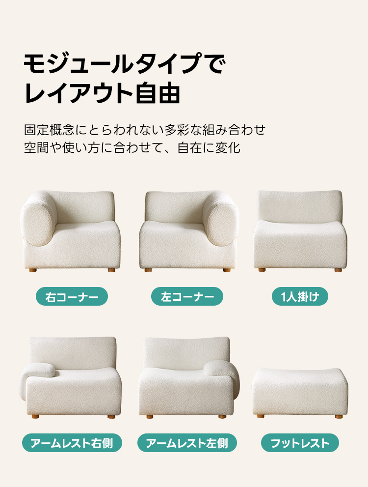 - 【自由なレイアウトで空間をカスタマイズ】:このソファセットはモジュールタイプで、右コーナー、左コーナー、一人掛け、アームレスト付き、フットレストなど、さまざまな組み合わせが可能です。空間や使用目的に応じて自由にカスタマイズできるため、リビングの雰囲気を一新したい方に最適です。