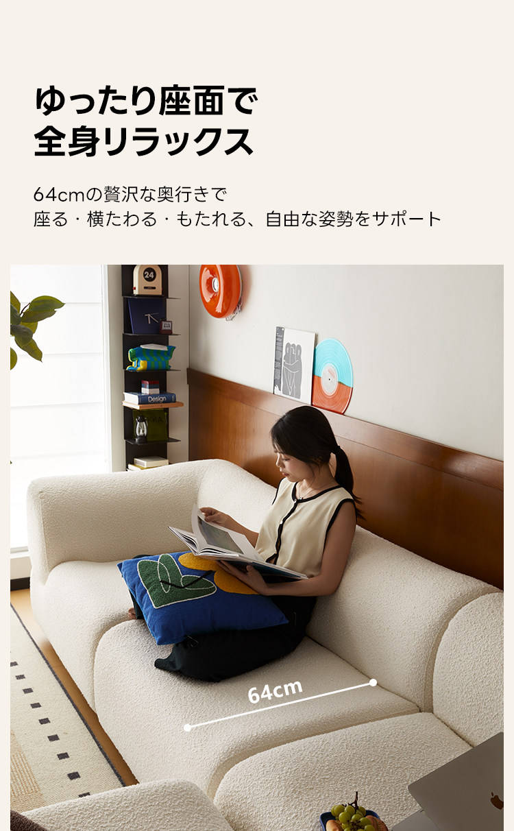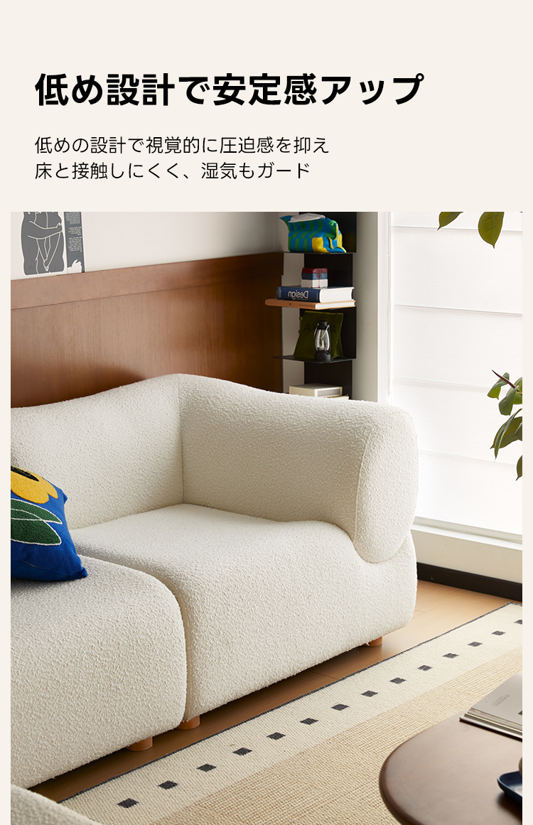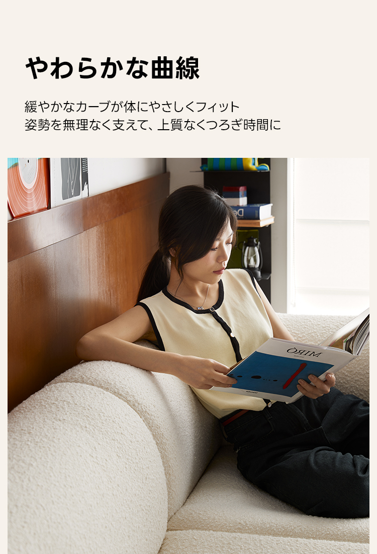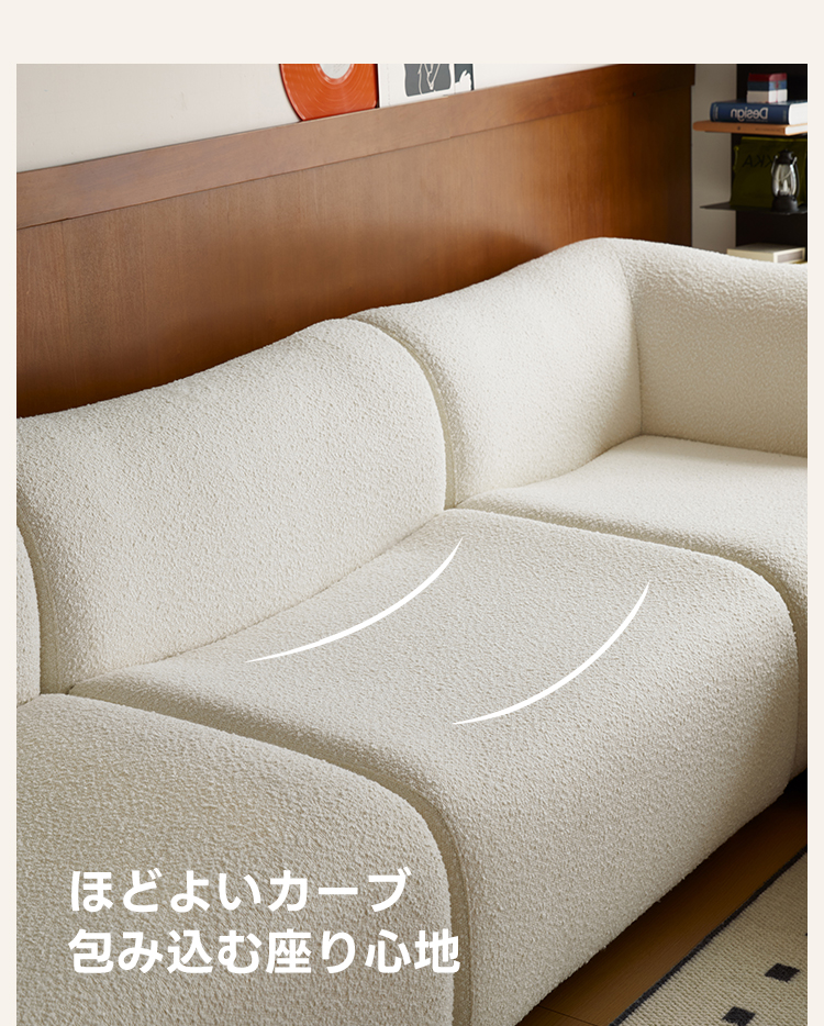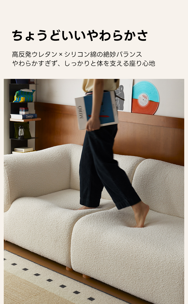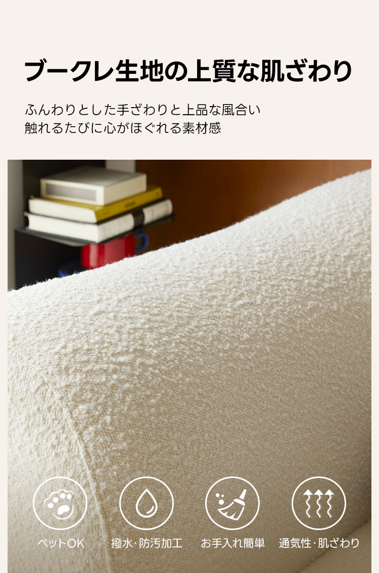 - 【上質なブークレ生地で快適な座り心地】:ふんわりとした手触りと上品な風合いが特徴のブークレ生地を使用。撥水・防汚加工が施されており、ペットがいる家庭でも安心してお使いいただけます。高反発ウレタンとシリコン綿の絶妙なバランスで、柔らかすぎずしっかりと体を支えます。