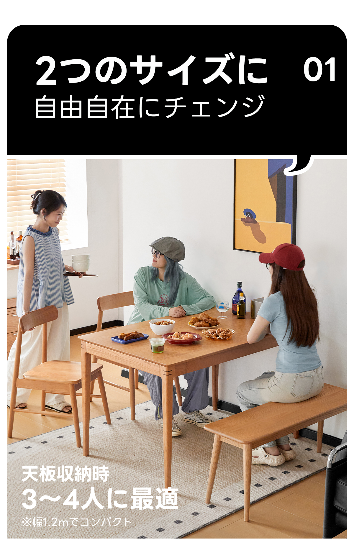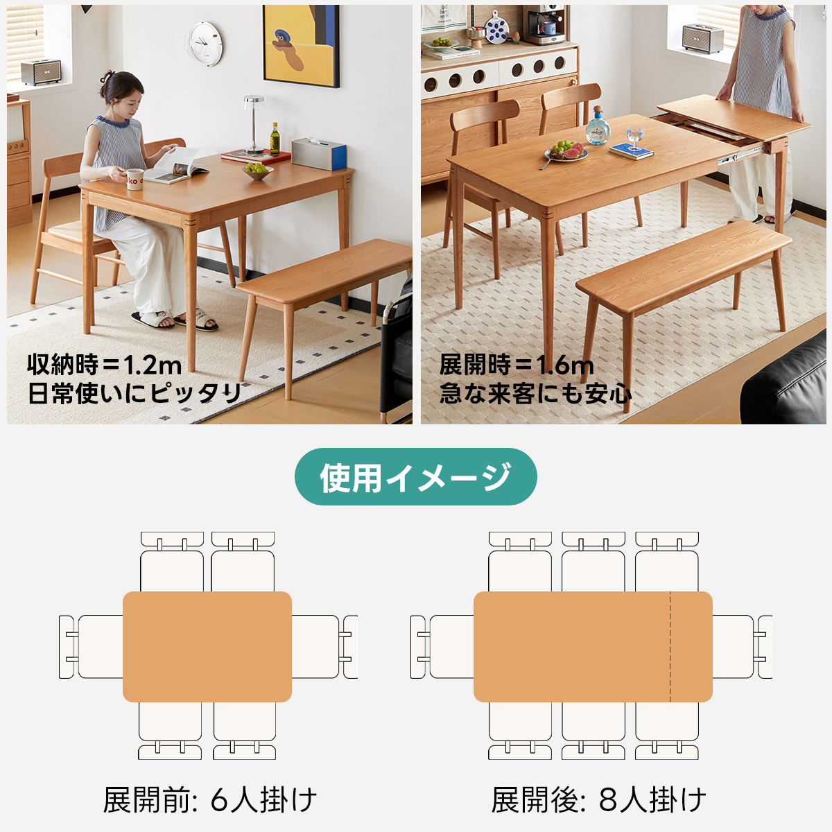 - 【多機能エクステンションテーブル】:ナチュラルウッドダイニングテーブルは、エクステンション機能を備え、120cmから160cmまで簡単に拡張可能です。最大8人まで快適に座ることができ、家族の集まりや友人とのパーティーに最適です。