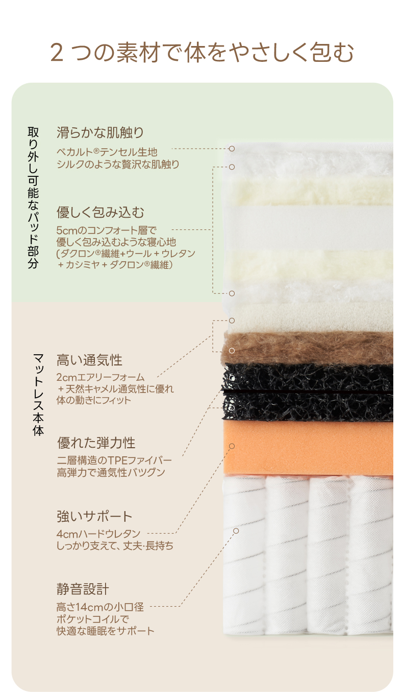 - 【高品質素材で快適な寝心地】:ベカルト®テンセル生地を使用し、シルクのような滑らかな手触りを実現。天然ウールとキャメル素材が湿気を防ぎ、快適な温度を保ちます。