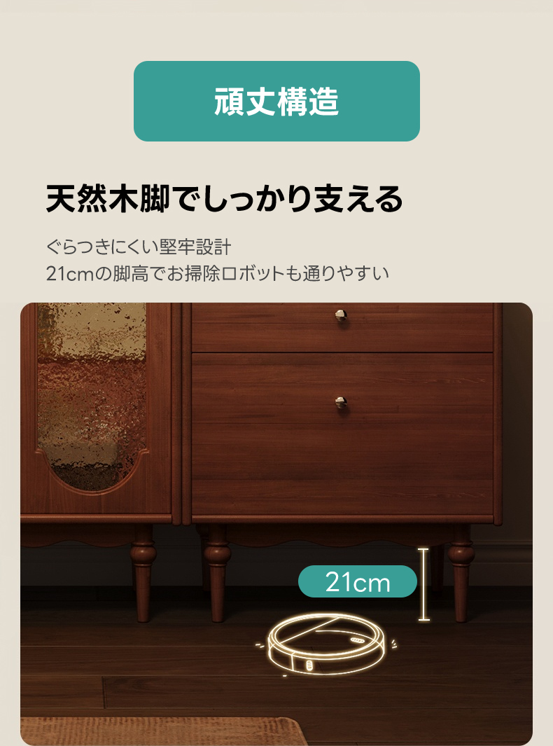- 【安心の頑丈な構造】:天然木製の脚は21cmの高さがあり、掃除ロボットも通りやすい設計です。ぐらつきにくい堅牢な設計で、安心してお使いいただけます。広々とした天板は、コーヒーメーカーやトースターも置ける広さで、傷や熱にも強く、お手入れも簡単です。