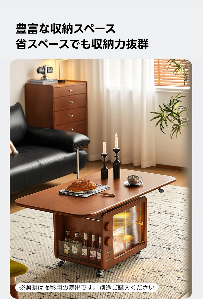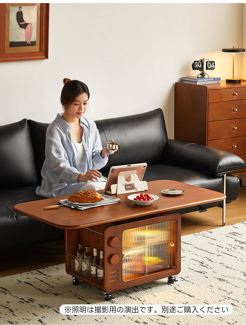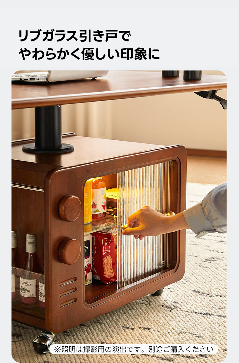 - 【豊富な収納スペースで整理整頓】テーブル下にはリブガラスの引き戸付きの収納スペースがあり、ミニボトルラックやブックスタンドも備えています。中身を見せずに収納できるので、すっきりとした空間を保てます。