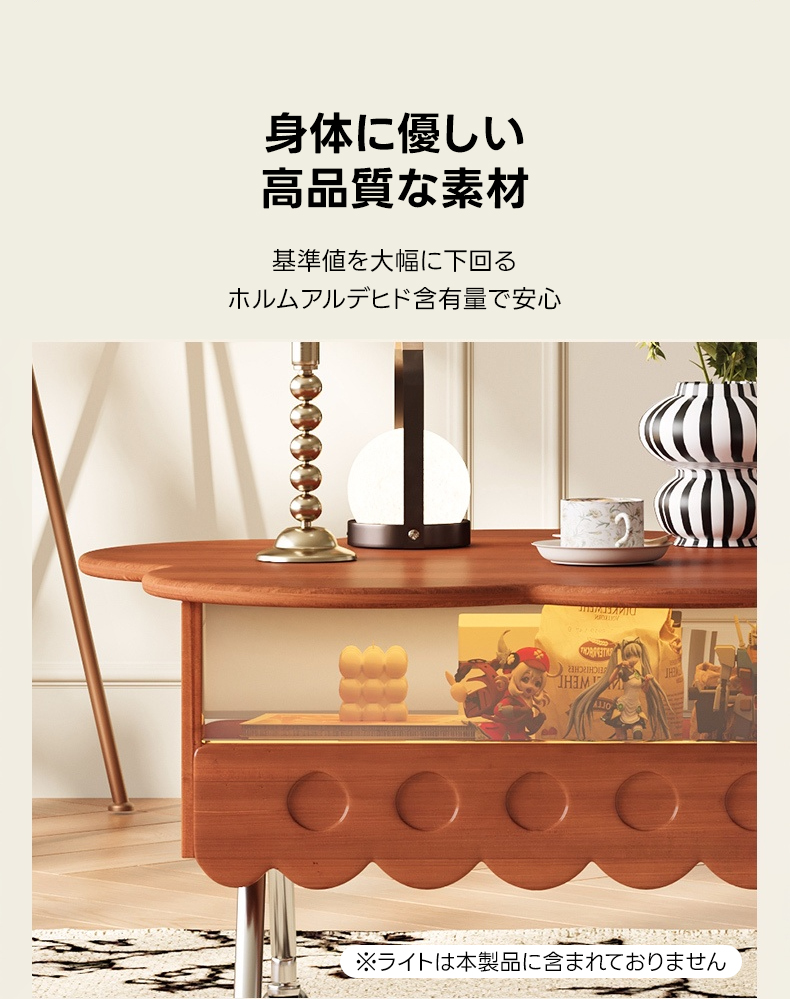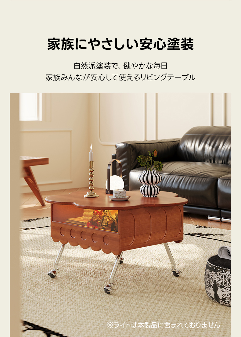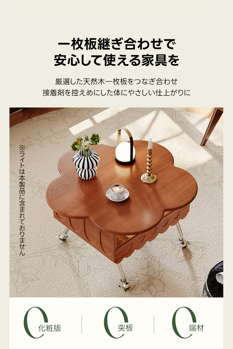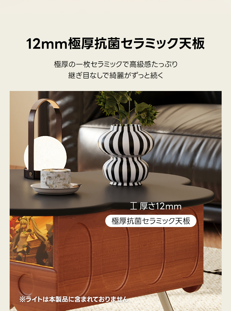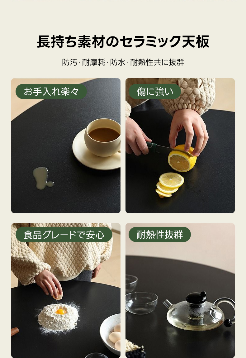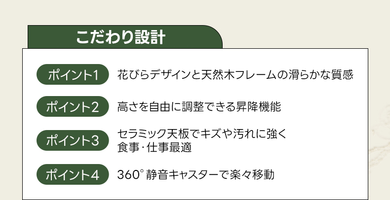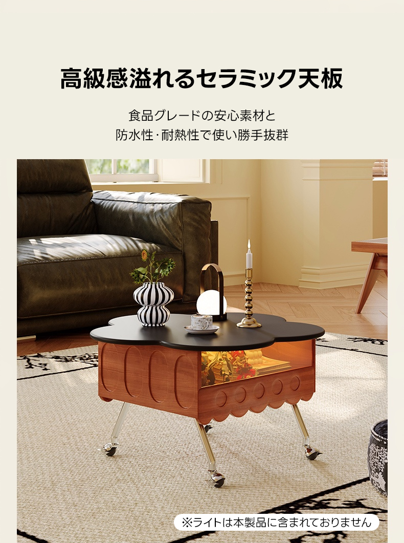 - 【高品質な素材とデザイン】セラミック製の天板は、傷や汚れに強く、耐熱性にも優れています。自然木のフレームが滑らかな質感を提供し、花びらを模した天板デザインが独特の魅力を引き出します。