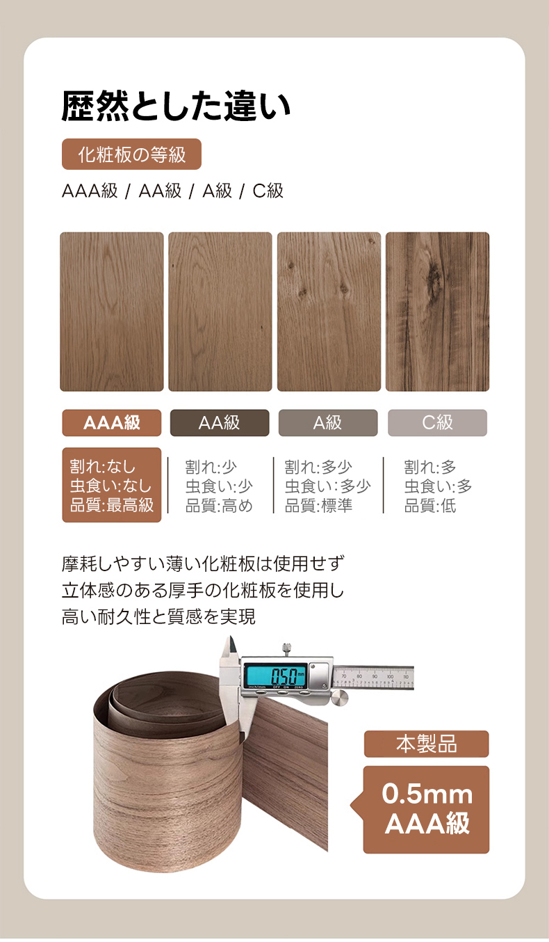 - 【高品質な素材とデザイン】天然木積層合板を使用し、滑らかな表面と自然な木目が特徴です。FAS級のブラックウォールナット化粧板やホワイトオーク突化粧板を使用し、耐久性と質感を兼ね備えています。