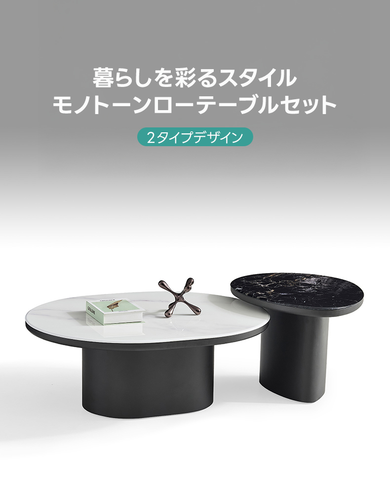 - 【高級感あふれるデザイン】:このモノトーンローテーブルセットは、洗練されたデザインが特徴です。モノトーンのカラースキームと滑らかな曲線が、どんなインテリアにもマッチし、空間を引き締めます。大理石調の人工天板がモダンでエレガントな雰囲気を演出し、リビングやサロン、レストランなどで高級感を醸し出します。