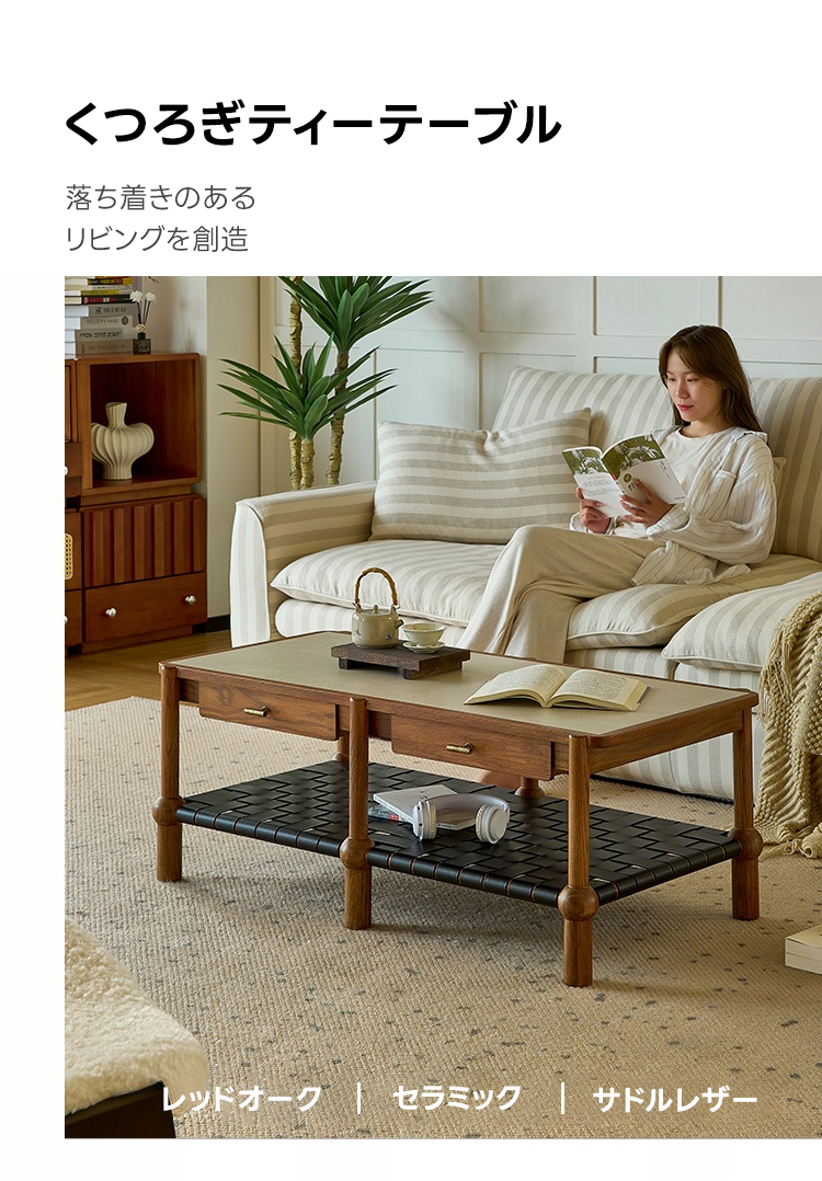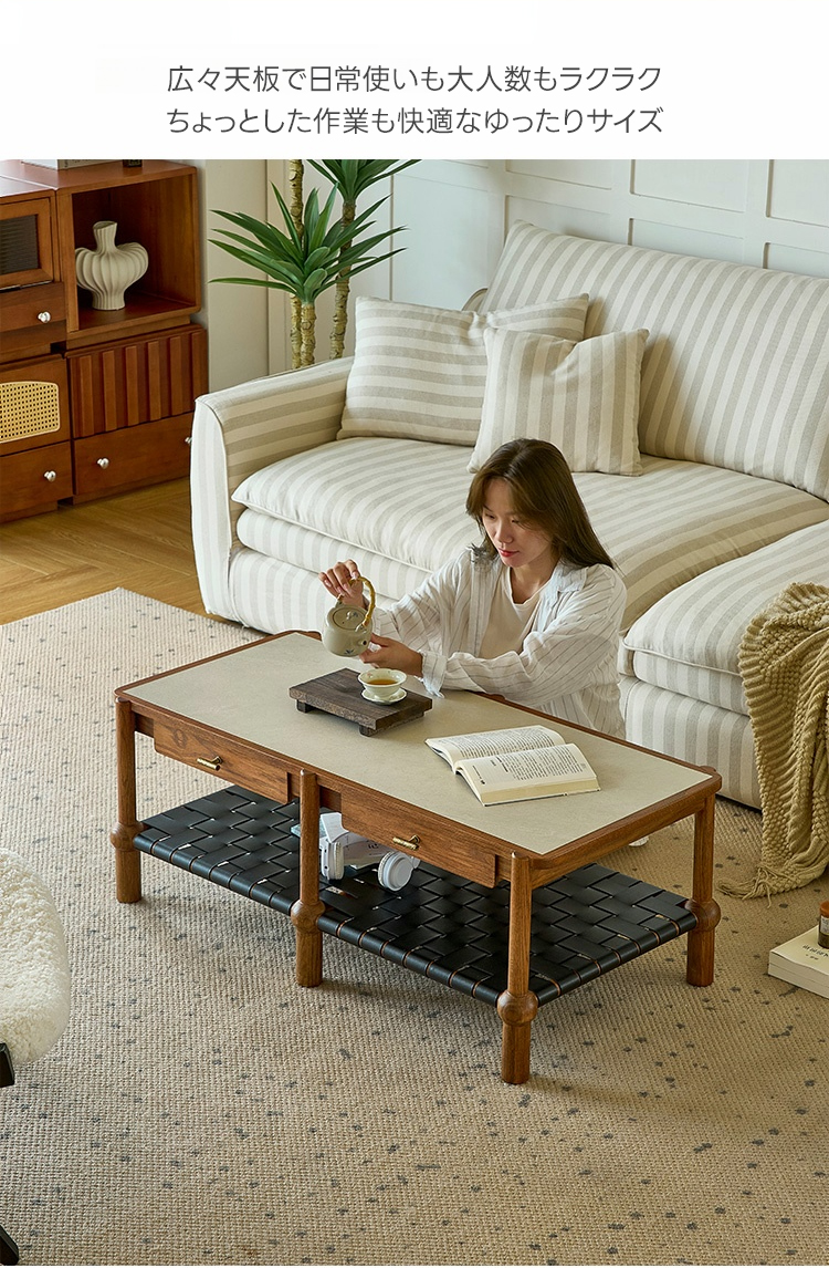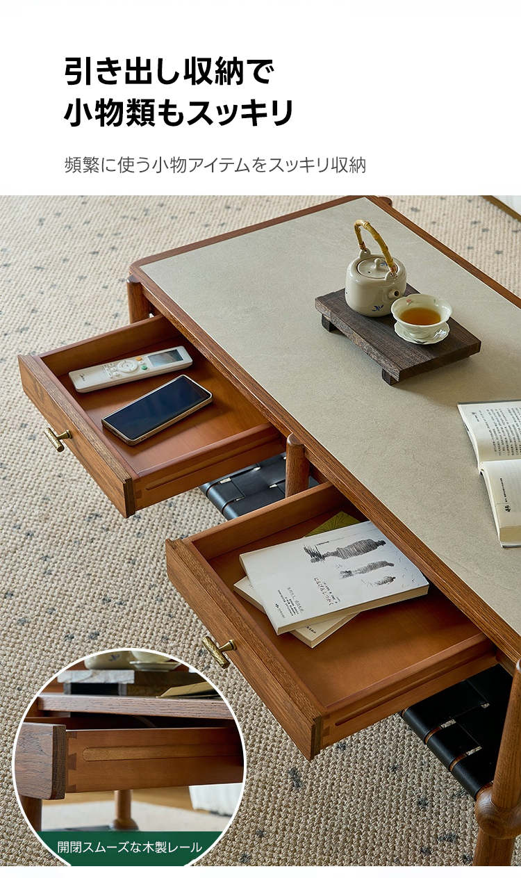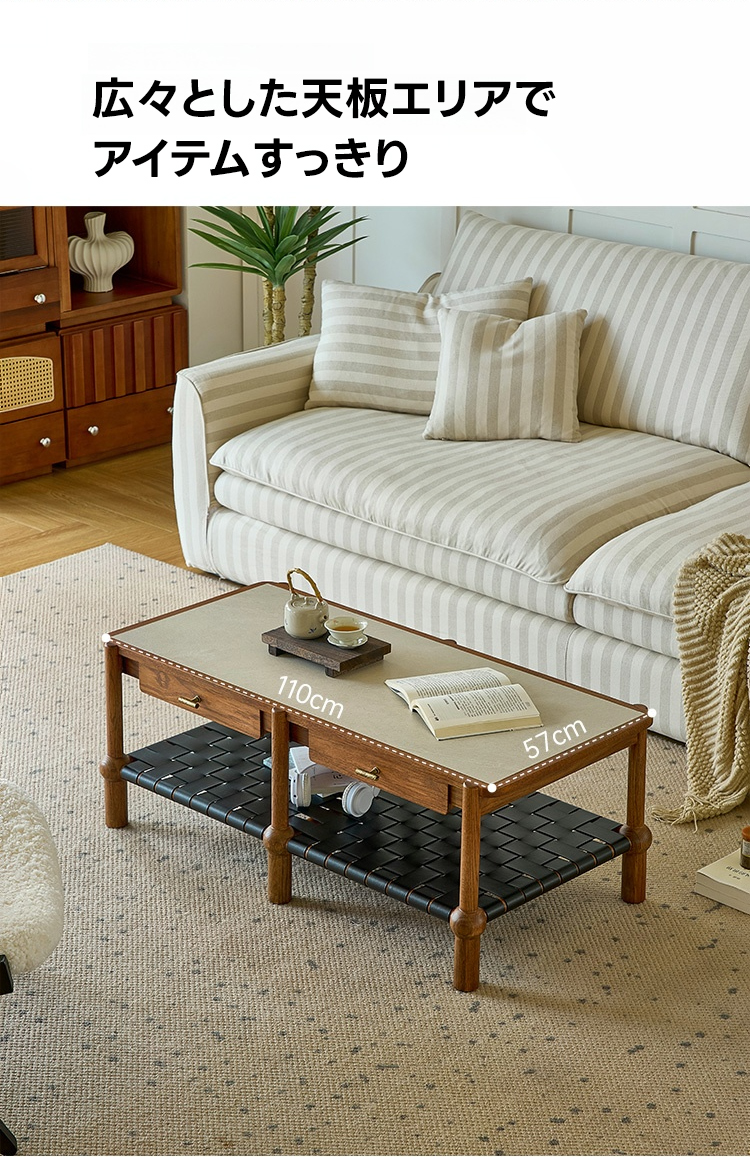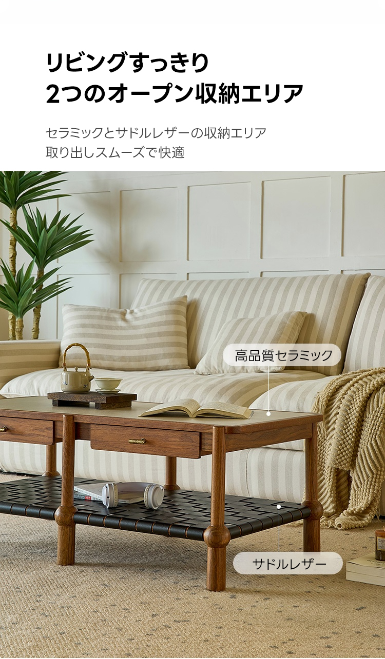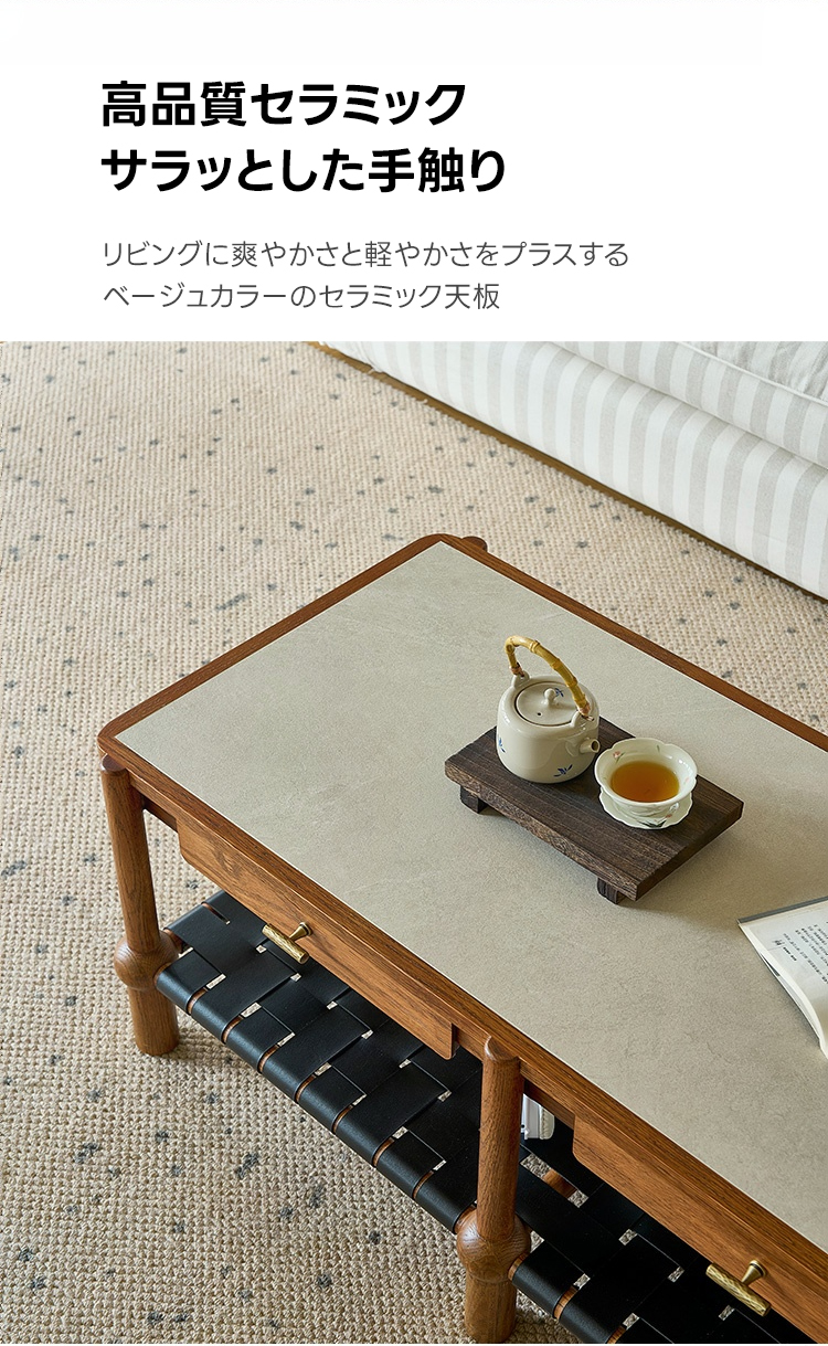 - 【多機能リビングテーブル】:くつろぎティーテーブルは、耐熱性と耐傷性に優れたセラミック天板を採用し、日常の使用にも安心です。2つの引き出し付きで、小物類をすっきりと収納でき、リビングスペースを有効活用できます。