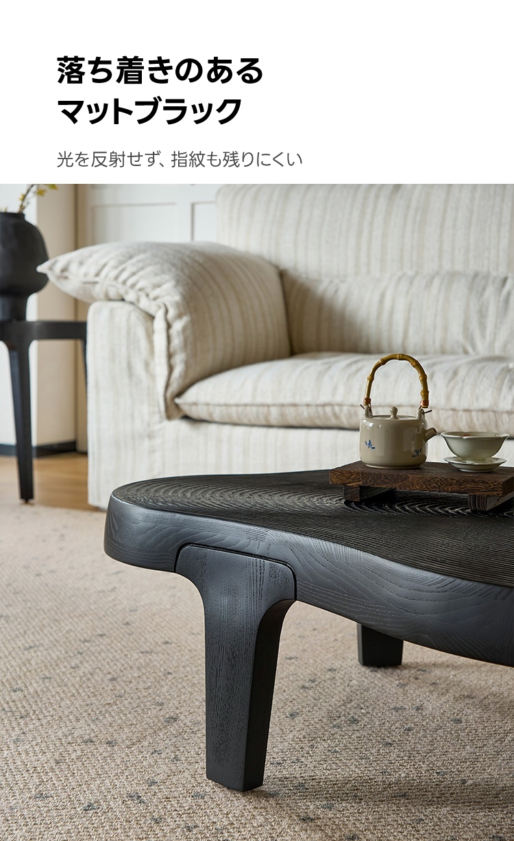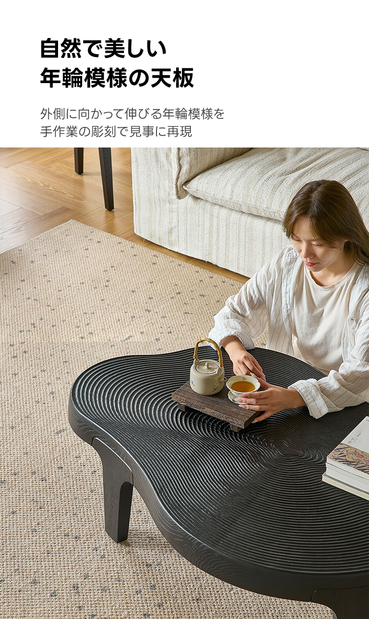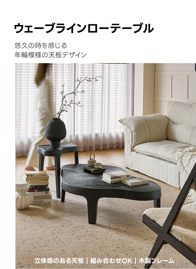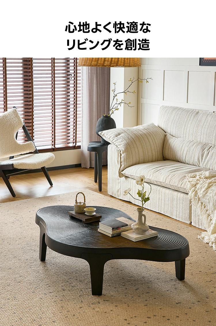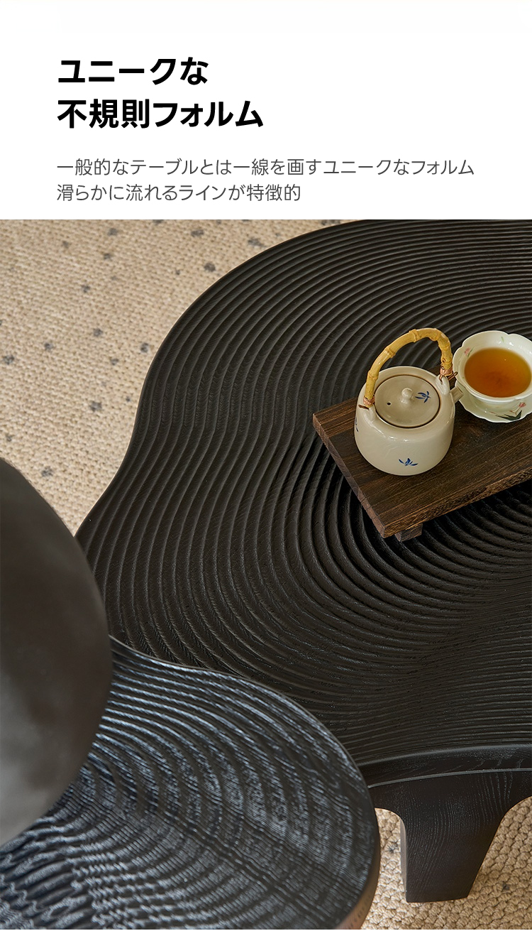 - 【ユニークなデザイン】ウェーブラインローテーブルは、滑らかに流れる不規則なフォルムが特徴です。一般的なテーブルとは異なり、モダンでスタイリッシュなデザインがリビングを彩ります。