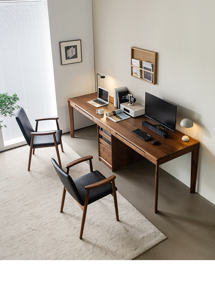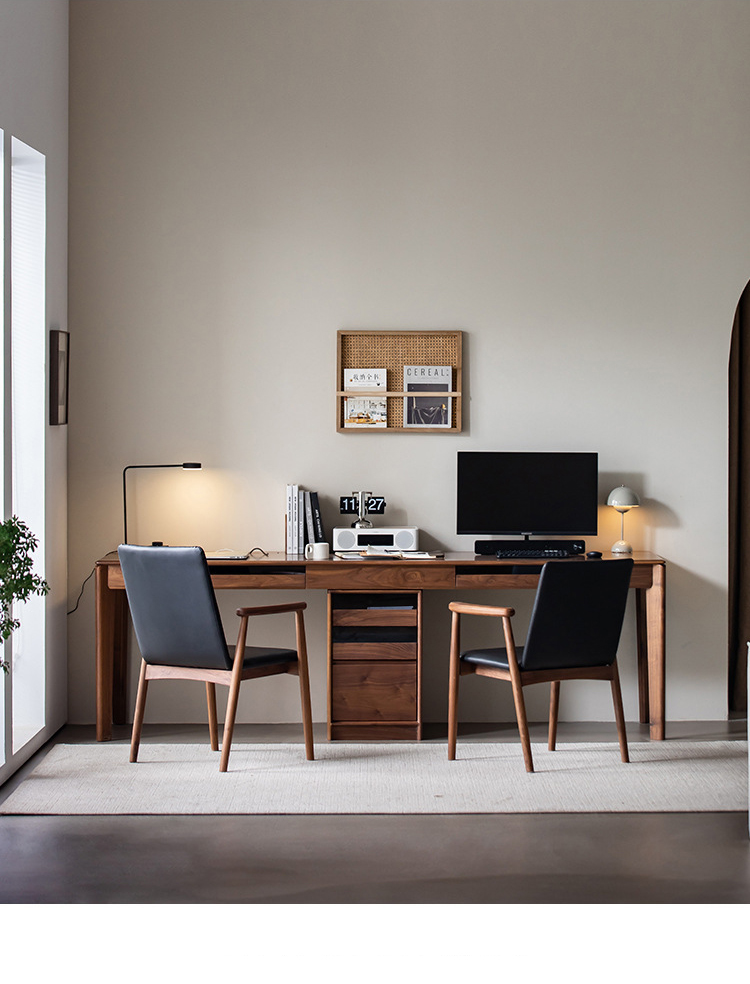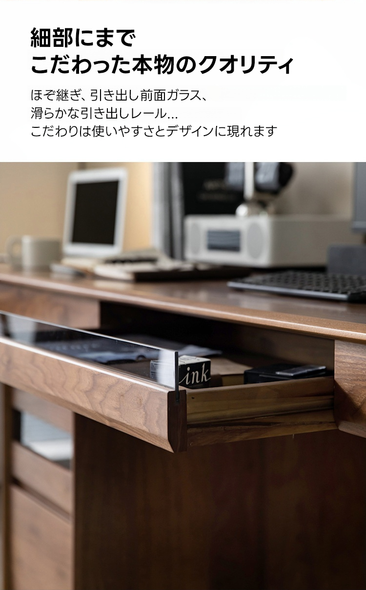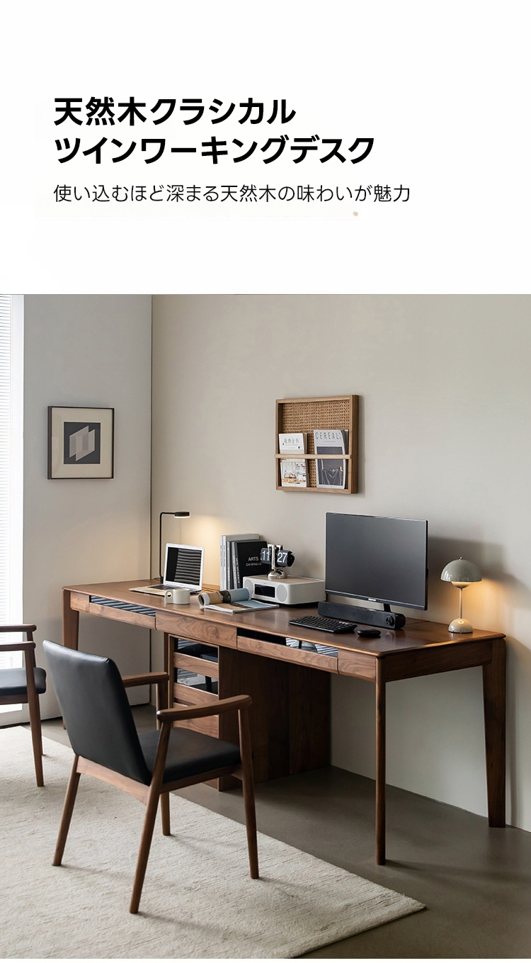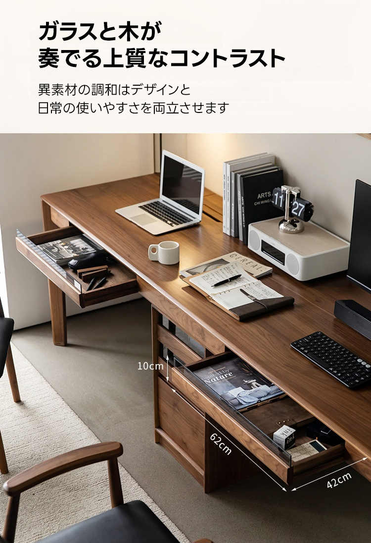 - 【高品質素材と美しいデザイン】天然木クラシカルツインワーキングデスクは、北米産FAS級ブラックウォールナットを使用し、耐久性と美しさを兼ね備えています。ガラスと木材のコントラストが美しく、異素材の調和がデザインと使いやすさを両立しています。
