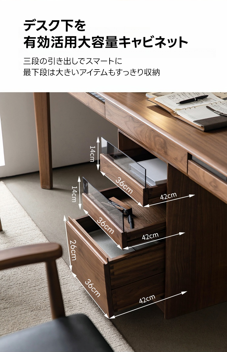 - 【優れた収納力と機能性】デスク下には大容量キャビネットがあり、3段の引き出しでスマートに収納できます。隠せる配線ボックスでコードがすっきり整理でき、見た目も美しく整えられます。面取り加工が施されており、細部にまで配慮された上質なディテールが魅力です。
