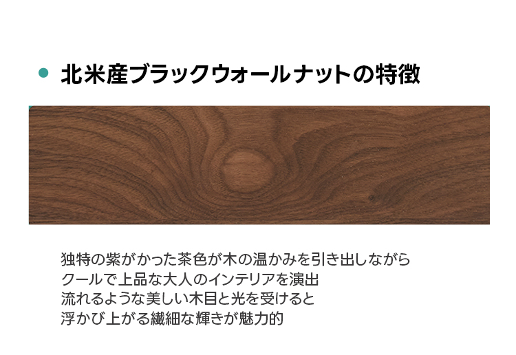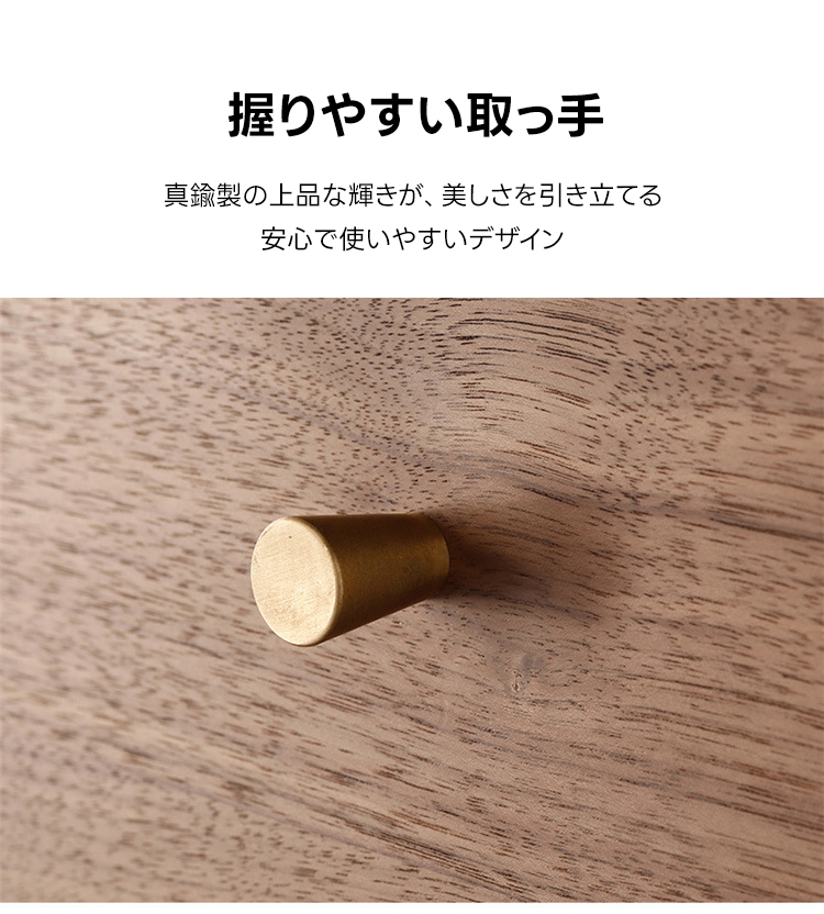 - 【素材とデザイン】:ブラックウォールナット材の独特の紫がかった茶色が木の温かみを引き出し、流れるような美しい木目が魅力的です。真鍮製の取っ手が上品な輝きを放ち、滑らかな開閉で快適に使用できます。