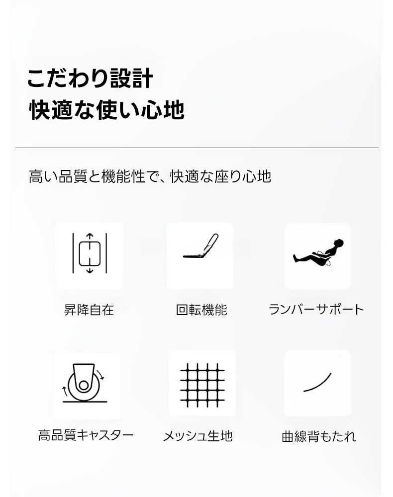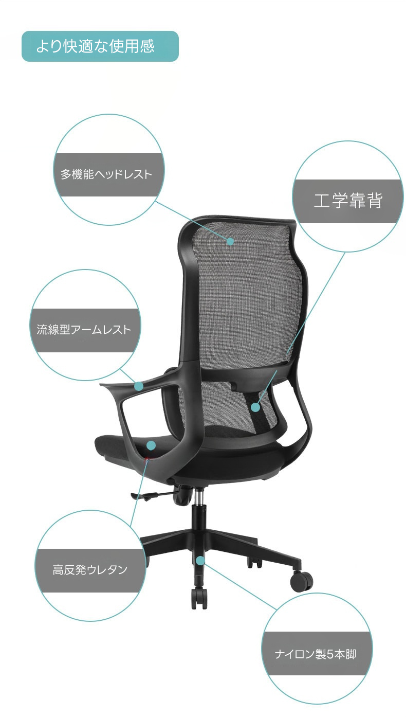 - 【人間工学に基づいたデザイン】このオフィスチェアは、首、肩、腰をしっかりサポートする設計で、長時間の作業でも快適な座り心地を提供します。高品質メッシュ生地と高反発ウレタンシートを使用し、通気性が良く疲れにくい仕様です。