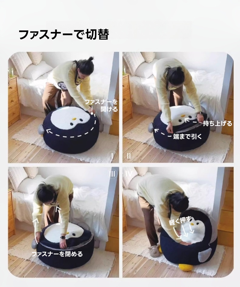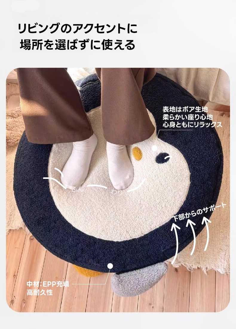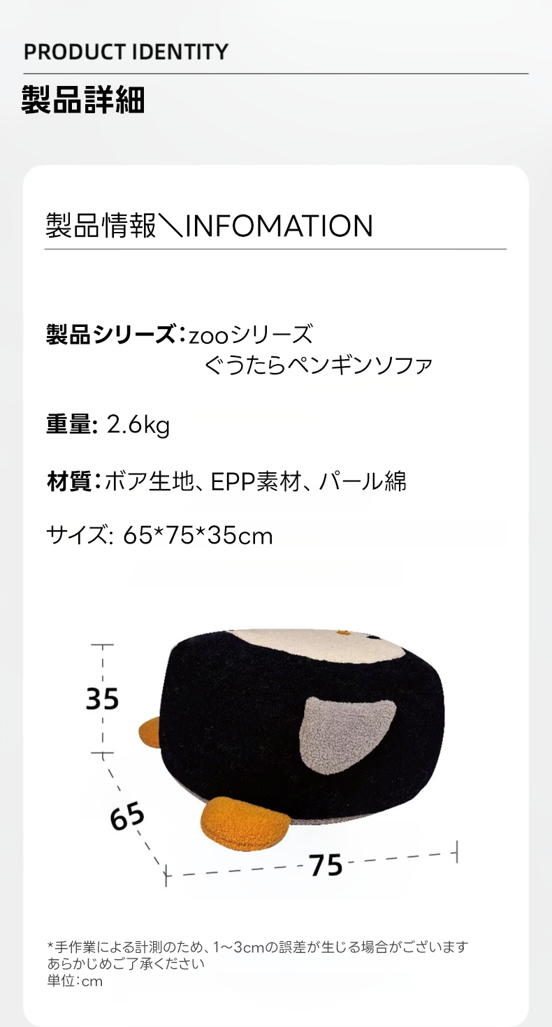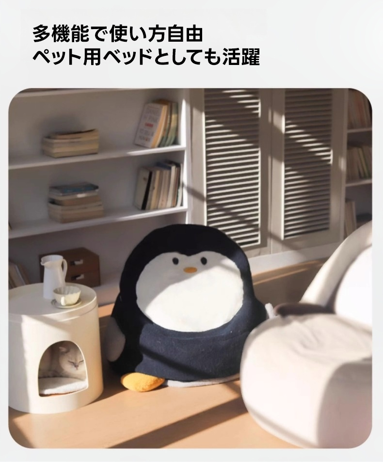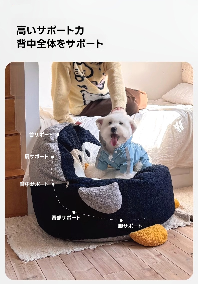 - 【多機能ペットソファ】:ぐうたらペンギンソファは、ペット用ベッド、フットスツール、ローソファとしても使用可能な多機能デザインです。ペンギン形状が可愛らしく、リビングや子供部屋にぴったりのアクセントになります。