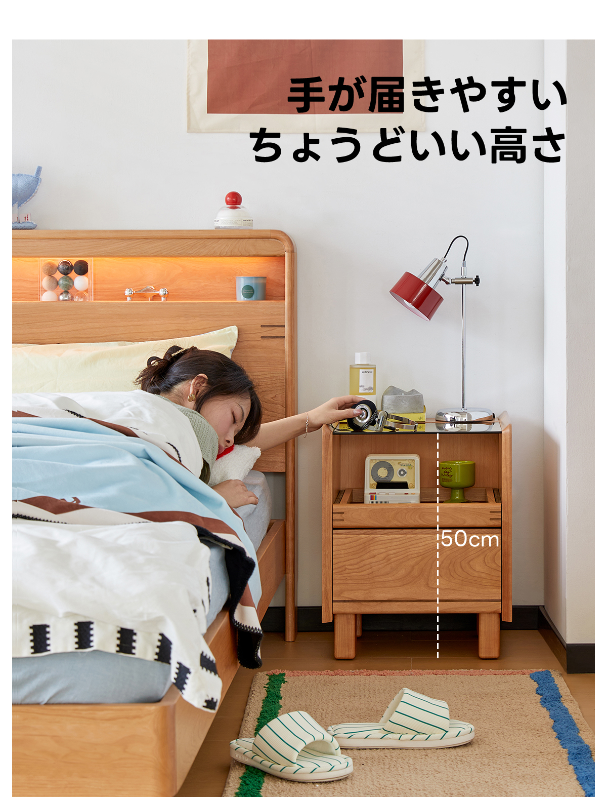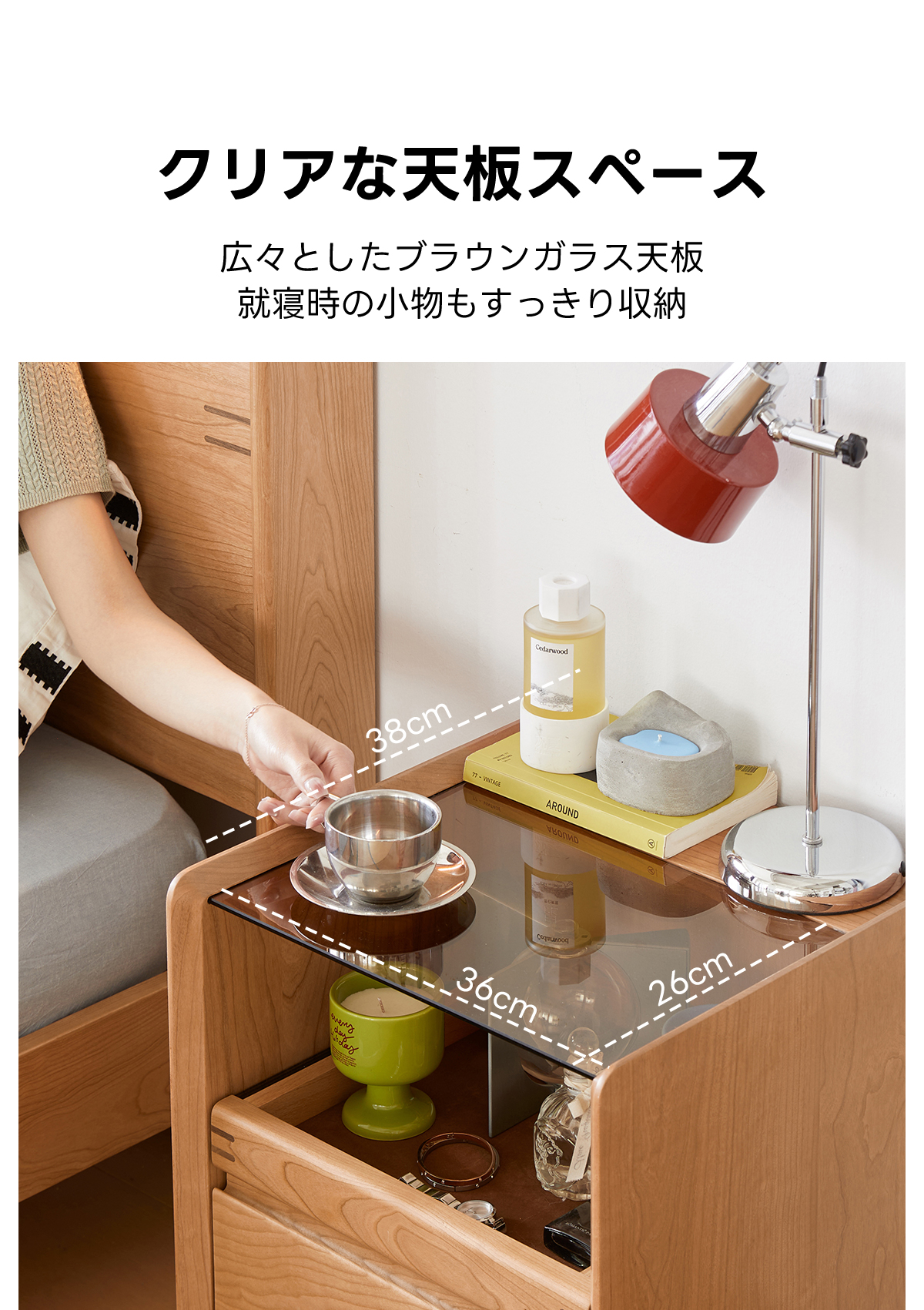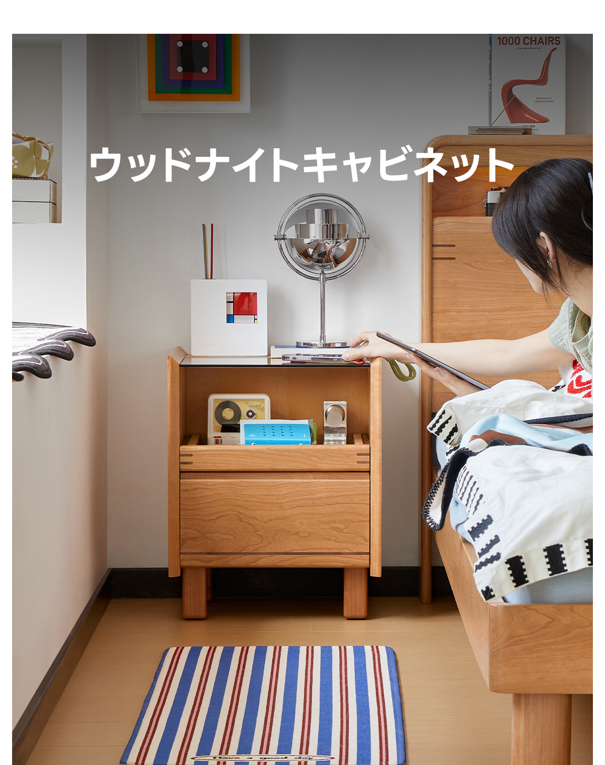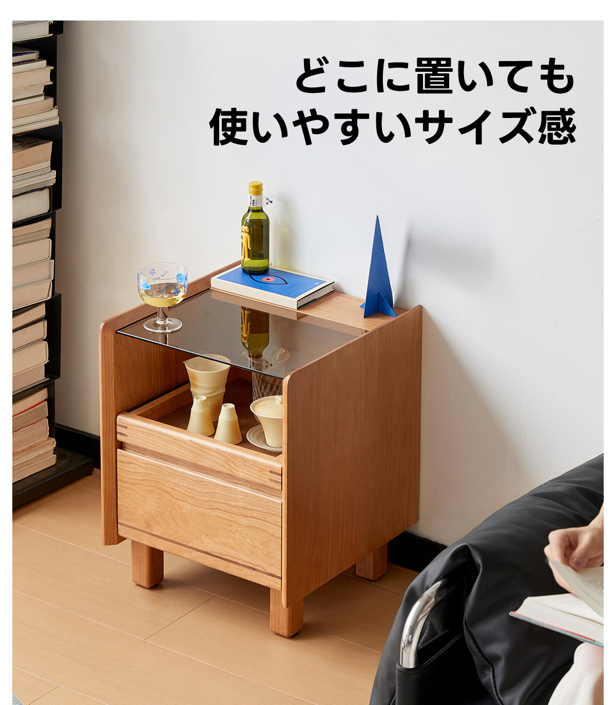 - 【ナチュラルなデザインと高い耐久性】:ウッドナイトキャビネットは、アメリカ北部のFAS級チェリー材を使用し、ナチュラルで温かみのあるデザインが特徴です。ブラウンガラスの天板が上品さを引き立て、どんなインテリアにも馴染みます。