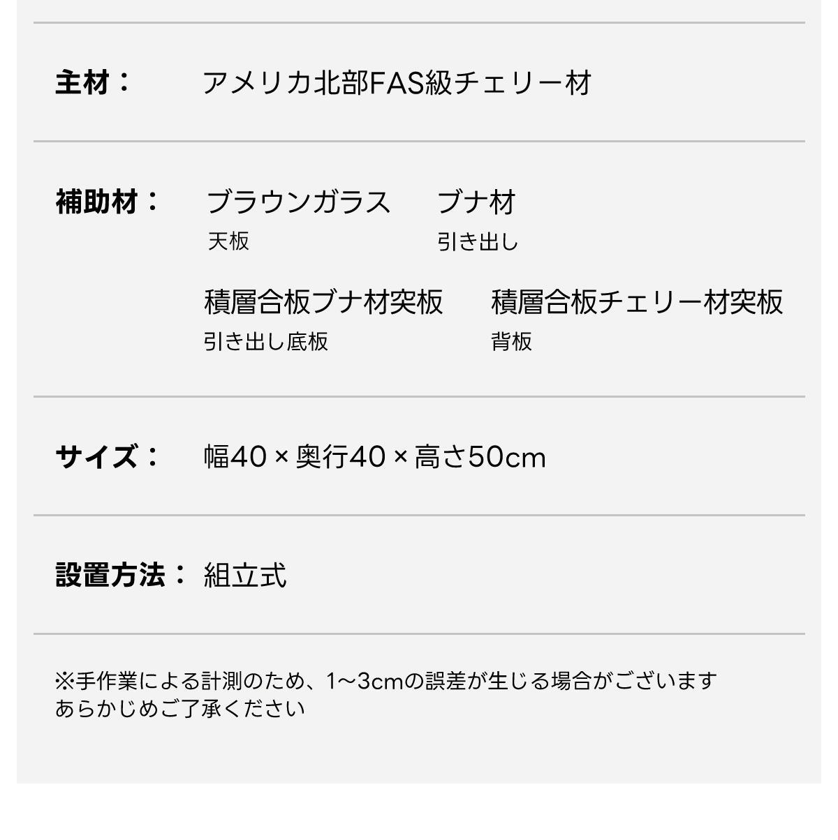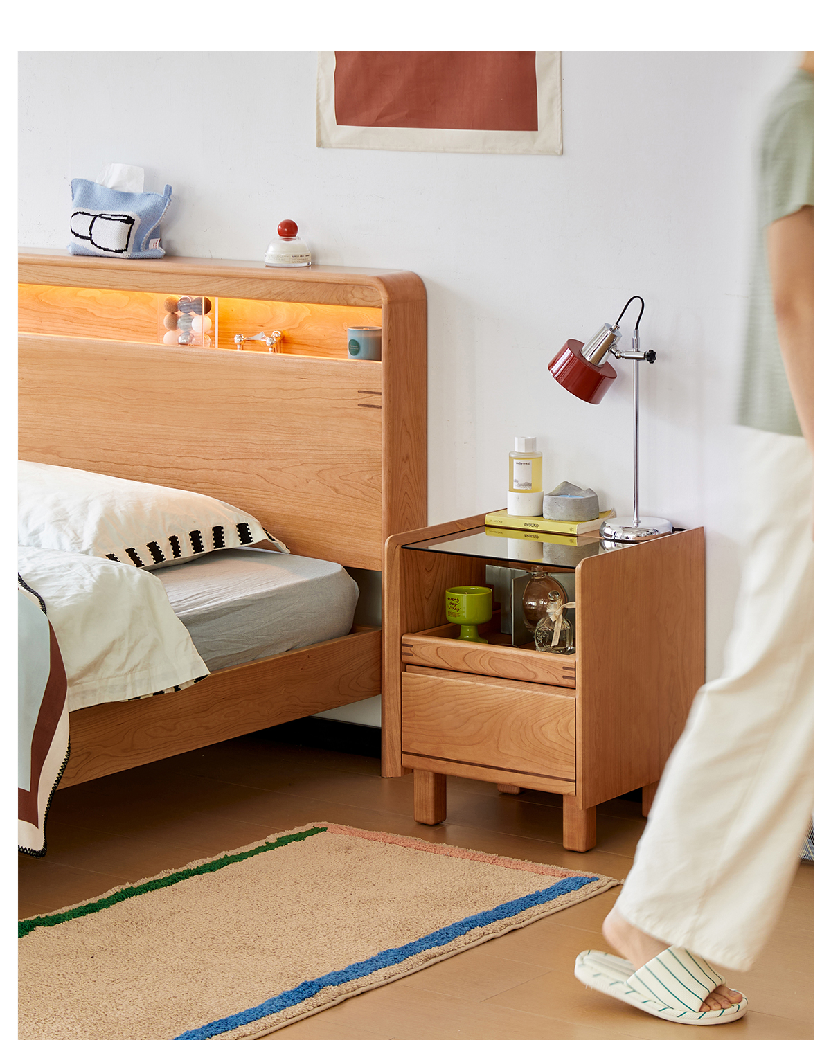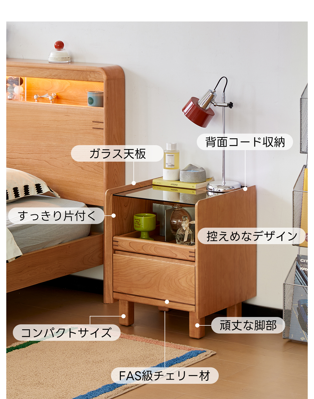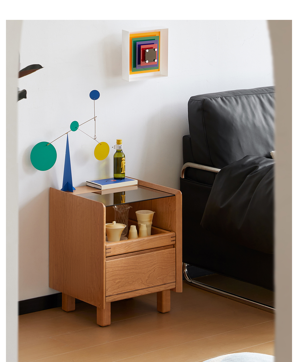 - 【ナチュラルなデザインと高い耐久性】:ウッドナイトキャビネットは、アメリカ北部のFAS級チェリー材を使用し、ナチュラルで温かみのあるデザインが特徴です。ブラウンガラスの天板が上品さを引き立て、どんなインテリアにも馴染みます。