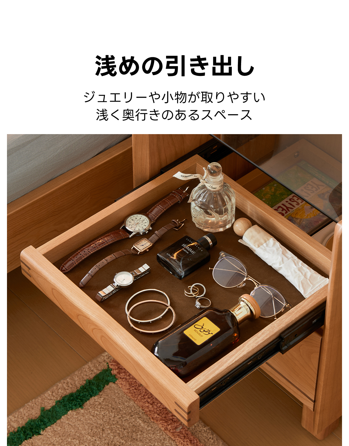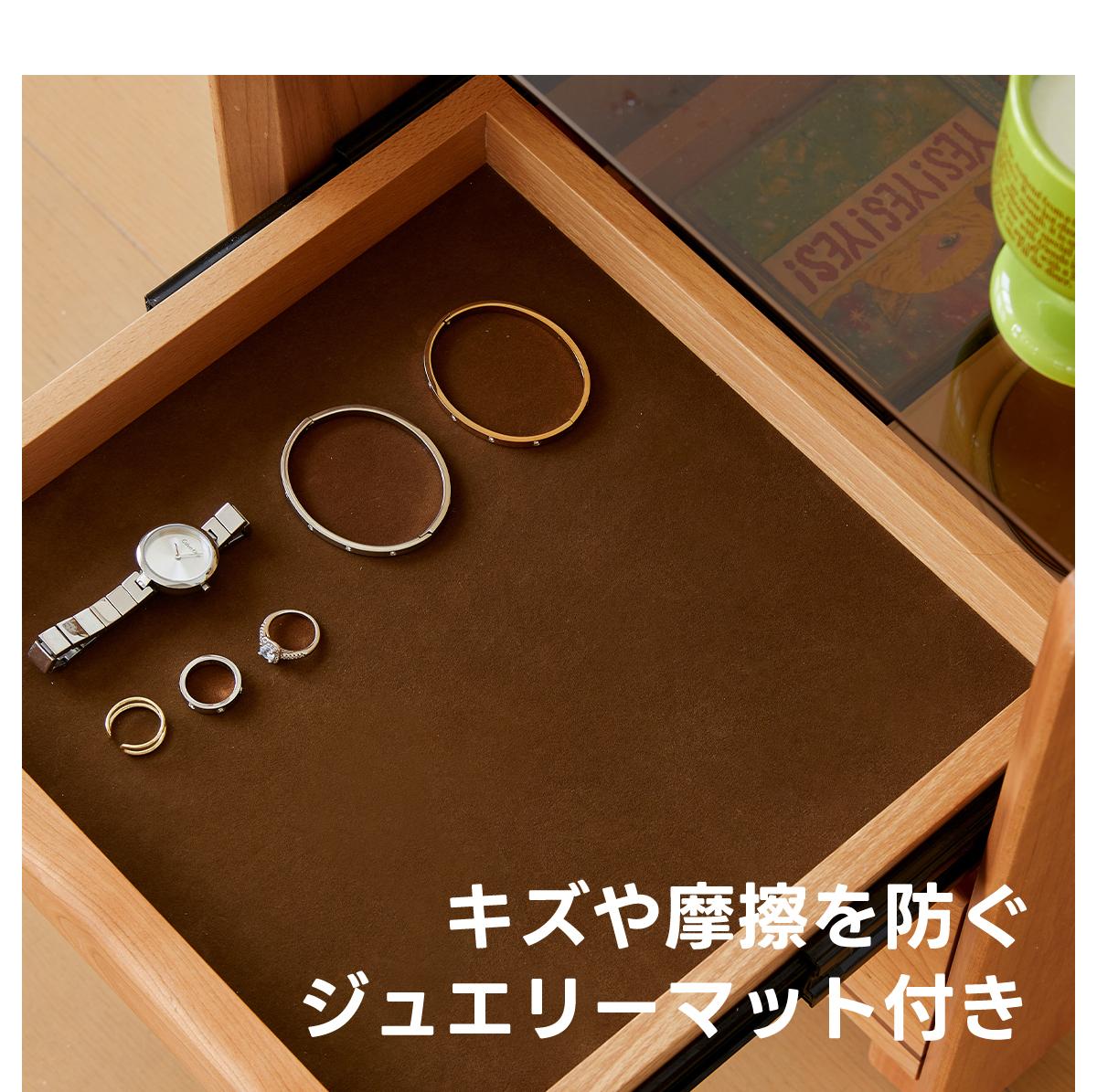 - 【機能的な収納力】:浅めと深めの引き出しがあり、小物から大きな物までスッキリと収納可能です。ジュエリーマット付きで、アクセサリーの保管にも最適。背面にはコード収納スペースがあり、電子機器の配線もスッキリ整理できます。