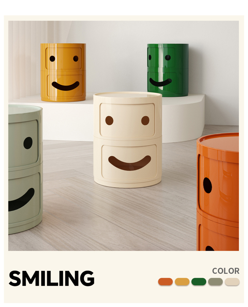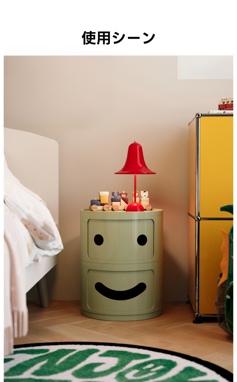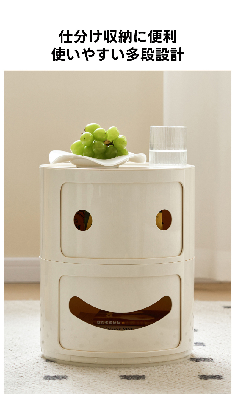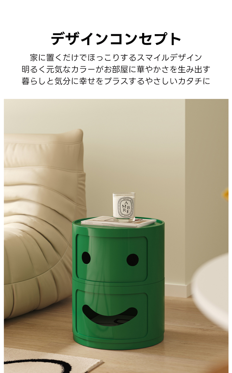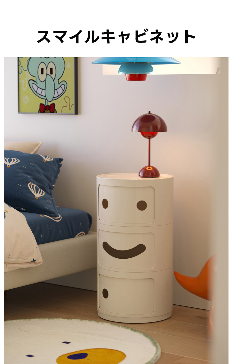 - 【ポップで遊び心あふれるデザイン】スマイルキャビネットは、円形のフォルムと笑顔のモチーフが特徴で、お部屋を明るく楽しい雰囲気に演出します。デザイン性と実用性を兼ね備えた収納家具です。