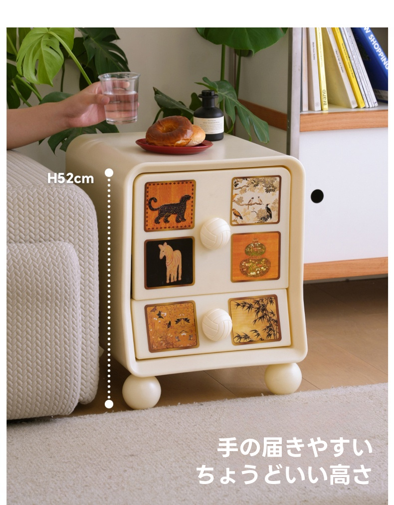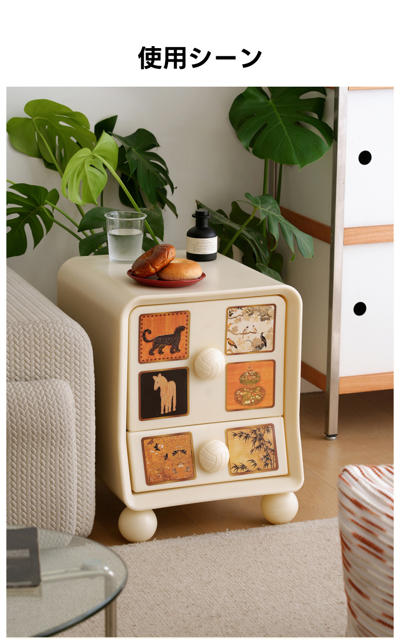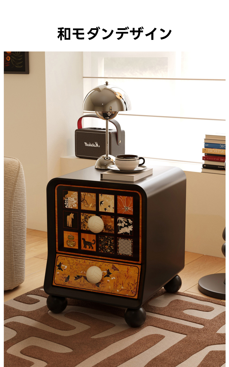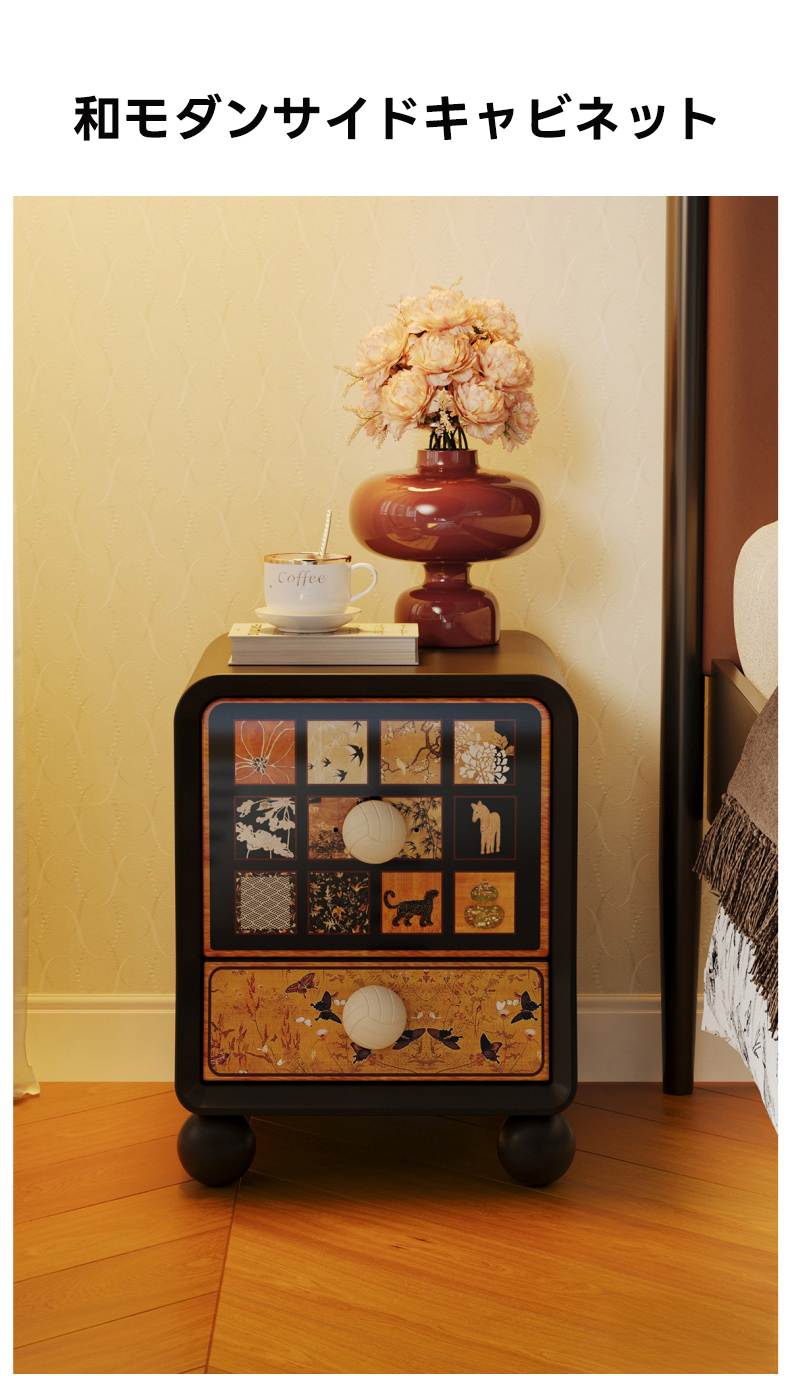 - 【和モダンデザインと機能性の融合】:このキャビネットは、伝統的な和の美しさと現代的なモダンスタイルを融合したデザインが特徴です。引き出しの前面に施された和柄が、インテリアにアクセントを加え、どんなお部屋にもぴったりフィットします。