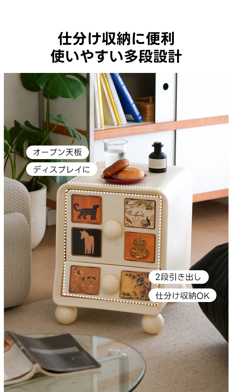 - 【多用途で便利な収納】:2段引き出しは、細々したアイテムの整理に最適です。オープン天板は、お気に入りの小物や植物をディスプレイするのにぴったりで、リビングや寝室をより魅力的に演出します。