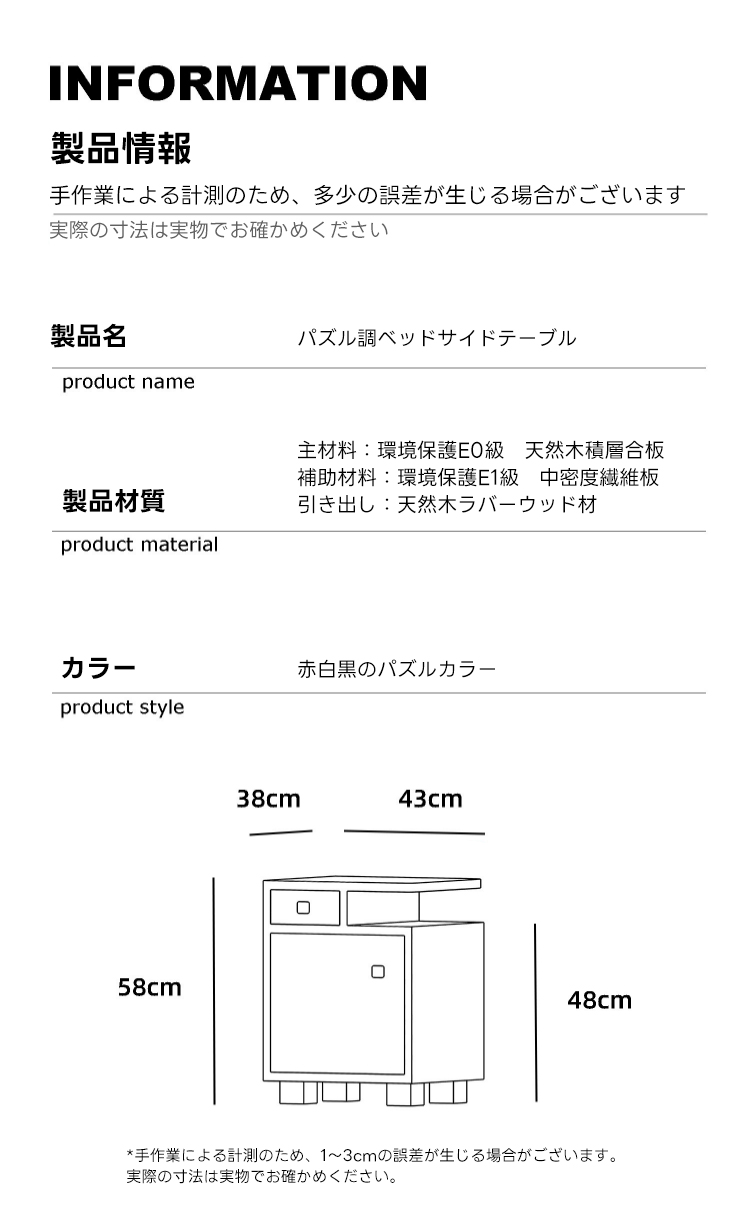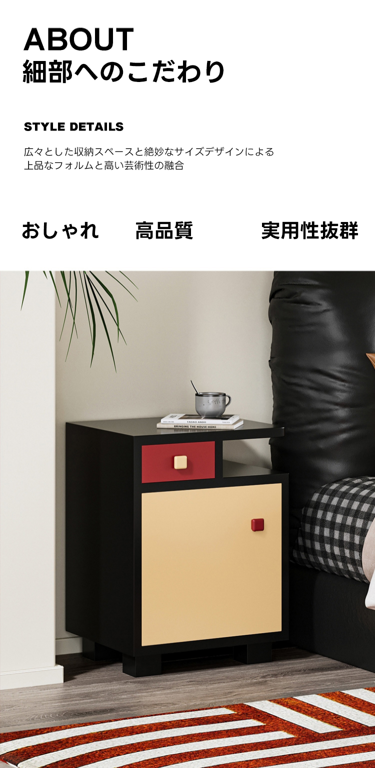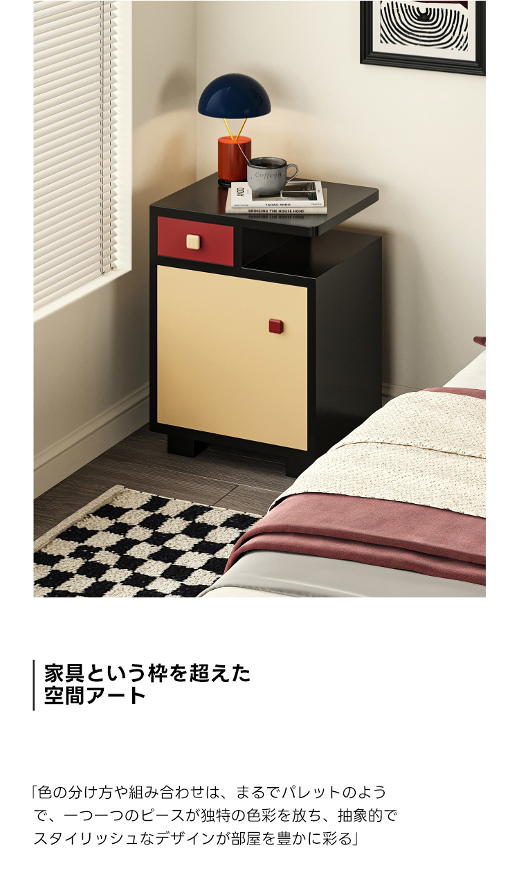 - 【多機能収納スペース】このパズル調ベッドサイドテーブルは、引き出しと扉付きの収納スペースを備えており、小物から雑誌までしっかりと整理整頓できます。カラフルなデザインがインテリアにスタイリッシュなアクセントを加え、どんな部屋にもマッチします。