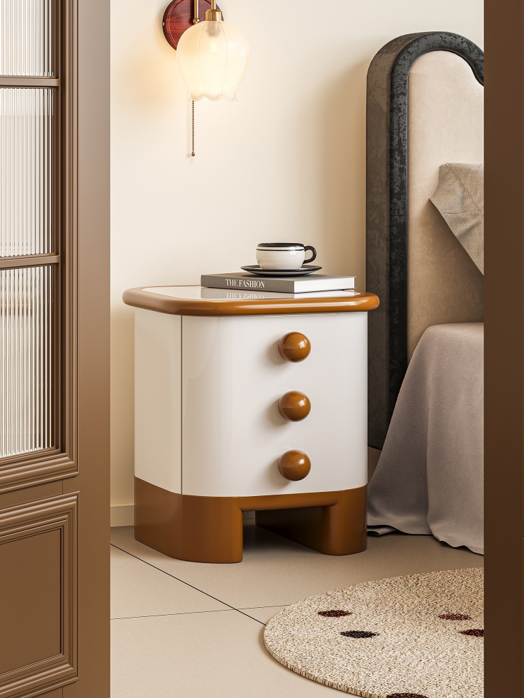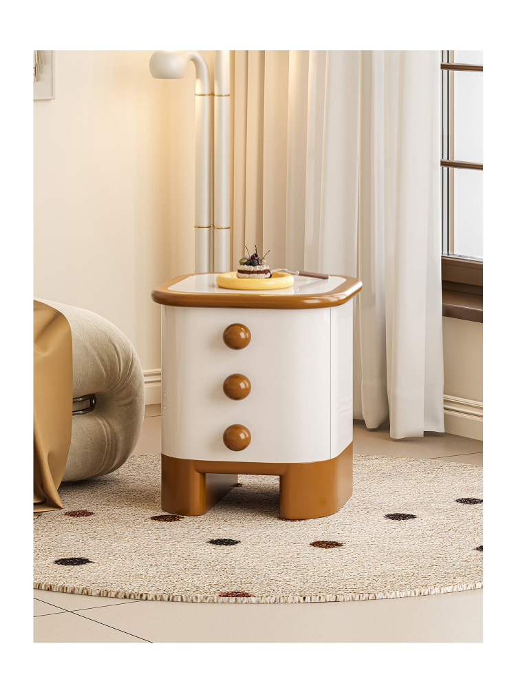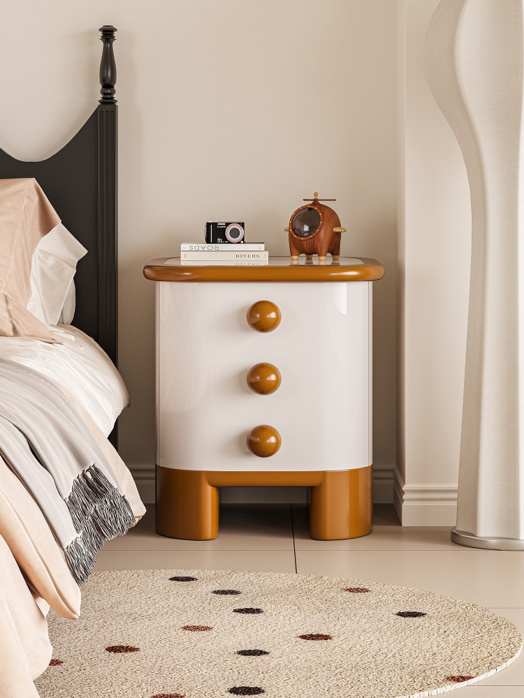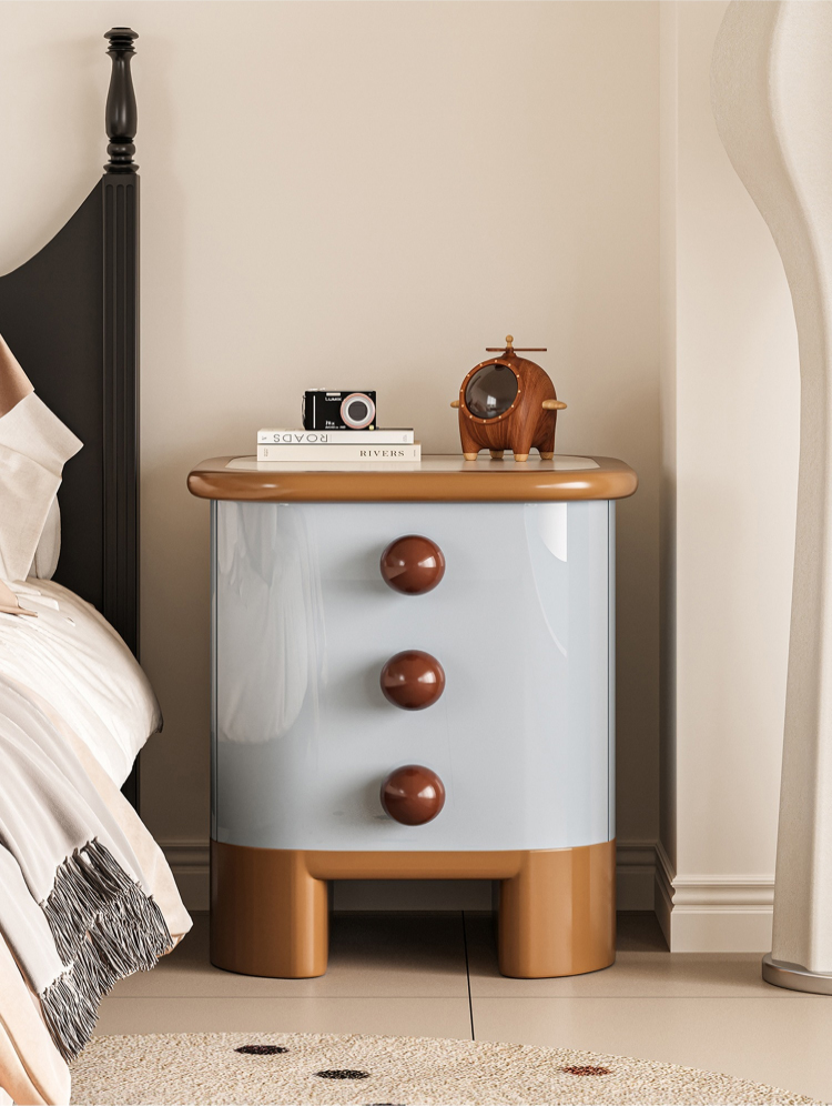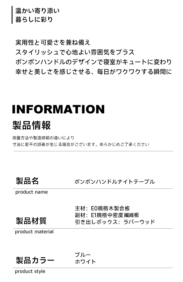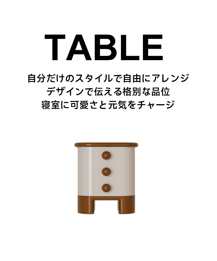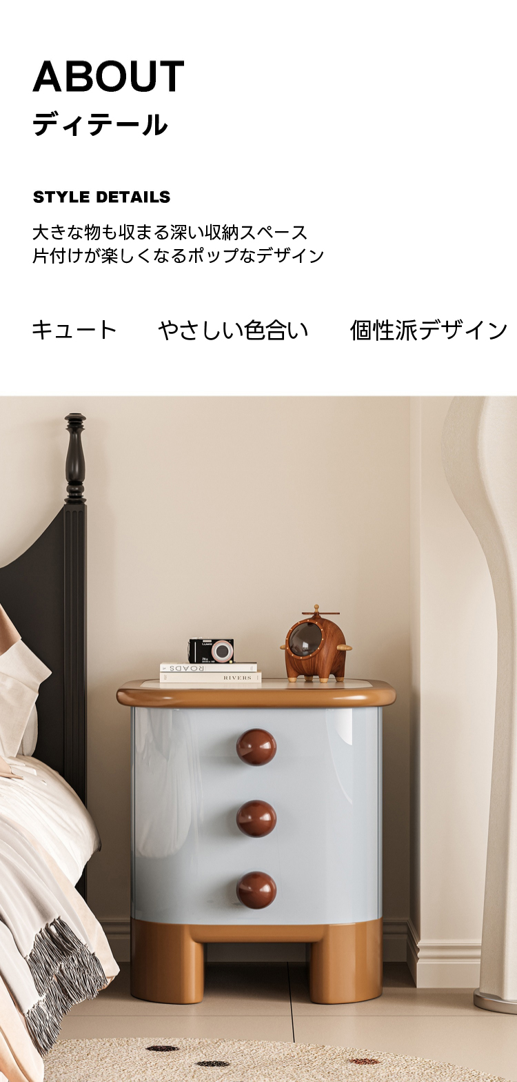 - 【丸みを帯びた形状とボンボンハンドル】:このナイトテーブルは、丸みを帯びた形状とボンボンハンドルが特徴で、可愛らしさと実用性を兼ね備えています。どんな空間にも調和し、寝室やリビングに温かみと遊び心を添えます。