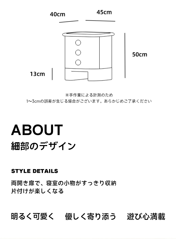 - 【コンパクトながら十分な収納スペース】:幅40cm、奥行き45cm、高さ50cmのコンパクトサイズで、限られたスペースにもぴったりフィット。収納スペースも十分にあり、日常の小物整理に便利です。