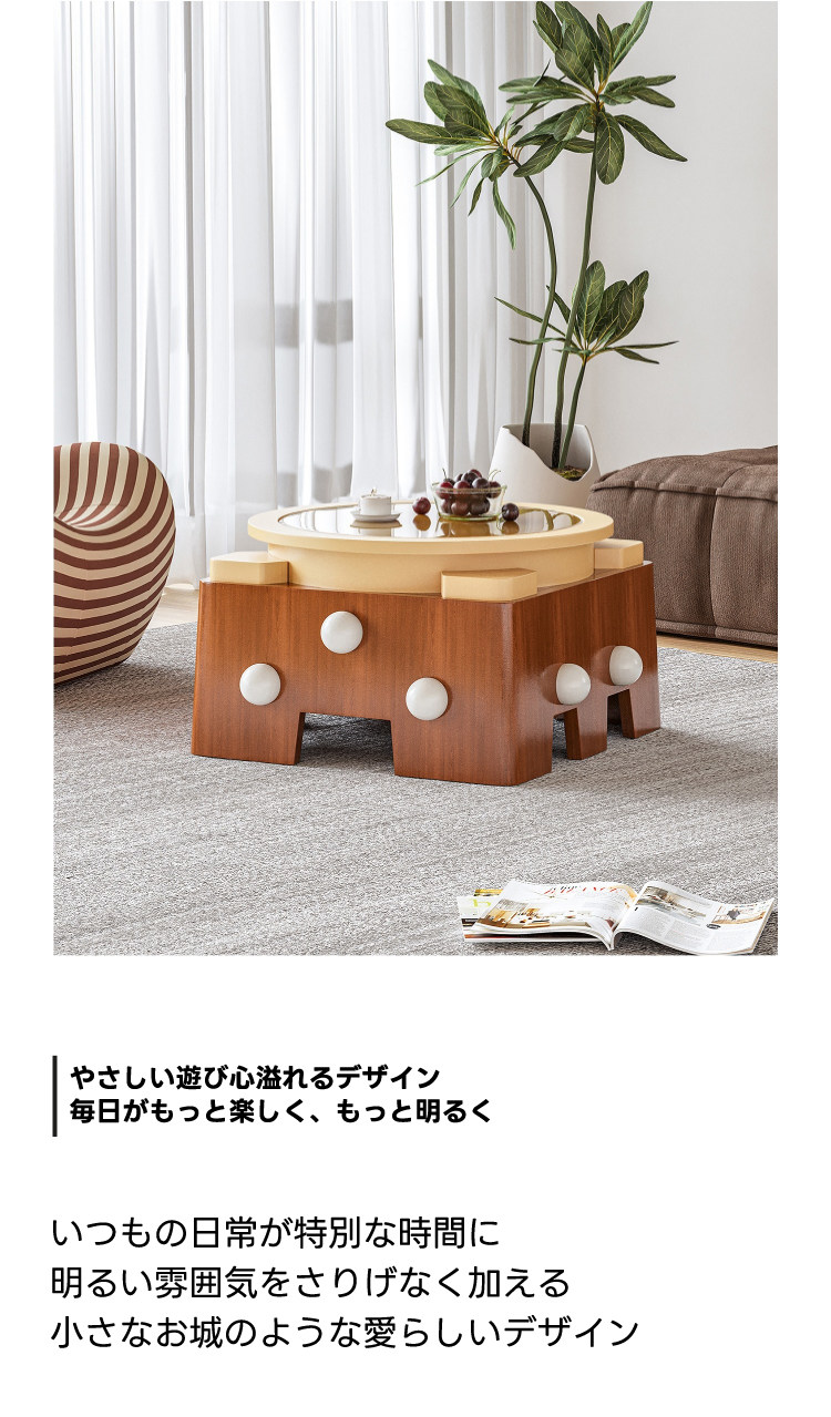 - 【ユニークなデザインと機能性】このセンターテーブルは、お城をモチーフにした不規則な形状が特徴で、空間に遊び心を加えます。リビングや寝室、ダイニングなど様々な場所でご使用いただけます。