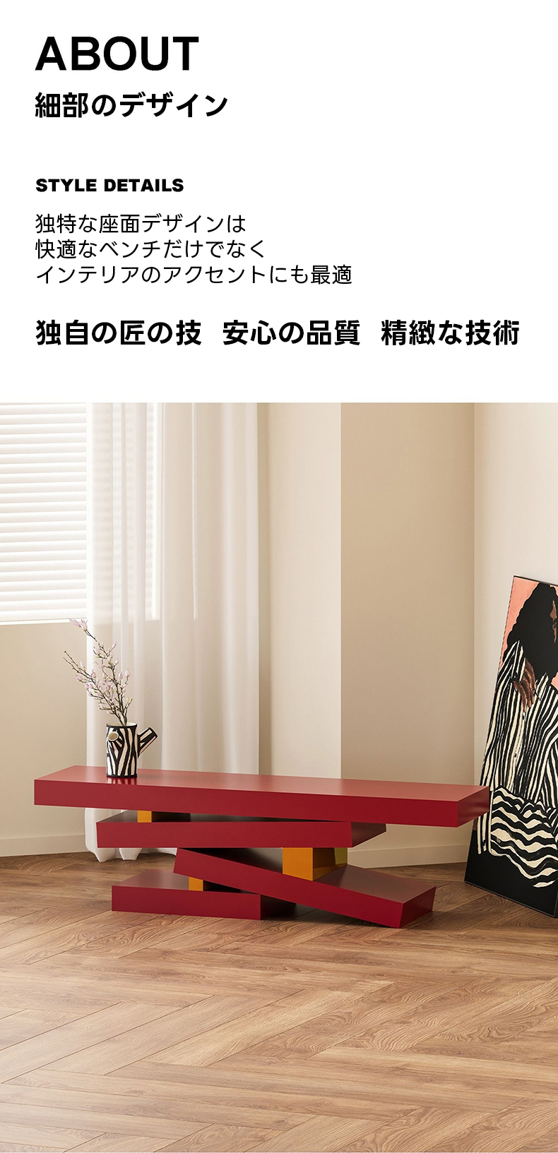 - 【ユニークなデザインと機能性】メンフィススタイル木製ベンチは、ユニークで大胆なデザインが特徴です。赤と黄色の鮮やかなコントラストが空間に活力をプラスし、リビングや寝室、玄関など様々な場所で個性を引き立てます。