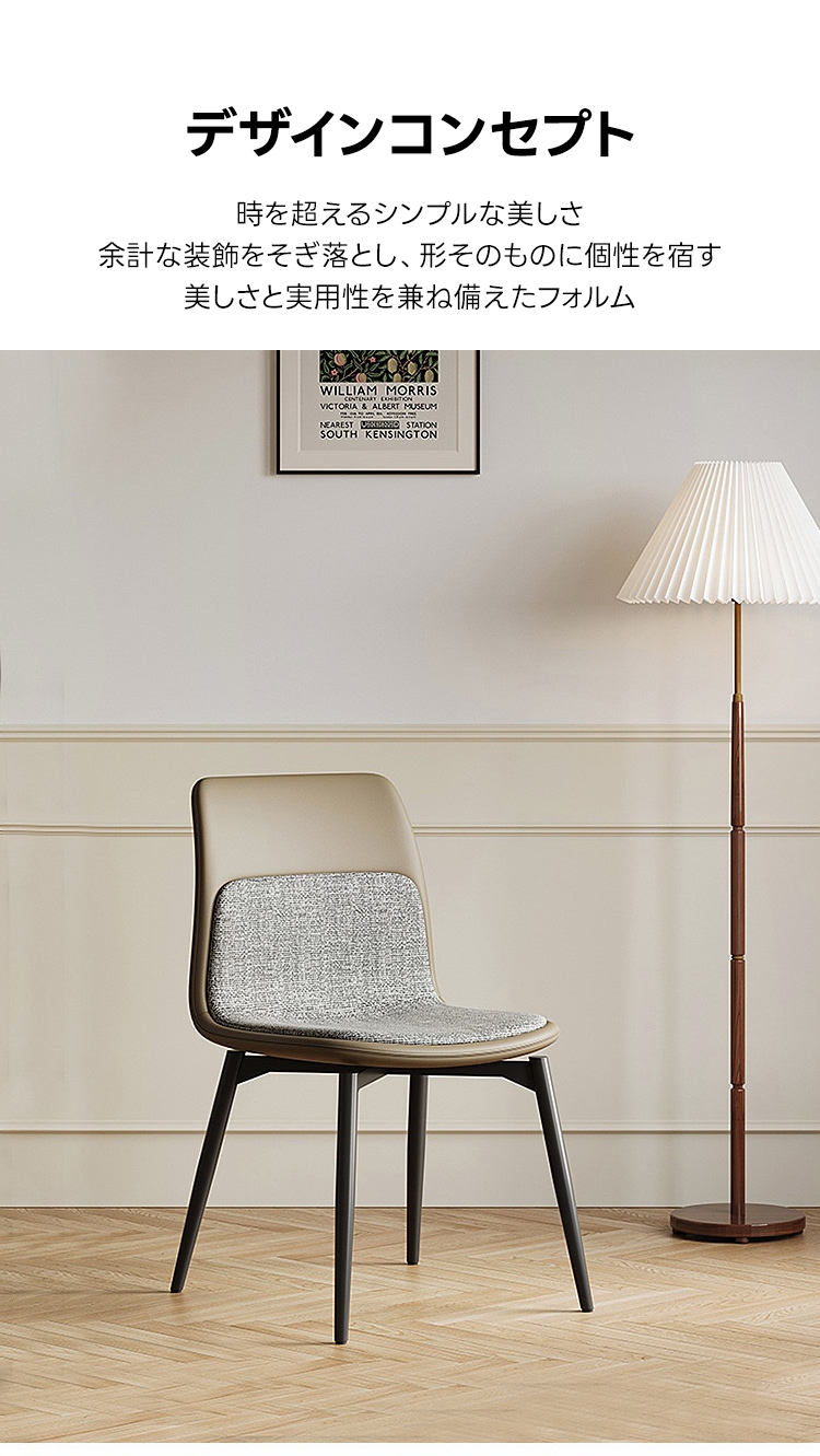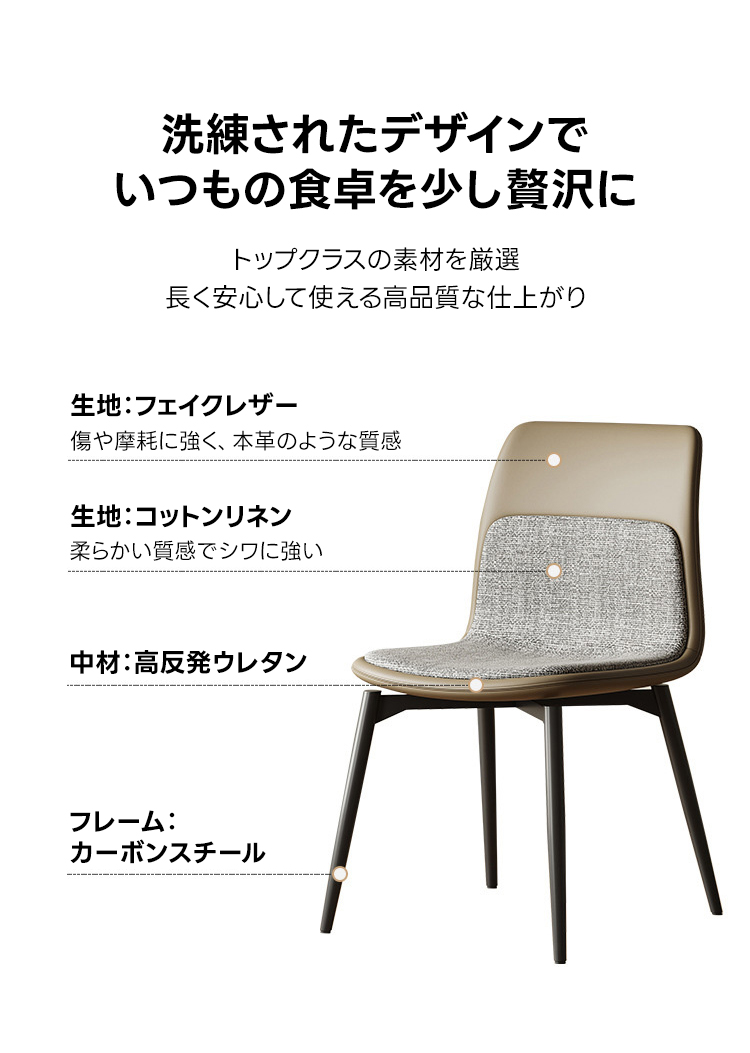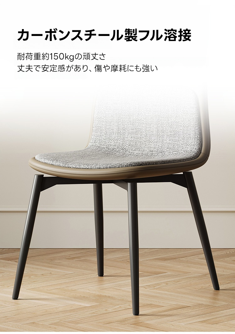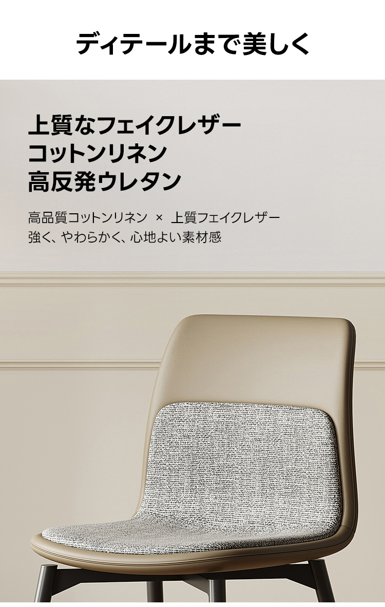 - 【多様な利用シーン】:一人暮らしやカップル、ファミリーに最適で、ダイニングチェアとしてだけでなく、レストランやサロンなどの商業施設でも活躍します。シンプルで洗練されたデザインが、空間に上品さをプラスします。