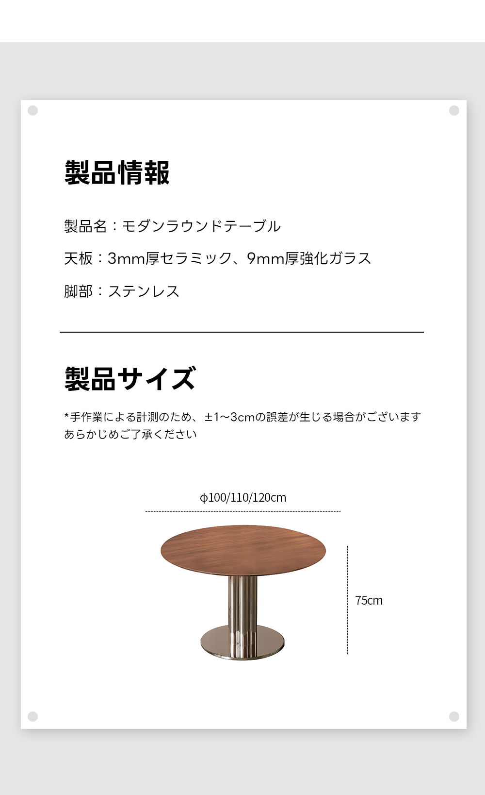 - 【多様なサイズ展開であらゆるシーンに対応】:直径100cm、110cm、120cmの3サイズから選べ、カップルやファミリーに最適です。どのサイズも高さは75cmで、快適なダイニング体験を提供します。