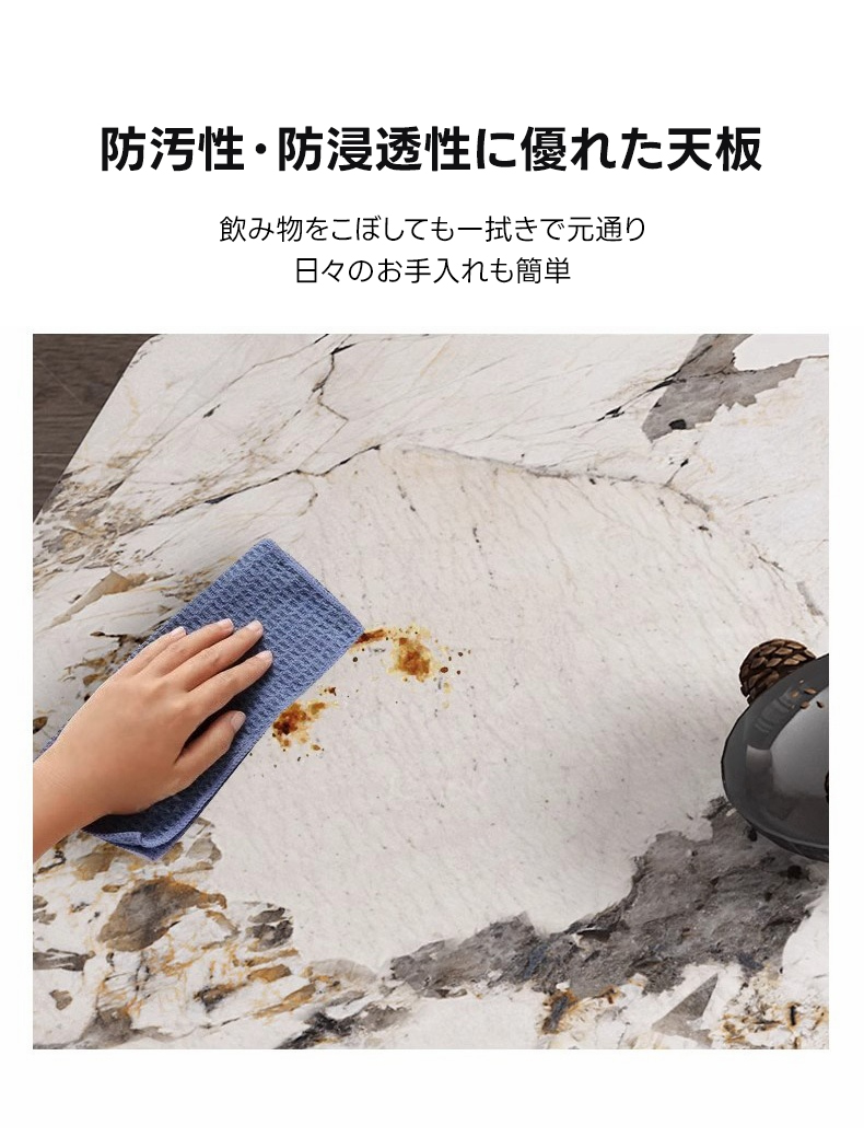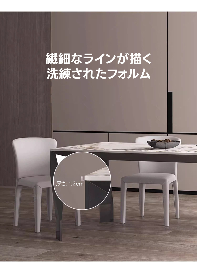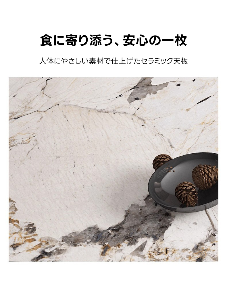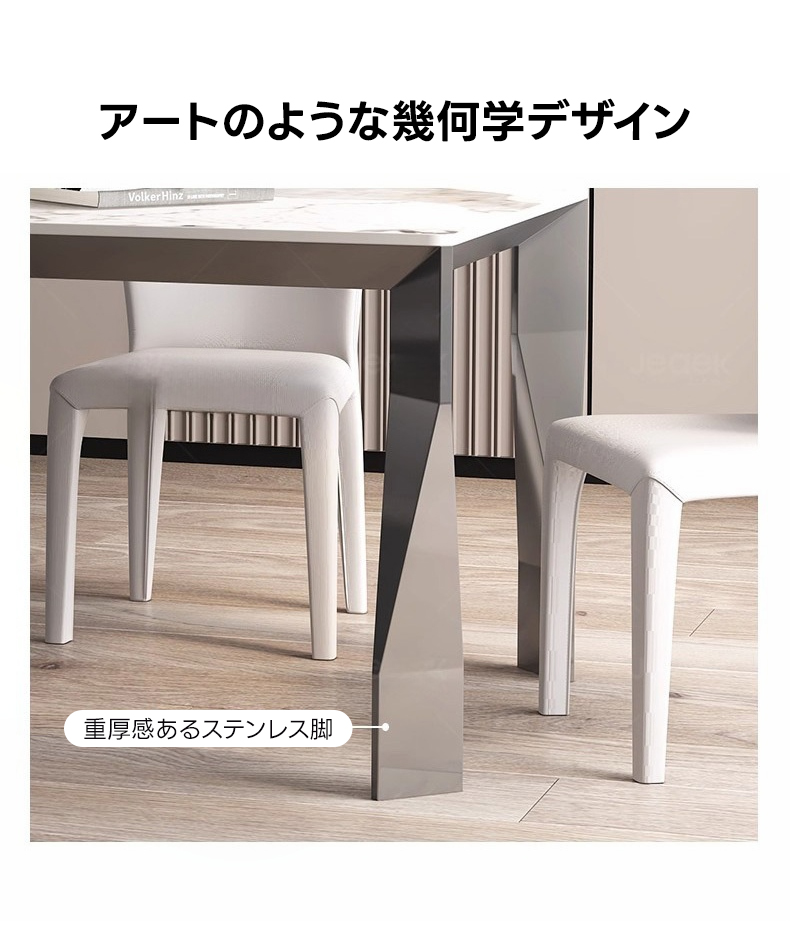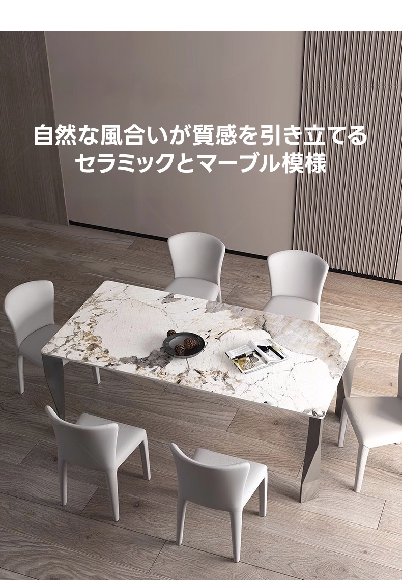 - 【高品質な素材とデザイン】:セラミック天板は自然な風合いとマーブル模様が特徴で、食卓に高級感を演出します。ステンレス製の脚が重厚感を与え、アートのような幾何学デザインが魅力的です。