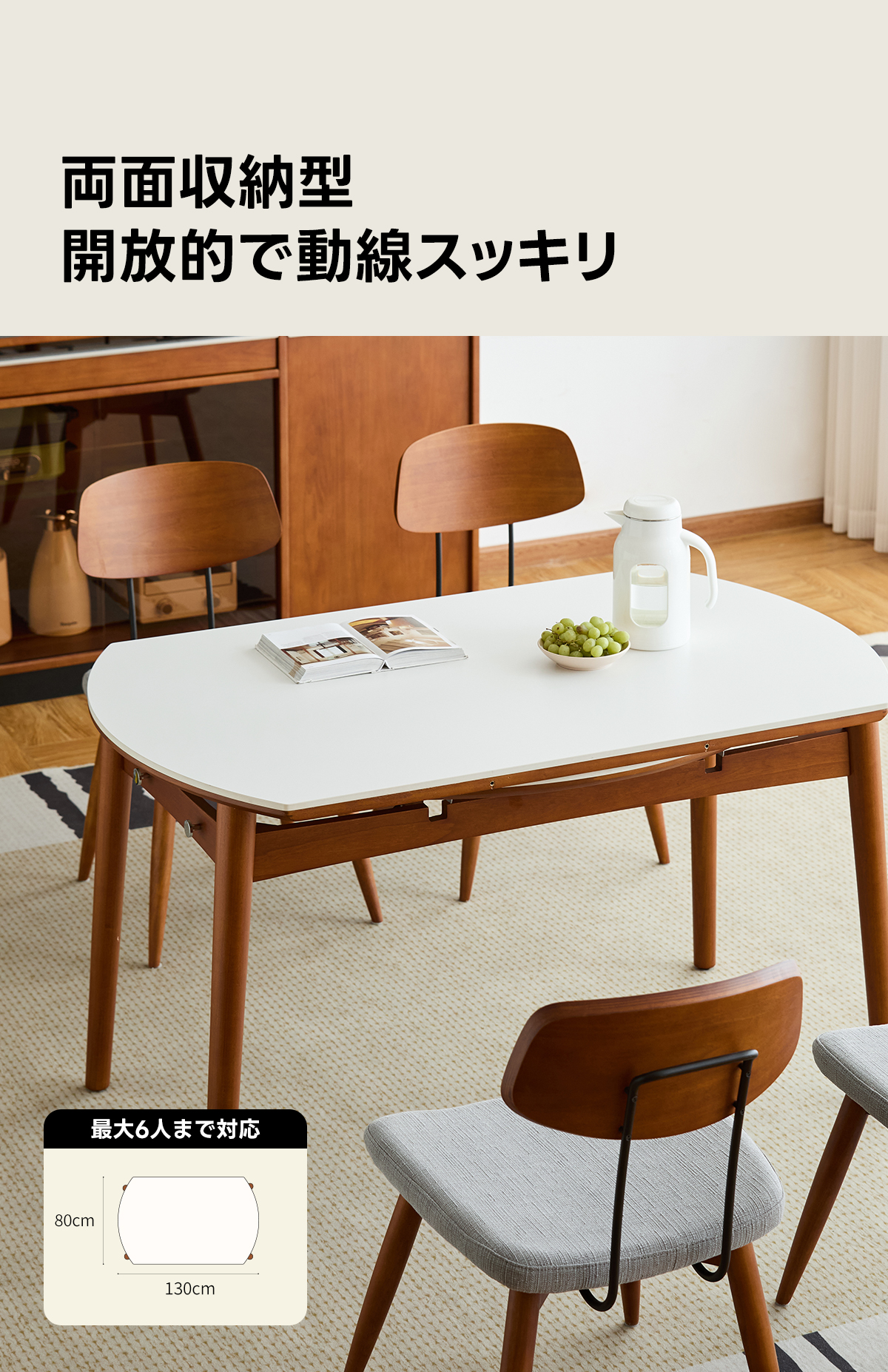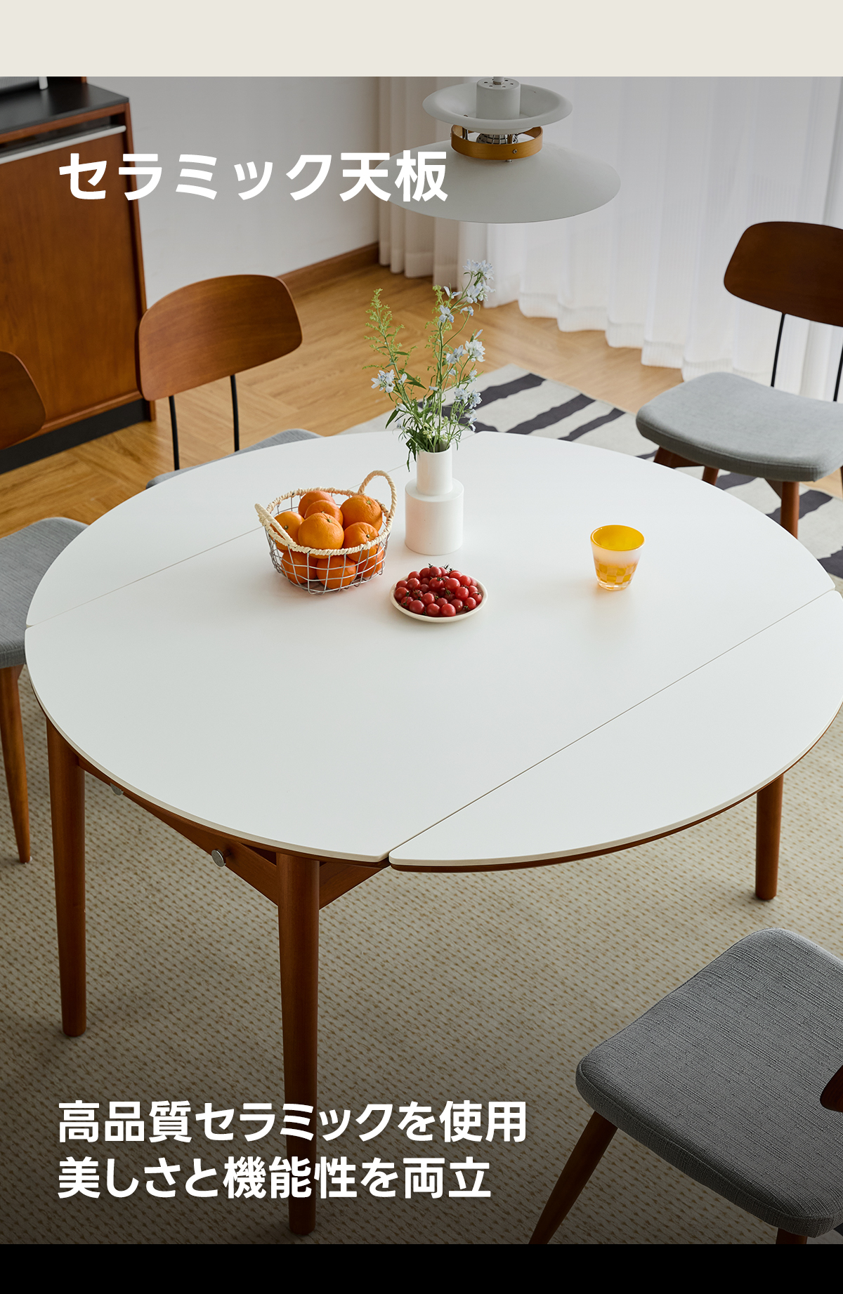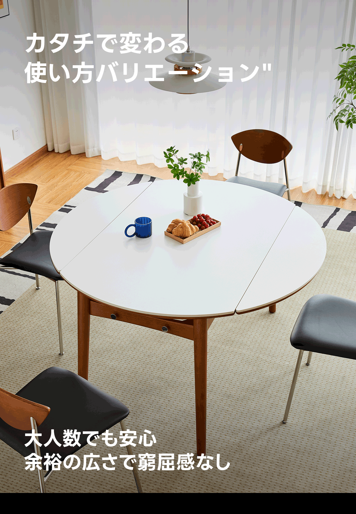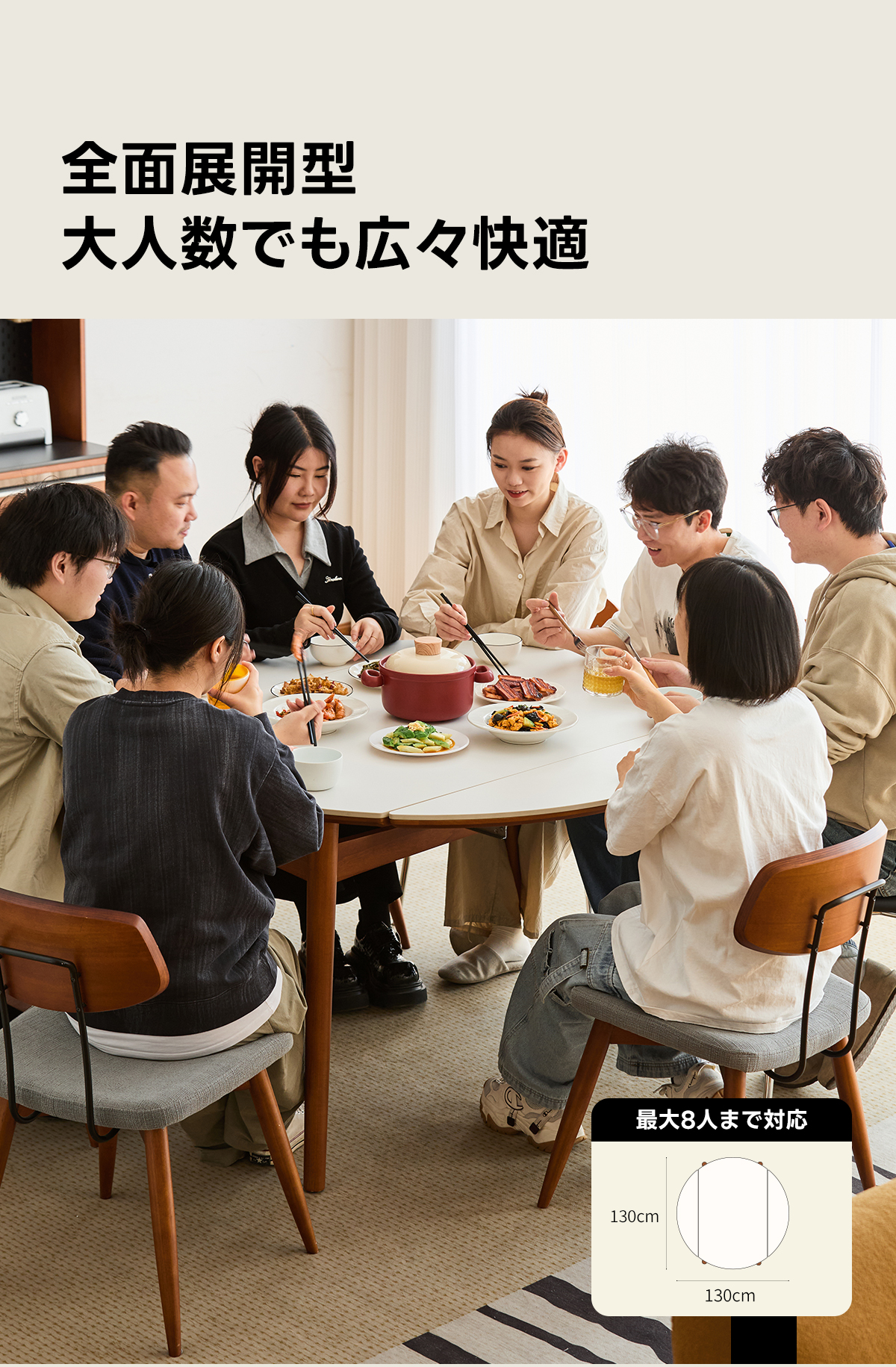- 【伸長機能で多用途に対応】:このダイニングテーブルは伸長機能を備えており、直径1.3mの円形テーブルは最大8人まで対応可能です。家族や友人との集まりに最適で、必要に応じてサイズを調整できるため、さまざまなシーンで活躍します。