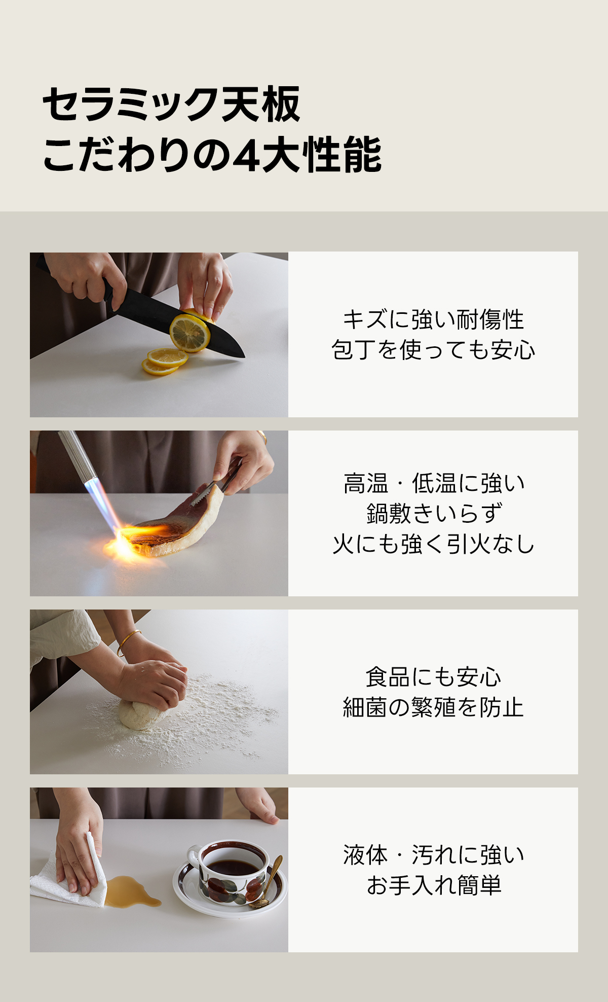 - 【安心の使用感】:セラミック天板はキズに強く、耐熱性や耐汚染性に優れています。食品の安全性も確保されており、日常の使用に安心です。多層塗装仕上げで圧倒的な耐久性と美しさを実現しています。